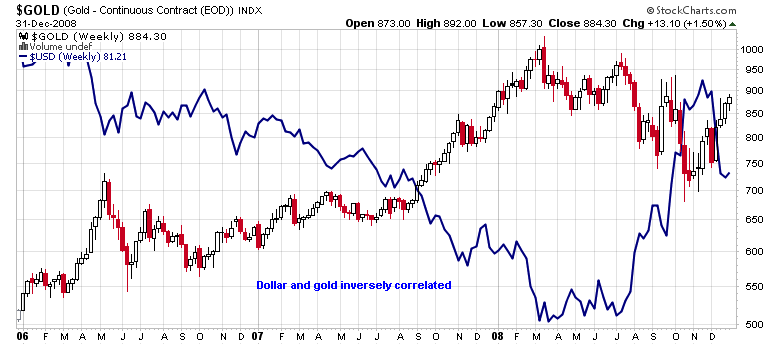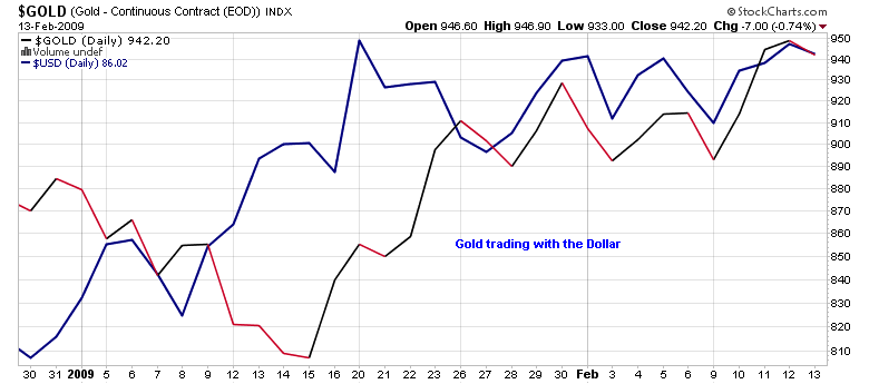 Money is gold?Parker Binion From 2006 until late 2008, gold traded opposite the U.S. dollar: (Click on images to enlarge) Many Americans naturally assumed that gold's rise or fall in dollar terms was correlated to the purchasing power of the dollar. This fit nicely with the "inflation hedge" theory of gold. Since early January, however, gold has traded with the dollar: What changed? From a "gold is money" perspective, surprisingly nothing. Closer inspection reveals that from 2006-2008 as the dollar fell, the Euro rose. Gold was quite correlated to the Euro, which was the dominant currency of the period in terms of relative strength: Since the dollar became the dominant currency, gold is now correlated to the dollar. Perhaps what is really happening is that gold is the dominant currency, and the king-of-the-hill fiat of the moment trades with gold? Feb 17, 2009 Parker Binion is a student of the markets who has successfully managed his own investments for 15 years. He currently runs a public chart blog at Stockcharts.com called the Divergence Report Disclosure: In the interest of full disclosure, the author advises that he is not a disinterested party in that he has personal investments gold and silver bullion and gold and silver mining shares. The author's objective in writing this article is to interest potential investors in this subject to the point where they are encouraged to conduct their own further diligent research. Neither the information nor the opinions expressed should be construed as a solicitation to buy or sell any stock, ETF, currency or commodity. Past performance is not necessarily indicative of future results. You may lose money trading and investing. Investors are recommended to obtain the advice of a qualified investment advisor before entering into any transactions. The author has neither been paid nor received any other inducement to write this article. |