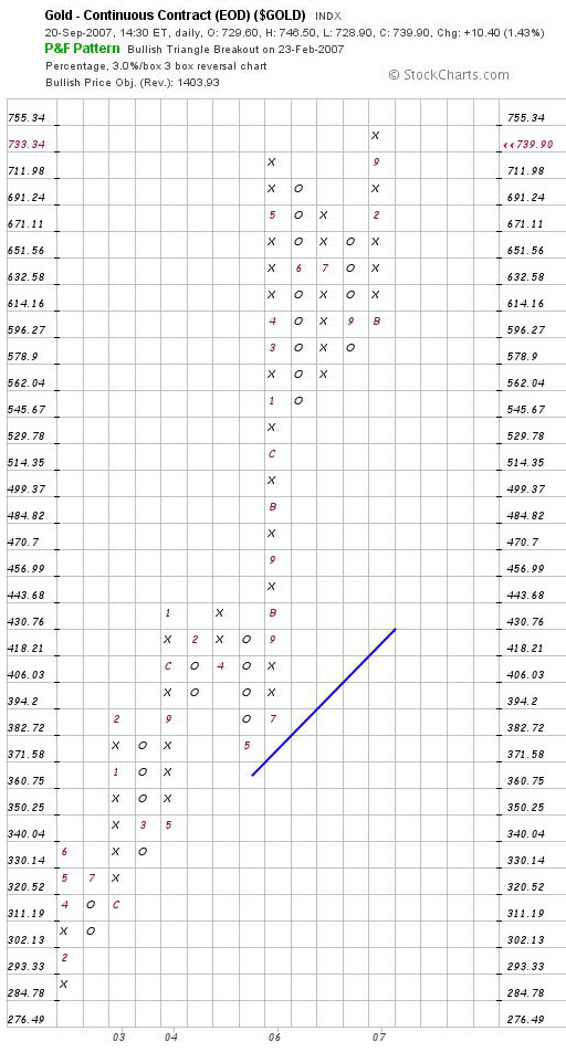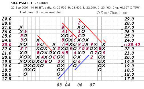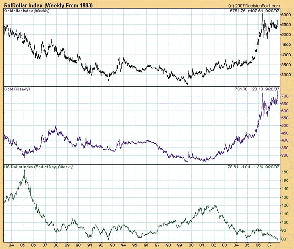 There are those who are excited about the fact that the gold price has broken up to new heights in US$ denominated terms. Typically, those people will be living within the USA. However, when you look at the gold price from the perspective of a non-US citizen, you see a chart that looks something like the goldollar chart below (courtesy decisionpoint.com) ![]() What it shows is that the golodollar [goldollar] index has not yet risen to a new high. i.e. The gold price has been rising in US Dollars primarily to compensate for the fall in the US Dollar. i.e. Gold has been rising in price to protect US citizens but not yet non US citizens. This brings us to the ratio of the Gold Share Index to the Gold Price. The chart below is courtesy of stockcharts.com This chart shows that, as at September 20th 2007, the gold shares were still in a bear trend relative to the gold price. ![]() Frankly, I am personally being guided by the chart below - which is a 3% X 3 box reversal chart of the US$ denominated gold price (courtesy stockcharts.com) ![]() Having broken to a new high, I can now believe the $1400 price target and, as a result of this believability, I have bought back into some gold shares. The "cost" to me of doing this was a loss of 7% profit, including brokerage. Having said this, now let's look at the downside again. If the Gold Price in US$ doubles, and the US Dollar Index halves, it is likely that I will have made a mistake - because the costs of operating a gold mine (in the USA) will rise in proportion to the price the mine receives. i.e. Profits will not rise in proportion to the rise in the gold price. What seems more likely to happen, though, flows from the discussion on the pricing of Beyond Neanderthal. At a price of US$30 a copy I am likely to sell fewer copies within the USA than if I charged US$25. Indeed, the volume of gold sales might even fall - because (for example) Indians may buy less gold to celebrate their weddings if they are selling fewer services to the USA. Take the argument across the entirety of the world economy and, what we seem to be facing is the threat of a world-wide recession as the volume of commercial transactions by foreigners with the USA shrinks. Conclusion The decision by the US Fed to reduce its bank lending rate - ostensibly to counteract a reduction in the producer price index - was probably a seminal development in the history of the world's economy. If the end result is that this rate reduction gives rise to a continuing fall of the US Dollar index, then inflation within the USA will likely rise strongly, and volumes of transactions will likely fall. Paradoxically, the cut in interest rates seems likely to have the opposite effect of its stated intent. It seems more likely to give rise to an acceleration of the arrival of recessionary conditions - having bought sufficient time to allow maintenance of the status quo until after the US Presidential Elections. Sadly, we are living in an extraordinarily cynical world where the parochial interests of the few now patently transcend the interests of the many. Brian Bloom