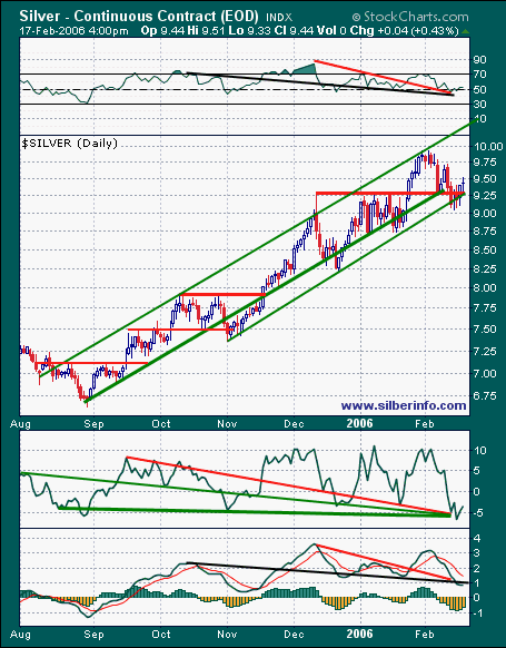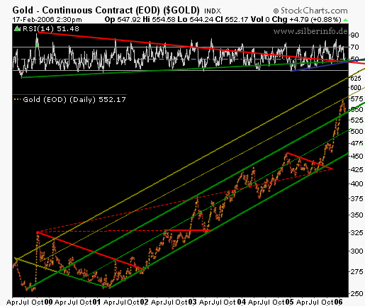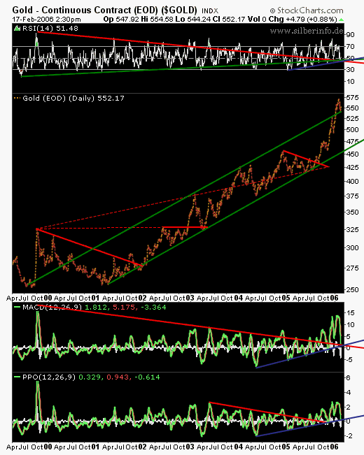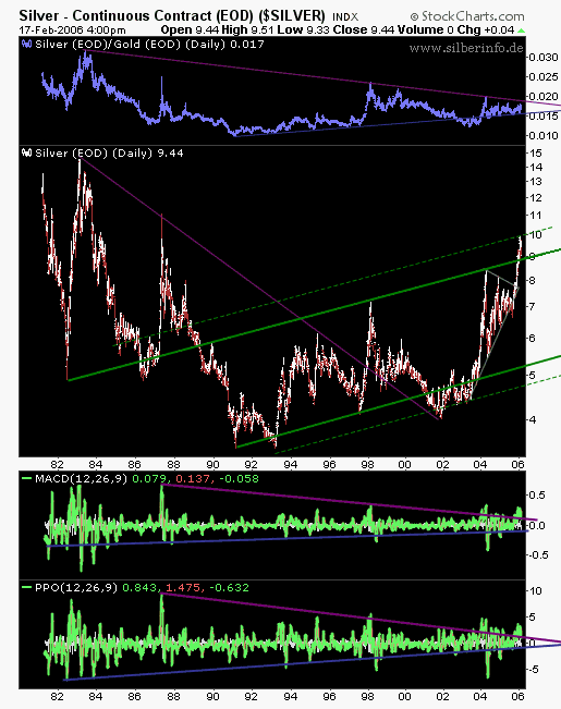 Gold & Silver: Explosion ahead!Stephan Bogner When the gold price hit his all-time-low of $252,50 on 25. August 1999, the price jumped explosively on the 20. September from $254,50 to $327,50 on the 5th of October. Many saw the 20-year bearmarket of the gold price as being finished, however, the price went into a down-trend for another 20 months. On the 20. February and 1. April 2001the gold price marked a double bottom at $255, whereafter the new up-trend began. This new up-trend was running on the lower trendline (green) being the last support-zone for the gold price and only was breached slightly at the end of 2001 when the first red resistance interesected with this (green) trendline. About $100 above this important trendline was a similar dominant trendlinie runnung that was touched as resistance 4 times in the first 4 years. This upper (green) trendline deviates itself from Augist 1999 when the gold price hit its all-time-high. It is an extremely bullish or bearish signal if such a yearlong trend channel is being broken significantly. ![]() In the first days of the new year 2006, the gold price succeeded in sicnificantly breaking the upper trendline when the price broke above $530 to $575,30. A few days ago, the gold price corrected sharply to $535,10 - and therefore exactly to this trendline. Such a "pullback" to a formerly strong resistance trendline is normal and even "healthy" as a transformation from resistance to support is thathow being testet, confirmed and completed. In the following days the gold price started rising self-confident again to $552 at the very moment. The indicators RSI and MACD have just landed of an intersection of various trendlines and therefore are situated (same as the price oscillator PPO) on supporting levels. Therefore we come to the conclusion that a strong price acceleration period will start immediately. Now, as the trend channel along with his limiting trams is not active anymore, the question is, where the new travel destination of the gold price is. If one takes the above chart and further puts in a few more rightly positioned parallels, one receives the below chart that is answering the latter question for the next weeks. ![]() Silver is being analized lusty from many sides only in comparison with the gold price as the price movements of silver are dependent of the ones from gold; in other words: both currencies are perfectly positive correlated. And indeed, if one takes a look at the below silver price since 1980 one can see that the silver price is rising as well within a trend channel which was broken to the upside recently and just undertook a pullback to the formely strong resistance line. However, one difference is that this upward trend channel began 1991 - exactly 10 years before gold. ![]() The indicators MACD and PPO are showing that a breakout above the formerly strong resistance lines occured recently and that the pullback to this new support line seems to hold. A positive price acceleration now may start. As soon as the $10 mark is being conquered hand in hand with the dotted-trendline (green), we are expecting a strong and explosive price boom. On the upper part of the above chart one can see the silver price relative to the gold price; also known as the silver-gold-ratio. This shows a massive triangular price formation which limiting trendlines are approaching themselves more and more. Typically, a price breaks out after _ of the total length of the triangle. A breakout can therefore occur anytime now, whereafter the explosive or crash-like "Thrust" begins (consequence of a triangle). The question is therefore, if the "Thrust" will go to the up- or downside - if silver rises stronger than gold or the opposite. The next chart, the silver-gold.ratio since 2003, may answer the last question. One can see clearly how volatile silver moves relative to gold what phenomenon is being argumented with that silver sometimes can rise stronger than gold but that the corrections can be stronger as well. However, the bottom line is then in many places that in the long-haul these ups and downs are being compensated again and can be seen on the below chart with a first glance: namely that both are running "sideways". If one takes a second glance at the silver price relative to gold, this sideways movement can also be seen as a triangular price formation. The consequence of such a price formation ("Thrust") becomes however a surprise for all those that labeled the price movements within the boundaries of the triangle solely as a "sideways movement" and became accustomized to that. ![]() At the end of 2005, the ratio succeeded to break the upper red triangle resistance line. A few days ago, the ratio undertook a sharp pullback to the apex of the triangle whereafter the Thrust follows. This Thrust already started to drive to the upside what make us optimistic that this Thrust will become (more) noticeable soon as the minimum target of a to the upside thrusting price is to transform the highest point of the triangle into a support to be able to start a new and sustainable uptrend. The already started Thrust has not been noticed yet as the relative price is still moving within the green and violet trendlines and therefore slightly to the upside. However, as soon as the violet resistance is being breached and transformed into a support, an explosive and therefore noticeable jump to the upside may begin which we see going first to the grey resistance line. The indicator RSI recently just landed on the green support line and already began to drive to the upside what makes us bullish that a strong rise is near. The price oscillator PPO doesn't have much more place between the black and red trendlines and we expect a breakout anytime now which we see exploding to the upside meaning that the silver price accelerates much faster than gold. Eventhough we are extremely bullish for the price of gold at the moment, we favorize silver, because we think that not 