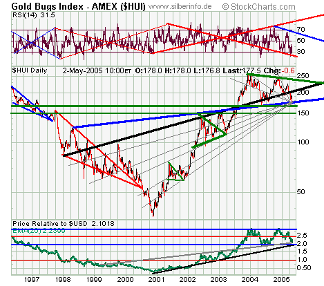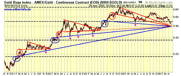 In regard to the above chart, the HUI relative to the price of gold is near or at its "perfect" bottom at the moment. If this support holds, then the 4th boom since the new millennium will begin, which shall be outshining the previous ones by large as the current 9-month "final movement" (breakout and pullback to the apex beginning in the 9th month of 2003) must have washed-out the last "weak hands" and finally have cleaned the market of prior excess driven spectators/speculators. "9 is the last figure. It symbolizes outcome. In 9, you harvest what you have sewn previously. It's positive aspects are idealism, humanism, with openness on the world (tolerance, new way of life or of thinking) but it can also have moments of inner tension, jolts, breaks, the price to pay after all the previous bad actions. The 9th month of pregnancy will end gestation and announce the birth of a child." (2). Generally, there is "a lot" to catch up to. A rise of the HUI relative to the gold price from its current level of 0.40 to more than 0.60 is probable as the next boom would have to mark a new "black-dotted-zone" which in regard to the logarithmic chart might be the "psychological" 1,0 hurdle. If this resistance will be touched in the next move up, then the HUI is outperforming the gold price by 150%. In the beginning of 2002, the HUI rose from approx. 0.25 to 0.45 relative to the gold price. An outperformance of 80%. The HUI itself rose from 60 to 150 points - A rise of 150% in only 2 months. In the middle of 2003, the HUI rose from approx. 0.40 to 0.65 relative to the gold price. An outperformance of 63%. The HUI itself rose from 110 to 250 points - A rise of 127% in only 2 months. Correlation Test: If 80% equals 150%, then as per "the