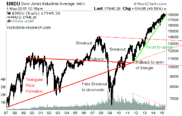 Above chart (15 min. delayed): http://schrts.co/NWghQ5 Between 1997-2011, the DOW moved sideways respectively consolidated within the limiting legs of the (red) triangle. At the end of the triangle, approximately 3/4 before the triangle's apex, the price typically starts a so-called breakout, whereas classically a so-called pullback to the former resistance follows in order to test and potentially confirm it as new support (in order for a new and sustainable upward trend to start thereafter).