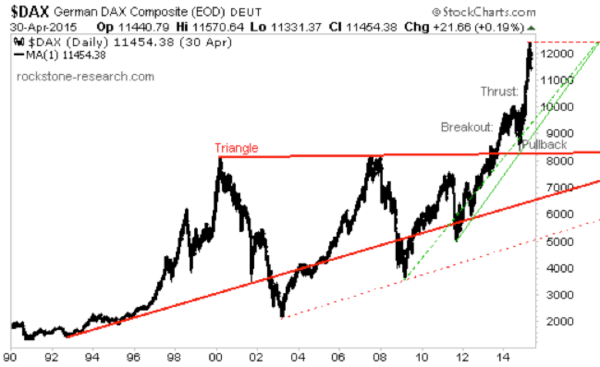 Above chart (15 min. delayed): http://schrts.co/Xipboh The German DAX looks healthier than its US peers, because the price is definitely thrusting to the upside after the completion of a successful breakout and pullback. However, the end of the thrust may be ending shortly, whereas short but sharp pullbacks during thrusts are also not uncommon. A more definite sell signal is generated only when breaching the green and red supports: