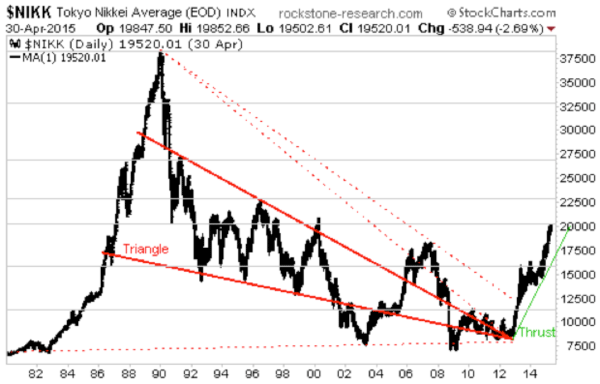 Above chart (15 min. delayed): http://schrts.co/lRMX7q For around 20 years, the NIKKEI index consolidated within a downward sloping (red) triangle, out of which a thrust started in 2013 (after multiple breakouts and pullbacks). The goal of this thrust is to rise above the former highs (30,000-37,500 points), whereas short but sharp pullbacks during thrusts should not surprise but to be considered healthy. As the psychologically important 20,000 level has been reached most recently, a new buy signal is only given when rising above this resistance; thus an inferior (short- to mid-term) sell signal dominates at the very moment. The probabilities of a breather/correction at least to the (green) support at around 17,500 points are pervasive as long as the 20,000 level has not been conquered.