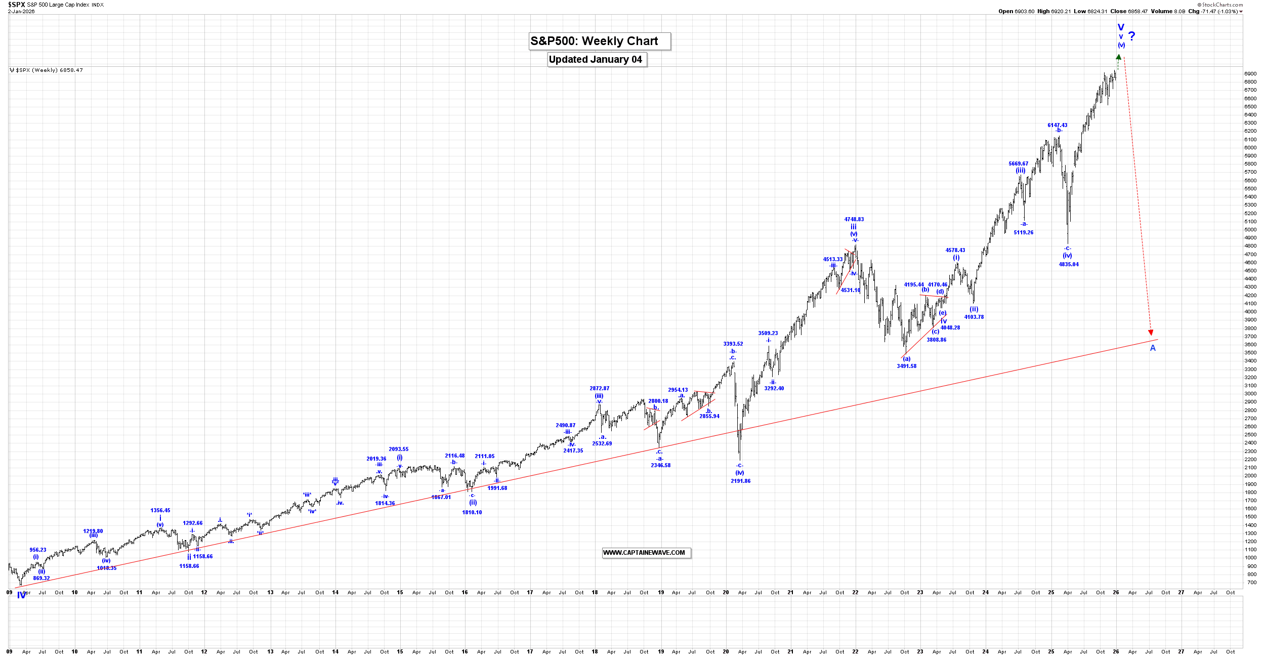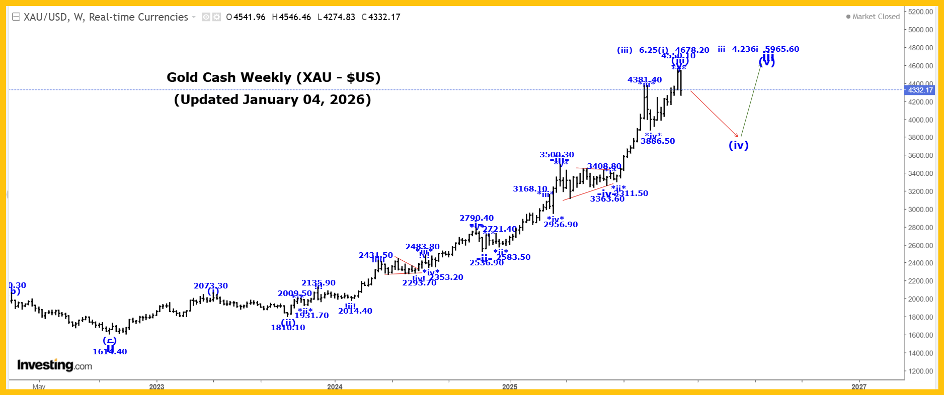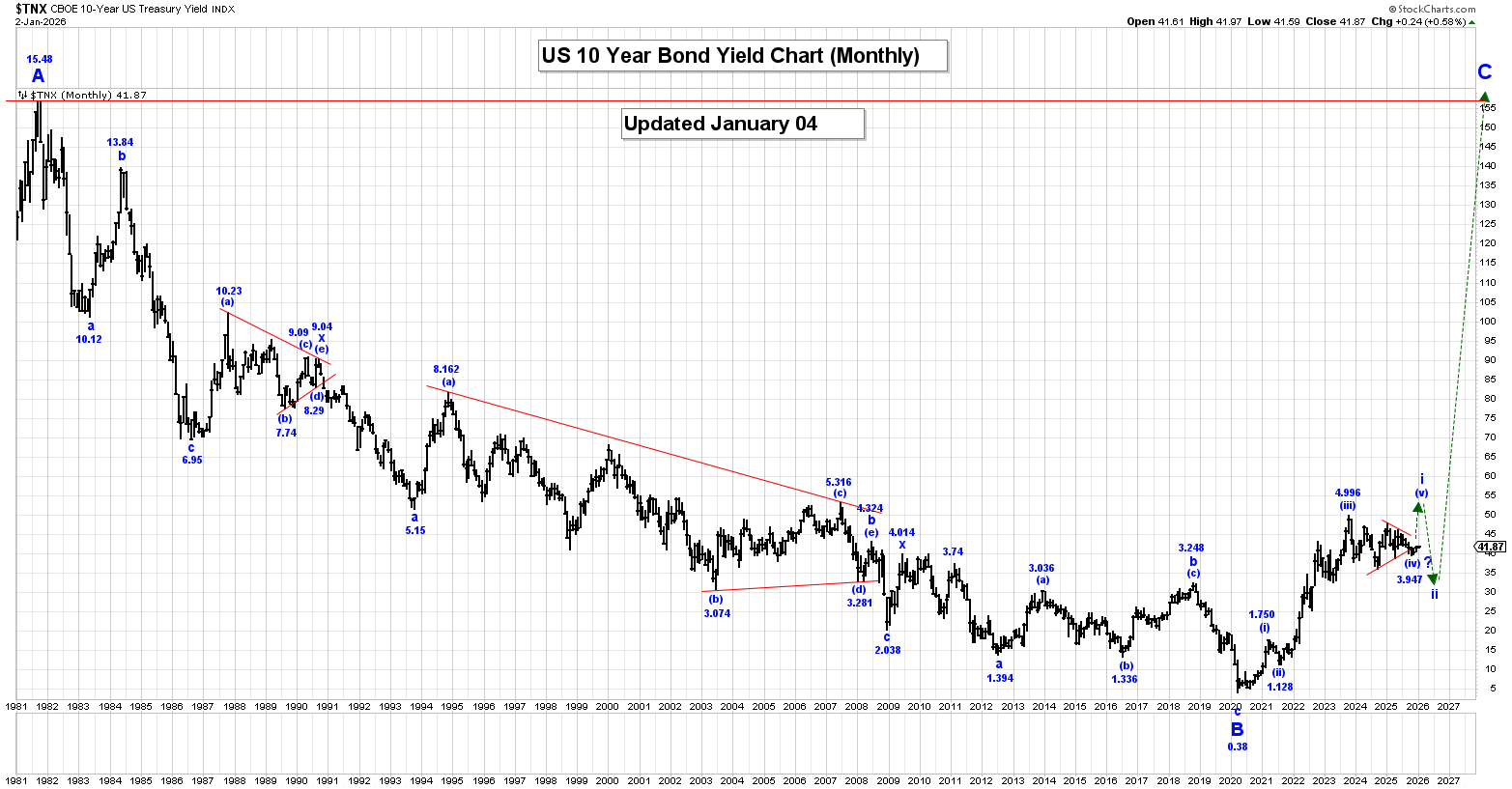 Rates, Stk Mkt & Gold: Key Wave Countscaptainewave Jan 4, 2026 Ten Year Rates: Please click this link to view the Captain’s monthly US 10year rates chart. Double-click to enlarge it. Analysis: The 10 Year US Bond Yield was higher this past week reaching a high of 4.197%, closing at 4.187%. Within a multi-year wave C, we are rallying in wave i, still underway. Within wave i, we completed wave (i) at 1.266%, wave (ii) at 0.504%, wave (iii) at 4.997% and our large wave (iv) bullish triangle at the 3.947% low. We are starting to thrust higher in wave (v) to complete all of wave i and therefore expect higher yields in the days and weeks ahead. After wave i ends we expect a wave ii, correction that retraces between 50 to 61.8% of the entire wave i rally. On our Long-Term Monthly Chart all of wave A ended at the 15.83 high in 1981 and since that high was made, we have fallen in a triple 3 wave correction within wave B that ended at the 0.38% level. We have started to rally higher in a multi-year wave C rally that will eventually see rates reach at least the 15.83 high again. Active Positions: Long, risking to 3.880%. Special Subscription Offer: At $99/mth the Captain Ewave newsletter value is superb, and we have a special offer this week of just $199 for a three-month subscription! Investors get six updates a week from the Captain AND his key signals for the market… when he issues and acts on them himself! Send us an email at admin@captainewave.com or click this link and we’ll get you on board! Thank-you! Please click this link to view the Captain’s weekly SP500 chart. Double-click to enlarge it. Long Term Update: The SP500 was sharply lower past week reaching a low of 6824.31, closing at 6858.47. Within v of V, wave (iv) ended at 4835.04 and we are moving higher in wave (v), which has the following updated internal wave count: .i. = 5381.55. The internal wave structure of this market is suggesting that wave .v. is still underway, so we expect to see the SP500 continue to move higher in Q1, 2026, after which we should turn sharply lower in the start of a multi-year wave A corrective pattern. Active Positions: Flat. Please click this link to view the Captain’s weekly gold chart. Double-click to enlarge it. Analysis: Long Term Update: Gold was higher again this past week reaching a high of 4550.10, closing at 4534.50. Our current long-term gold count starting from the 35.20 low: 1 = 1920.80. Our last projection point for the end wave (iii) is: (iii) = 6.25(i) = 4678.20. We are still a bit short of our next projected endpoint for wave (iii), but we cannot rule the possibility that it is now complete at the 4550.10 high. After wave (iii) ends we expect a wave (iv) correction that retraces between 23.6 top 38.2% of the entire wave (iii) rally. A projection for the end of wave iii is: iii = 4.236i = 5965.60. Projections for the end of wave 3 are: 3 = 2.618(1) = 5936.00. Active Positions: Flat! Free Offer For 321Gold Readers: Please send me an Email to admin@captainewave.com and I’ll send you our free “GDX: Moonshot Or Pain?” report. I highlight key buy zones, wave counts, and targets for this truly fantastic ETF! Thank-you! Risk: captainewave.com is an impersonal advisory service and, therefore, no consideration can or is made toward your financial circumstances. All material presented within captainewave.com is not to be regarded as investment advice, but for general informational purposes only. Trading stocks does involve risk, so caution must always be utilized. We cannot guarantee profits or freedom from loss. You assume the entire cost and risk of any trading you choose to undertake. You also agree to bear complete responsibility for your investment research and decisions and acknowledge that captainewave.com has not and will not make any specific recommendations or give advice to you or any of its clients upon which they should rely. captainewave.com suggests that the client/member test all information and trading methodologies provided at our site through paper trading or some other form of testing. captainewave.com, its owners, or its representatives are not registered as securities broker-dealers or investment advisors either with the U.S. securities and exchange commission or with any state securities regulatory authority. We recommend consulting with a registered investment advisor, broker-dealer, and/or financial advisor. If you choose to invest with or without seeking advice from such an advisor or entity, then any consequences resulting from your investments are your sole responsibility. All information posted is believed to come from reliable sources. captainewave.com does not warrant the accuracy, correctness, or completeness of information available from its service and, therefore, will not be liable for any loss incurred. Due to the electronic nature of the internet, the captainewave.com website, its e-mail & distribution services and any other such "alerts" could fail at any given time. captainewave.com will not be responsible for unavailability of use of its website, nor undelivered e-mails, or "alerts" due to internet bandwidth problems, equipment failure, or acts of god. captainewave.com does not warrant that the transmission of e-mails, or any "alert" will be uninterrupted or error-free. captainewave.com will not be liable for the acts or omissions of any third party with regards to captainewave.com delay or non-delivery of the captainewave.com nightly emails or "alerts". Further, we do not receive any form of payment or other compensation for publishing information, news, research or any other material concerning any securities on our site or publish any information on our site that is intended to affect or influence the value of securities. There is no guarantee past performance will be indicative of future results. No assurance can be given that the recommendations of captainewave.com will be profitable or will not be subject to losses. All clients should und