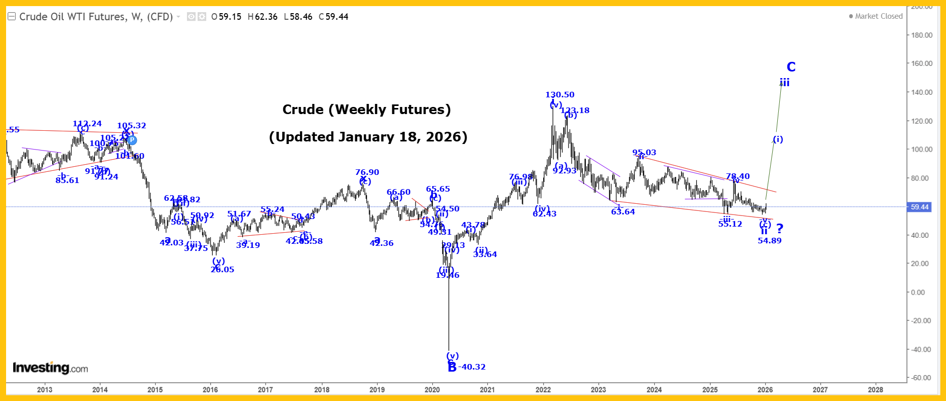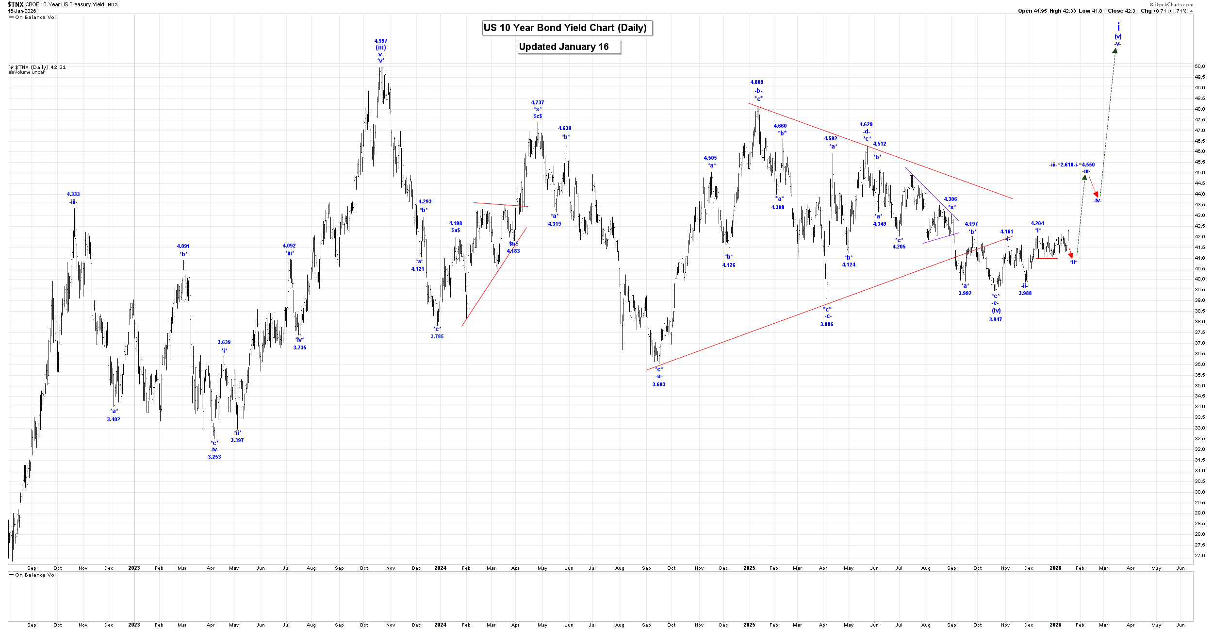 Rates, Oil & Gold: Key Wave Countscaptainewave Jan 18, 2026 US 10 Year Bond Yield: Please click this link to view the Captain’s short-term 10yr rates chart. We have an upside breakout, as of Friday’s close! Analysis: Wave i is still underway, as shown on our Daily Chart. Within wave i, we completed wave (i) at 1.266%, wave (ii) at 0.504, wave (iii) at 4.997% and it is now looking like we are still falling in a more complex wave -e- of (iv), which we are now assuming is complete at the 3.947% low. We should now be starting to rally higher in wave (v) and within wave (v) we are moving higher in wave -i-. Within wave -i-, we likely completed wave *i* at 4.161% and all of wave *ii* at 3.988%. If that is the case we are now moving higher in wave *iii*, which has an initial projected endpoint: *iii* = 1.618*i* = 4.330% Our projections for the end of wave (v) are: (v) = 4.997. Trading Recommendation: Long risking to 3.880%. Special Subscription Offer: At $99/mth the Captain Ewave newsletter value is superb, and we have a special offer this week of just $199 for a three-month subscription! Investors get six updates a week from the Captain AND his key signals for the market… when he issues and acts on them himself! Send us an email at admin@captainewave.com or click this link and we’ll get you on board! Thank-you! Please click this link to view the Captain’s weekly crude oil chart. Double-click to enlarge it. Analysis: Long Term Update: Crude was higher again this past week reaching a high of 62.36, closing at 59.44. Our internal wave count for wave ii to looks like: (a) = 92.93. We have now completed the minimum requirement for an end of our wave -v- ending diagonal triangle formation at the 54.89 low, although only a break of the upper red trendline connecting 95.03 and 78.40 will confirm this to be the case. After wave ii ends we expect a very sharp rally higher in wave iii, and we will provide our projected endpoint for its completion after wave ii ends. In the long term we are now rallying in wave C that has the following projections: C = A = 153.77.