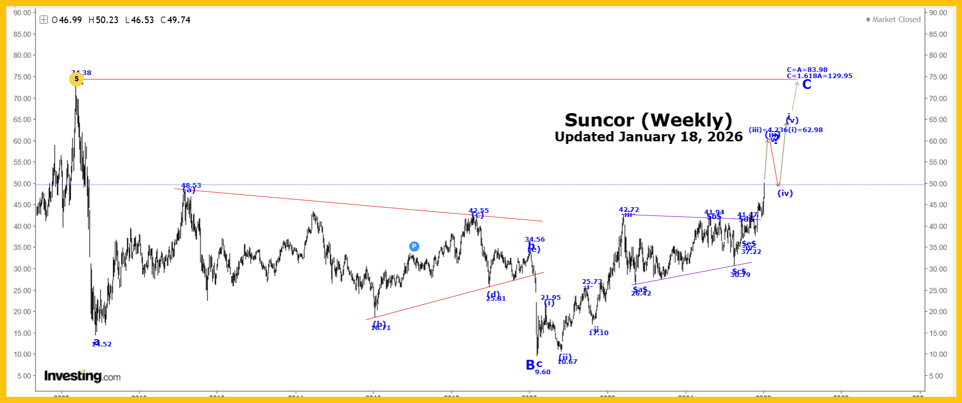 Please click this link to view the Captain’s weekly Suncor chart. Double-click to enlarge it. Long Term Update: Suncor was higher again this past week reaching a high of 50.23, closing at 49.74! Wave (iii) is still underway and moving higher to next projected endpoint of: (iii) = 4.236(i) = 62.98. We expect higher prices as wave -v- of (iii) continues to develop. Active Positions: Long crude, with puts as a stop. Long Suncor!