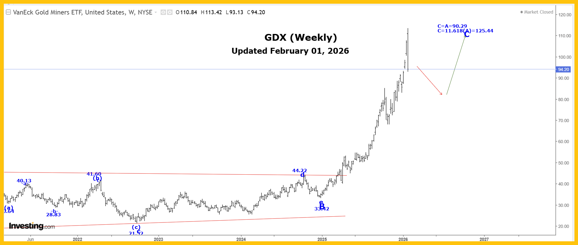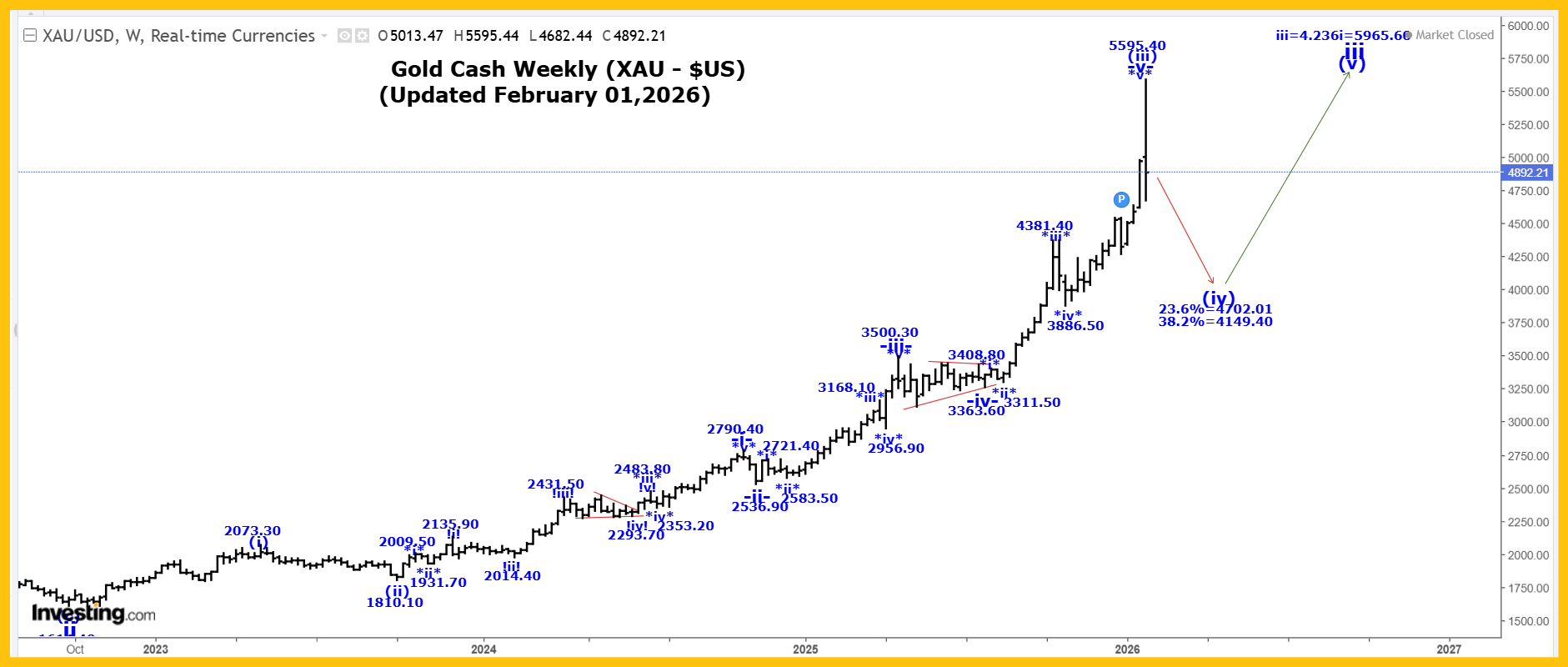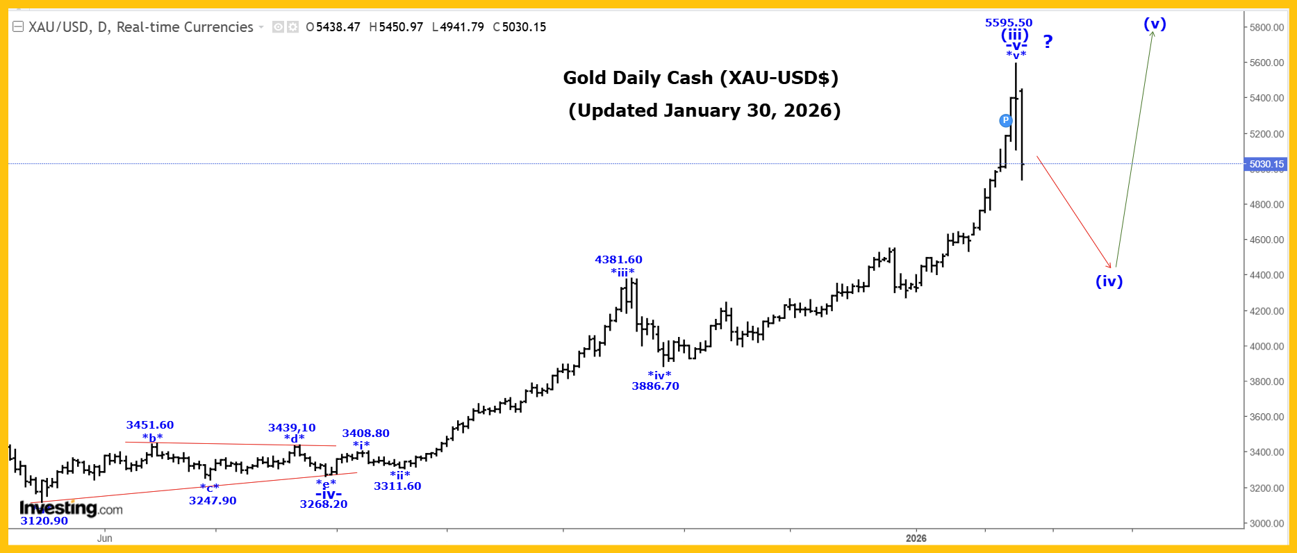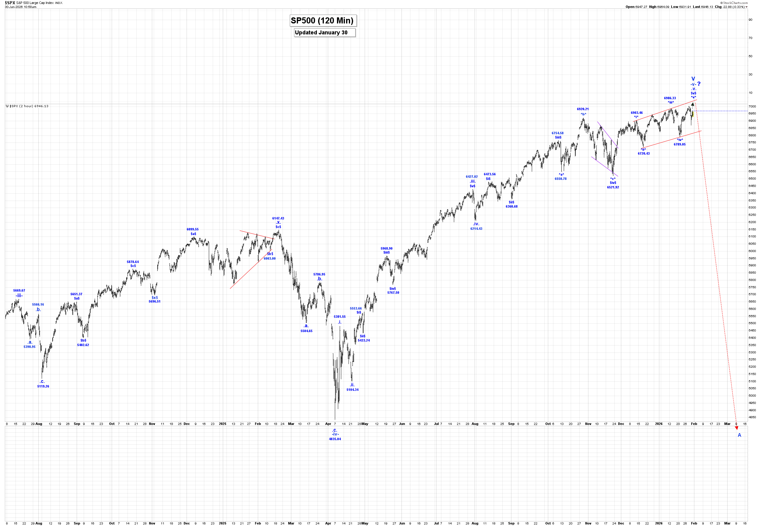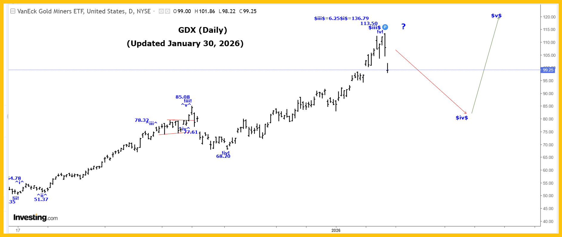 Stocks, Gold & GDX: Key Wave Countscaptainewave Feb 1, 2026 Gold: Please click this link to view the Captain’s weekly gold chart. Double-click to enlarge it. Then, please click this link to view the short-term daily chart. Double-click to enlarge it. Analysis: Gold was initially sharply higher again this past week reaching another all-time high at 5595.40, although after the high was made gold moved sharply lower reaching a low of 4682.40! Our current long-term gold count starting from the 35.20 low made back in 1971: 1 = 1920.80. A very powerful wave (iii) of iii is now complete at the 5595.40 high and we now falling in a multi-month wave (iv), correction that has the following retracement levels: 23.6% = 4702.00 We have already reached our 23.6% retracement level, but we doubt that all of wave (iv) could already be complete. While time isn’t part of Ewave analysis, we do expect very high volatility within wave (iv) as it develops over the next 3 to 6 months and perhaps for the rest of 2026! Projections for the end of wave 3 are: 3 = 2.618(1) = 5936.00. Active Positions: Flat! Special Subscription Offer: At $99/mth the Captain Ewave newsletter value is superb, and we have a special offer this week of just $199 for a three-month subscription! Investors get six updates a week from the Captain AND his key signals for the market… when he issues and acts on them himself! Send us an email at admin@captainewave.com or click this link and we’ll get you on board! Thank-you! Please click this link to view the Captain’s 120 minute SP500 chart. Double-click to enlarge it. Analysis: Our internal wave count for wave -v- has been updated as follows: .i. = 5381.55. Wave $v$ is expanding and extending, and only a break of the 6720.43 low, would confirm that this formation has ended. After wave V ends, we expect a very sharp sell-off in wave A, of a multi-year correction. Active Positions: Flat! Please click this link to view the Captain’s weekly GDX chart. Double-click to enlarge it. Please click this link for the daily chart. Double-click to enlarge it. Analysis: The GDX was initially higher again this past week reaching another all-time high at 113.50, although after that high was made we moved sharply lower reaching a low of 93.12, closing at 94.20! All of wave A ended at the 56.67 high in 2008 and all of our bullish wave triangle at 33.42, and we are continuing to move higher in wave C. Within wave C, we completed weave (i) at 42.57 and wave (ii) at 38.58 and we are now moving higher in wave (iii) as follows: $i$ = 53.25. Our retracement levels for wave $iv$ are: 23.6% = 97.36. We have already reached our 23.6% retracement level, but we doubt that all of wave $iv$ is already complete and we expect it could take 3 to 6 months and perhaps the rest of 2026 for it to develop. Our current projection for the end of wave C is: C = 1.618A = 125.44! Within wave C: We completed wave (i) of i of C at 42.54, wave (ii) at 38.58, and we are still moving sharply higher in a subdividing wave (iii), as shown in our Daily and 60 Min GDX Charts. Active Positions: Flat! Free Offer For 321Gold Readers: Please send me an Email to admin@captainewave.com and I’ll send you our free “Hi Ho Silver: The Big Wave Counts!” report. I highlight key buy and sell zones, wave counts, and targets for what may be the world’s most exciting metal! Thank-you! Risk: captainewave.com is an impersonal advisory service and, therefore, no consideration can or is made toward your financial circumstances. All material presented within captainewave.com is not to be regarded as investment advice, but for general informational purposes only. Trading stocks does involve risk, so caution must always be utilized. We cannot guarantee profits or freedom from loss. You assume the entire cost and risk of any trading you choose to undertake. You also agree to bear complete responsibility for your investment research and decisions and acknowledge that captainewave.com has not and will not make any specific recommendations or give advice to you or any of its clients upon which they should rely. captainewave.com suggests that the client/member test all information and trading methodologies provided at our site through paper trading or some other form of testing. captainewave.com, its owners, or its representatives are not registered as securities broker-dealers or investment advisors either with the U.S. securities and exchange commission or with any state securities regulatory authority. We recommend consulting with a registered investment advisor, broker-dealer, and/or financial advisor. If you choose to invest with or without seeking advice from such an advisor or entity, then any consequences resulting from your investments are your sole responsibility. All information posted is believed to come from reliable sources. captainewave.com does not warrant the accuracy, correctness, or completeness of information available from its service and, therefore, will not be liable for any loss incurred. Due to the electronic nature of the internet, the captainewave.com website, its e-mail & distribution services and any other such "alerts" could fail at any given time. captainewave.com will not be responsible for unavailability of use of its website, nor undelivered e-mails, or "alerts" due to internet bandwidth problems, equipment failure, or acts of god. captainewave.com does not warrant that the transmission of e-mails, or any "alert" will be uninterrupted or error-free. captainewave.com will not be liable for the acts or omissions of any third party with regards to captainewave.com delay or non-delivery of the captainewave.com nightly emails or "alerts". Further, we do not receive any form of payment or other compensation for publishing information, news, research or any other material concerning any securities on our site or publish any information on our site that is intended to affect or influence the value of securities. There is no guaran