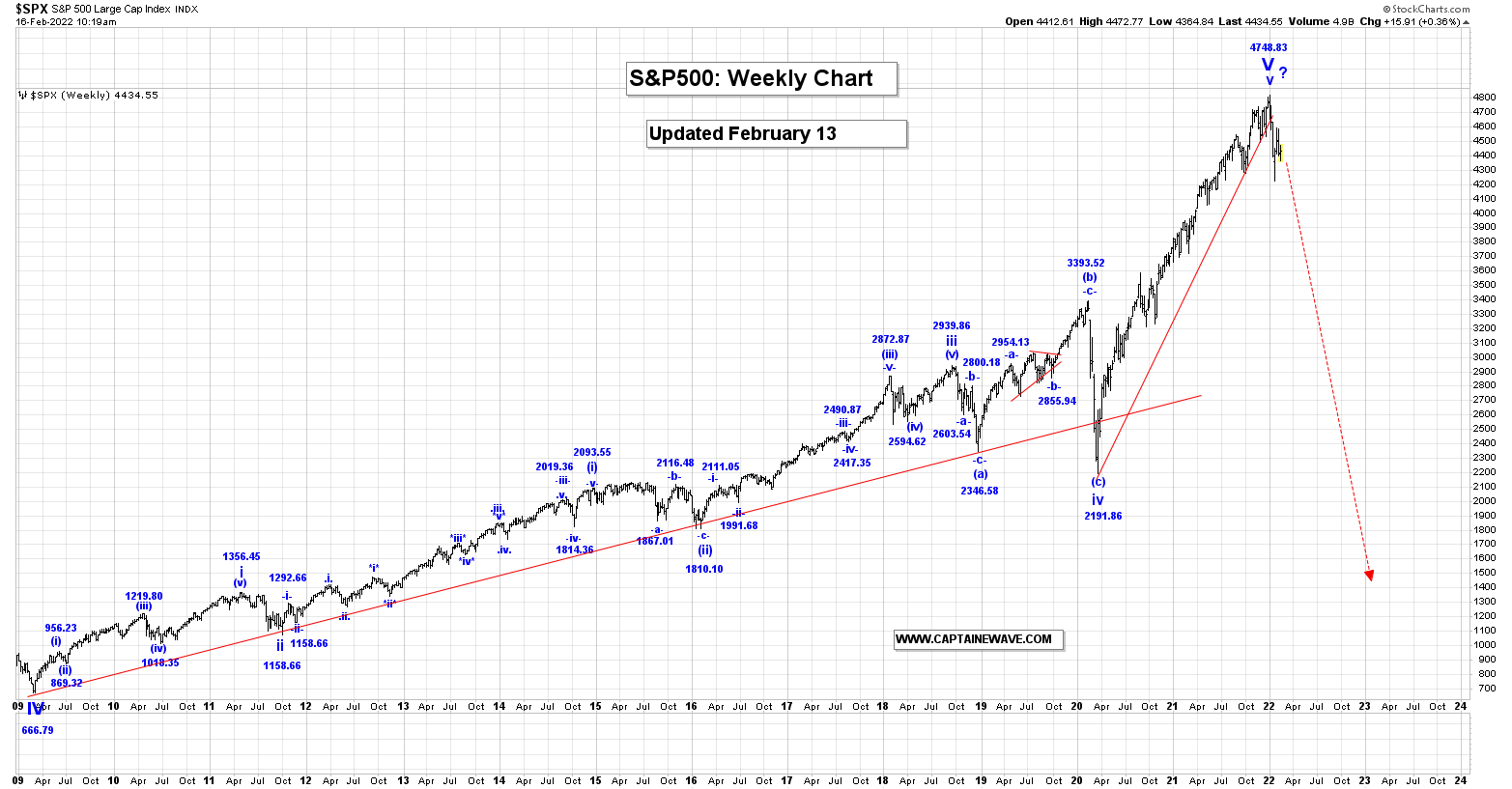 US Stk Mkt: A Tidal Wave Of Doomcaptainewave Feb 16, 2022 It looks like our ending diagonal triangle formation ended a failure high at 4748.83, and wave V is now complete at the high. We should now be falling in wave -iii- which has the following initial projected endpoint: The call options provide immense protection in case there is one final pop higher, but we believe the top is in.