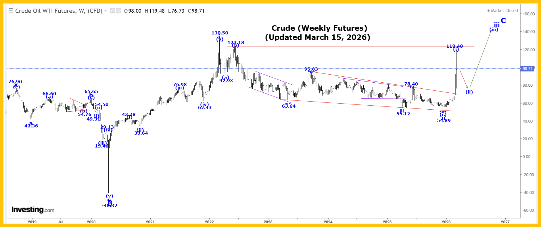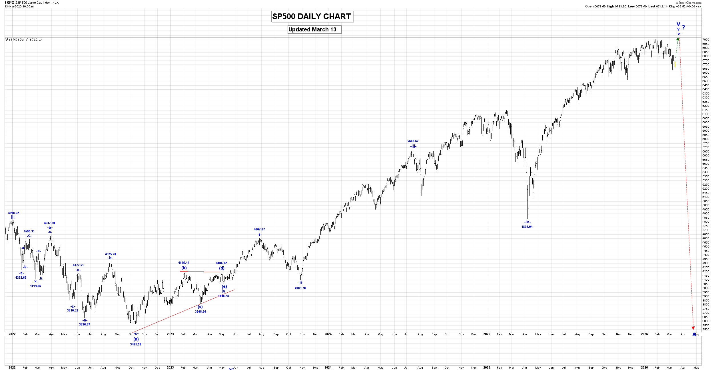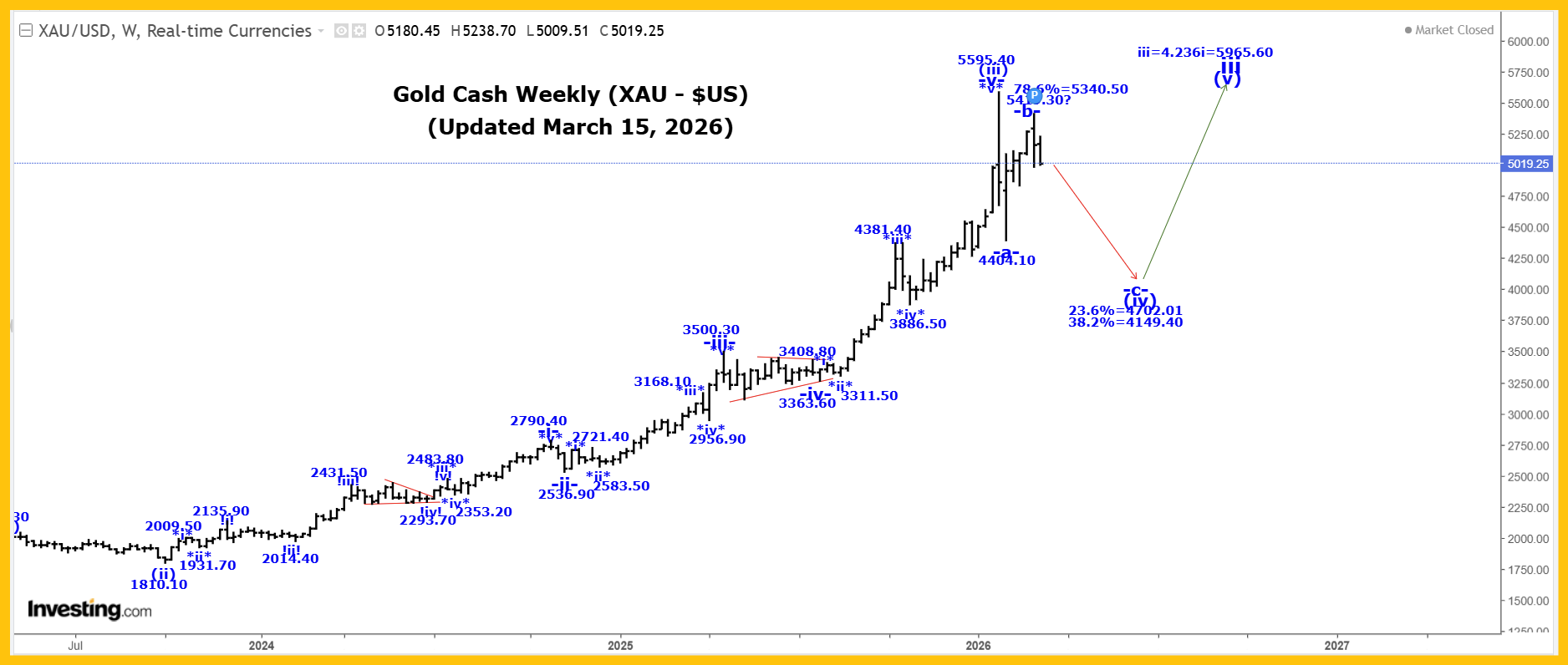 SP500, Oil & Gold: Key Wave Countscaptainewave Mar 15, 2026 SP500 Please click this link to view the Captain’s daily SP500 chart. Double-click to enlarge it. Analysis: Our internal wave count for wave -v- is as follows: .i. = 5381.55. Wave $iv$ likely ended at the 6636.04 low, and if that is the case then we should be heading higher in wave $v$, to all-time (and very temporary) new highs. Only a break now of the 6521.92 low (SP500 Cash) would be the signal that the US500 has peaked, although it would still be short our minimum target of: 7002.38. Active Positions: Flat! Special Subscription Offer: At $99/mth the Captain Ewave newsletter value is superb, and we have a special offer this week of just $199 for a three-month subscription. Investors get six updates a week from the Captain AND his key signals for the market… when he issues and acts on them himself. Send us an email at admin@captainewave.com or click this link and we’ll get you on board! Thank-you! Please click this link to view the Captain’s weekly oil chart. Double-click to enlarge it. Analysis: Crude was sharply higher this past week, reaching a high of 119.48, and closing at 98.78! Wave ii ended at the 54.89 low and we now moving sharply higher in wave iii. Within wave iii, we have completed wave (i) at the 119.48 high and we are now correcting in wave (ii), which has retracement levels as shown in our Daily Post. We do not think that wave (ii) is complete. After wave (ii) ends we expect a sharp move higher in wave (iii). Our initial projection (which we set long before the war) for the completion of wave iii is: iii = 1.618i= 331.28! In the long term we are now rallying in wave C that has the following projections: C = A = 153.77. Active Positions: Long oil futures, with put options as our stops!