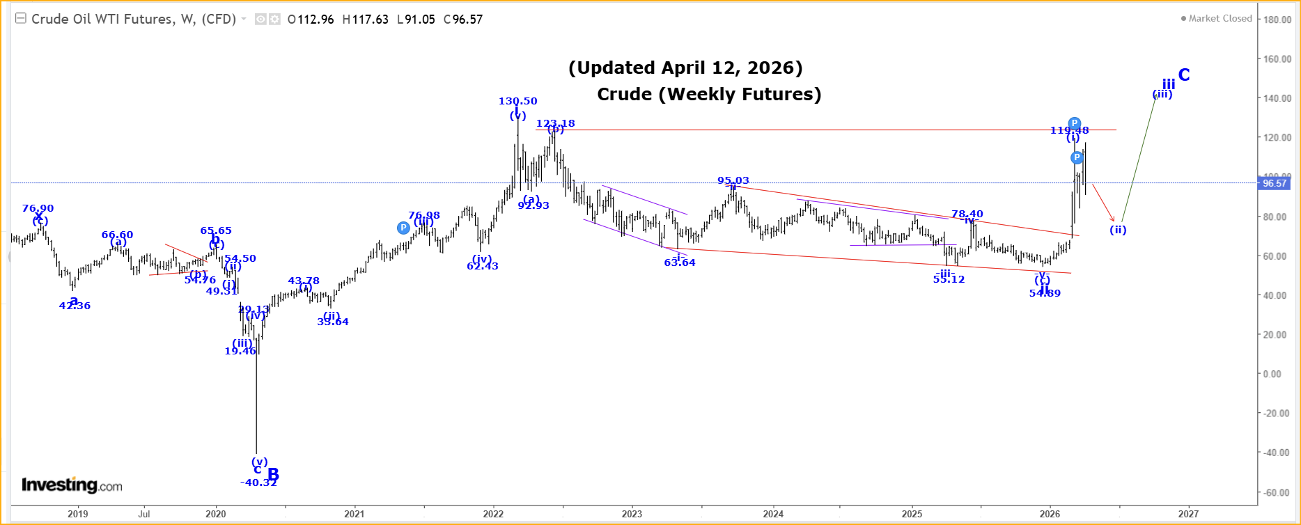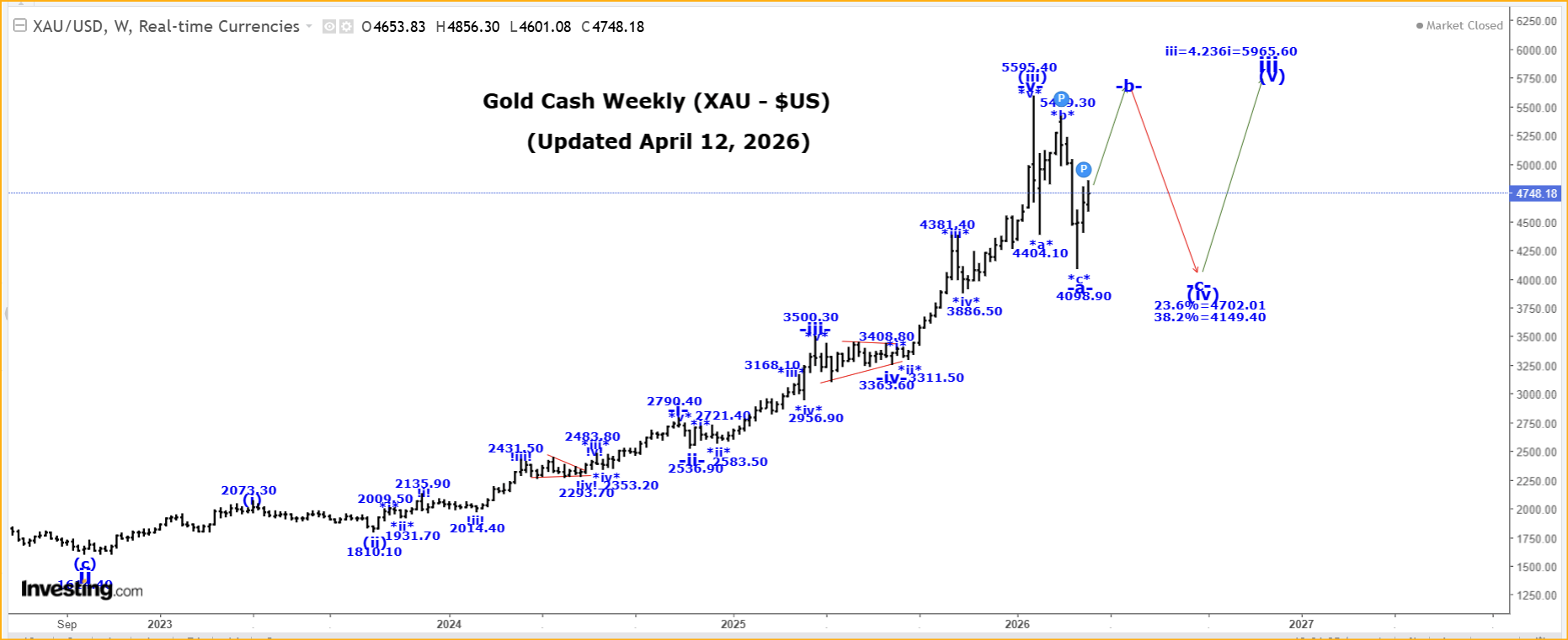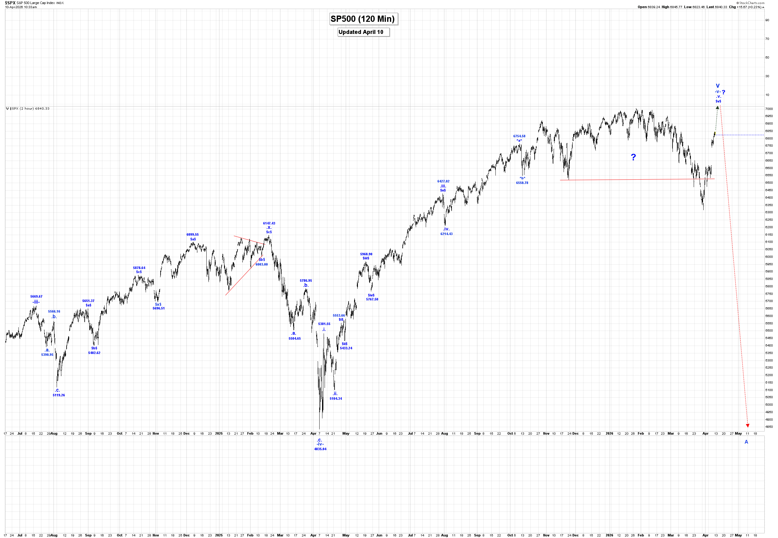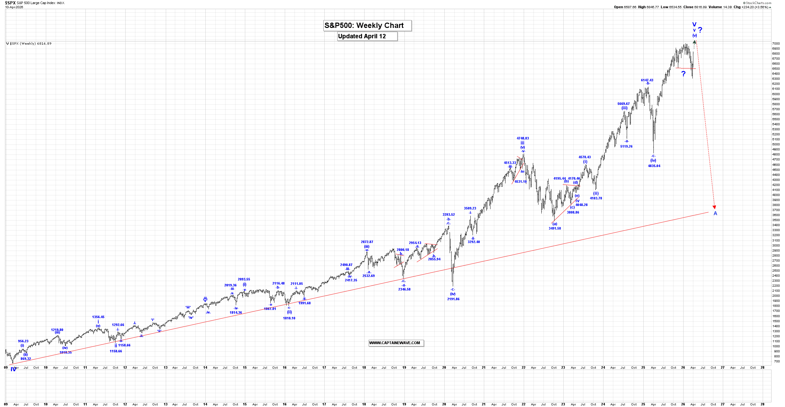 US Stk Mkt, Oil & Gold: The Big Countscaptainewave April 12, 2026 SP500 Please click this link to view the Captain’s 120 minute SP500 chart. Double-click to enlarge it. For the weekly chart, please click this link. Double-click to enlarge it. Analysis: Long Term Update: The SP500 was sharply higher this past week, reaching a high of 6845.77, closing at 6816.89! Within v of V, wave (iv) ended at 4835.04 and we are moving higher in wave (v), which has the following internal wave count: .i. = 5381.55. At the moment we do not have an alternate count to provide, but we suspect a run to all-time new highs appears likely. Special Subscription Offer: At $99/mth the Captain Ewave newsletter value is superb, and we have a special offer this week of just $199 for a three-month subscription. Investors get six updates a week from the Captain AND his key signals for the market… when he issues and acts on them himself. Send us an email at admin@captainewave.com or click this link and we’ll get you on board! Thank-you! Please click this link to view the Captain’s weekly oil chart. Double-click to enlarge it. Analysis: Wave ii ended at the 54.89 low and we now moving sharply higher in wave iii. Within wave iii, we have completed wave (i) at the 119.48 high and we are now correcting in wave (ii), which has retracement levels as shown in our Daily Posts. Within wave (ii) we completed wave -a- at 76.73 and likely wave -b- at 117.63, and if that is the case then we should expect a wave -c- drop back to at least the wave -a- low of 76.73 to complete all of wave (ii). After wave (ii) ends we expect a sharp move higher in wave (iii). Our initial projection for the completion of wave iii is: iii = 1.618i= 331.28. In the long term we are now rallying in wave C that has the following projections: C = A = 153.77. Active Positions: Long oil futures, with put options as our stops! Please click this link to view the Captain’s weekly gold chart. Double-click to enlarge it. Analysis: Long Term Update: Gold was higher again this past week reaching a high of 4856.30, and closing at 4748.20! Our current long-term gold count starting from the 35.20 low made back in 1971, which remains incomplete, is as follows: 1 = 1920.80. A very powerful wave (iii) of iii is now complete at the 5595.40 high and we now falling in a multi-month wave (iv), correction that has the following retracement levels: 23.6% = 4702.00 Within wave (iv), we still believe that it is going to take some time for it to be complete, so we are suggesting that only wave -a- of (iv) ended at 4098.80 and if that is the case than we are starting to move higher in wave -b-. Since wave -a- was a three-wave pattern then we expect wave -b- to rally back to at least near the all-time high… or perhaps even exceed it before it ends! If wave (iv) becomes a flat or irregular type correction than after wave -b- ends, then we expect a wave -c- drop back to at least the wave -a- low of 4098.80 before all of wave (iv) ends. If wave (iv) becomes a large bullish triangle then it will consist of 5 legs, and we will NOT return to the wave -a- low, before all of wave (iv) ends. Within wave -b- we are moving higher in wave *a*. In all cases, we should expect gold to move higher in wave -b- over the next couple of weeks. Wave -b- must consist of at least 1 three wave pattern, but it could have up to 3 such patterns, separated by a wave *x*. Projections for the end of wave 3 are: 3 = 2.618(1) = 5936.00. Active Positions: Flat… for now! Thank-you! Risk: captainewave.com is an impersonal advisory service and, therefore, no consideration can or is made toward your financial circumstances. All material presented within captainewave.com is not to be regarded as investment advice, but for general informational purposes only. Trading stocks does involve risk, so caution must always be utilized. We cannot guarantee profits or freedom from loss. You assume the entire cost and risk of any trading you choose to undertake. You also agree to bear complete responsibility for your investment research and decisions and acknowledge that captainewave.com has not and will not make any specific recommendations or give advice to you or any of its clients upon which they should rely. captainewave.com suggests that the client/member test all information and trading methodologies provided at our site through paper trading or some other form of testing. captainewave.com, its owners, or its representatives are not registered as securities broker-dealers or investment advisors either with the U.S. securities and exchange commission or with any state securities regulatory authority. We recommend consulting with a registered investment advisor, broker-dealer, and/or financial advisor. If you choose to invest with or without seeking advice from such an advisor or entity, then any consequences resulting from your investments are your sole responsibility. All information posted is believed to come from reliable sources. captainewave.com does not warrant the accuracy, correctness, or completeness of information available from its service and, therefore, will not be liable for any loss incurred. Due to the electronic nature of the internet, the captainewave.com website, its e-mail & distribution services and any other such "alerts" could fail at any given time. captainewave.com will not be responsible for unavailability of use of its website, nor undelivered e-mails, or "alerts" due to internet bandwidth problems, equipment failure, or acts of god. captainewave.com does not warrant that the transmission of e-mails, or any "alert" will be uninterrupted or error-free. captainewave.com will not be liable for the acts or omissions of any third party with regards to captainewave.com delay or non-delivery of the captainewave.com nightly emails or "alerts". Further, we do not receive any form of payment or other compensation for publishing information, news, research or any other material concerning any securi