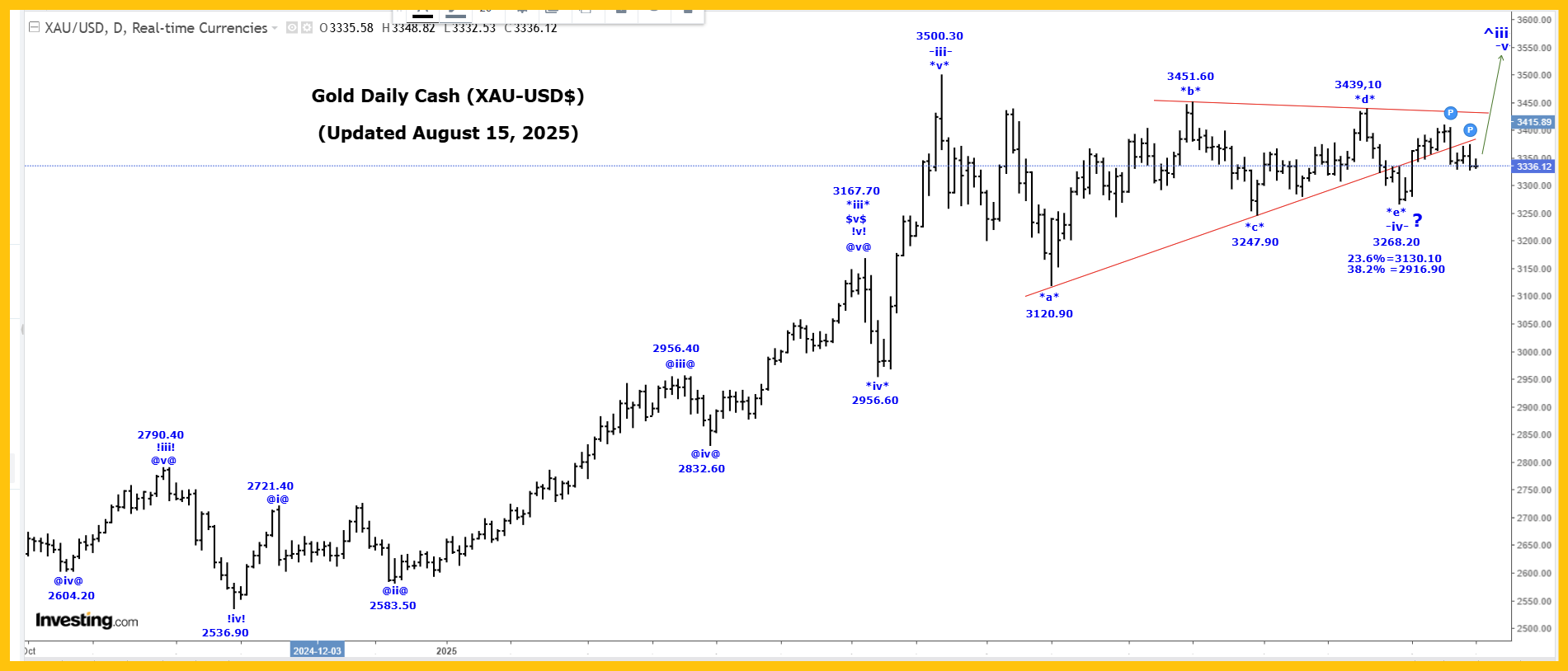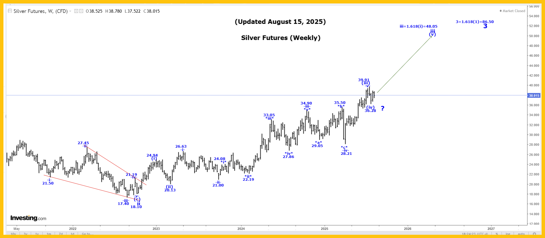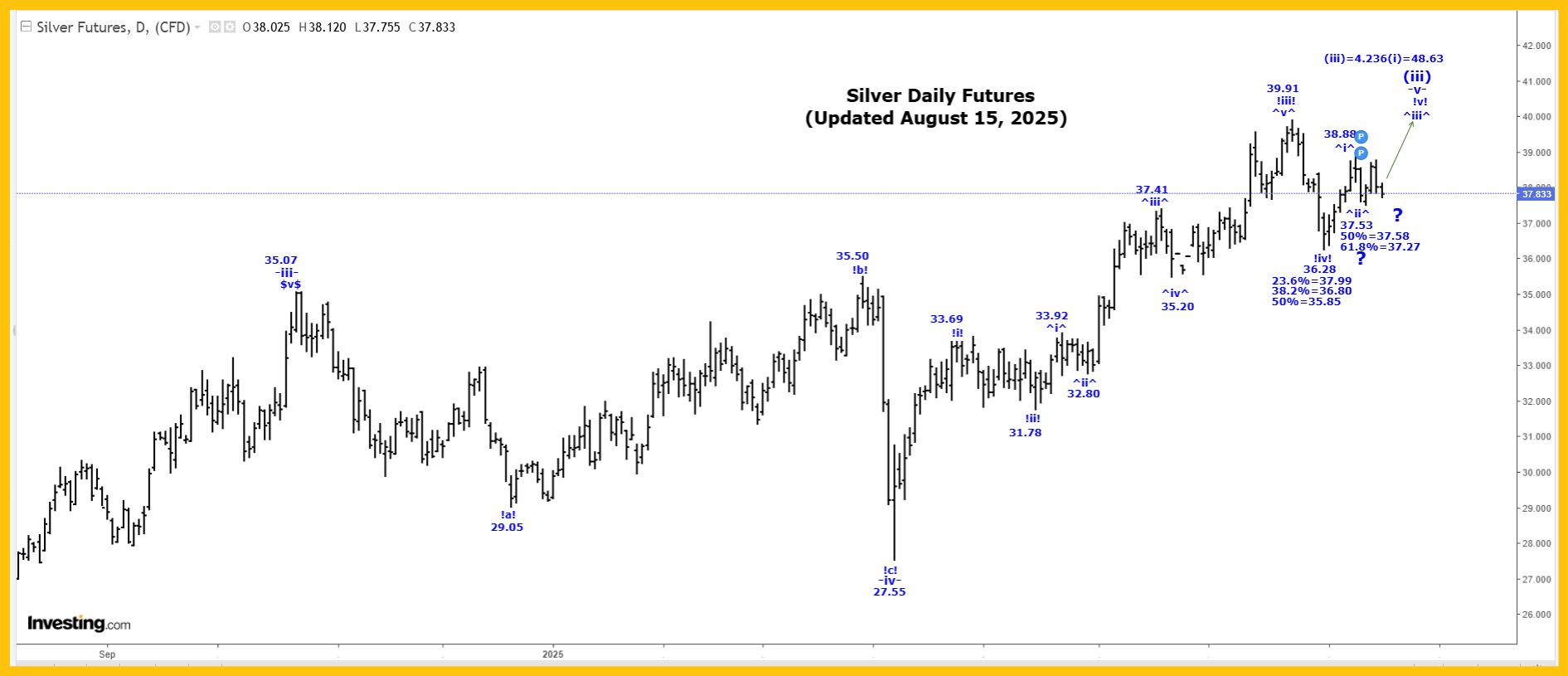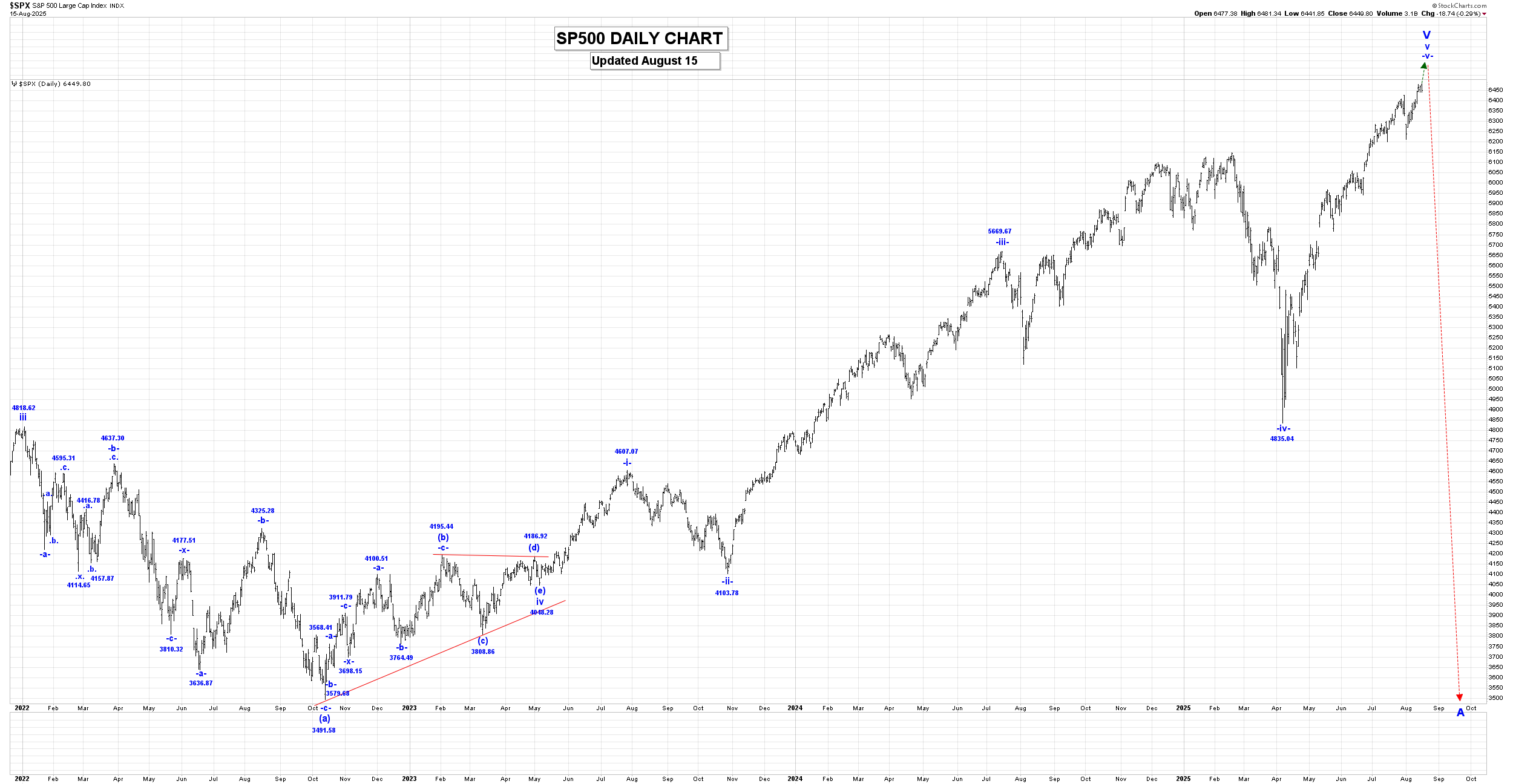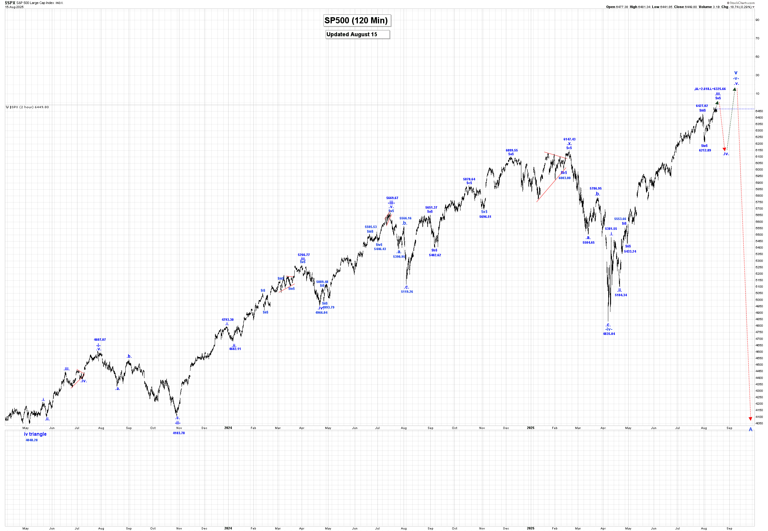 Stk Mkt, Silver & Gold: Key Wave Countscaptainewave Aug 17, 2025 S&P500 Update Please click this link to view the Captain’s daily SP500 chart. Double-click to enlarge it. We are still working on wave -v-, and within wave -v-, and it looks like wave .iii. is still underway, with our current projected endpoint being: .iii. = 2.168.i. = 6325.66. We have reached our projected endpoint, so we need to be on guard for its completion and the start of a correction in wave .iv. that should retrace between 23.6 to 38.2% of the entire wave .iii. rally. Please click this link to view the Captain’s 120Minute SP500 chart. Double-click to enlarge it. The rally from that decline (.iv. on the chart) to new record highs could fool most stock market investors into thinking all the danger is over when in fact…. The real danger is about to begin. Trading Recommendation: Stay Flat (but not for long!).
