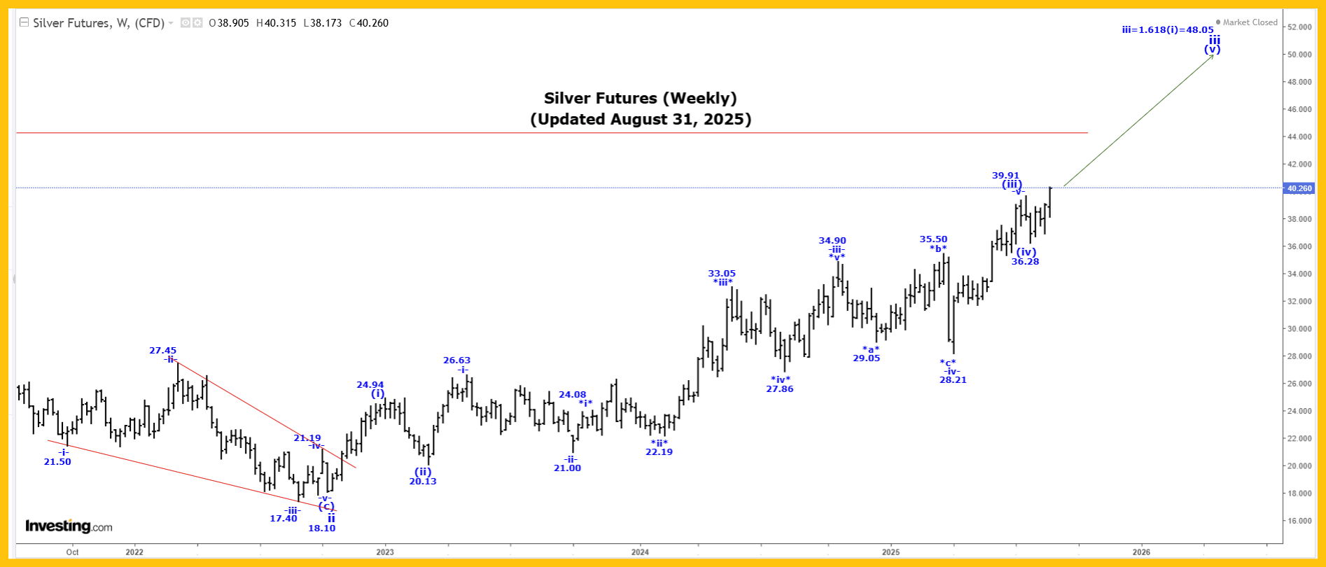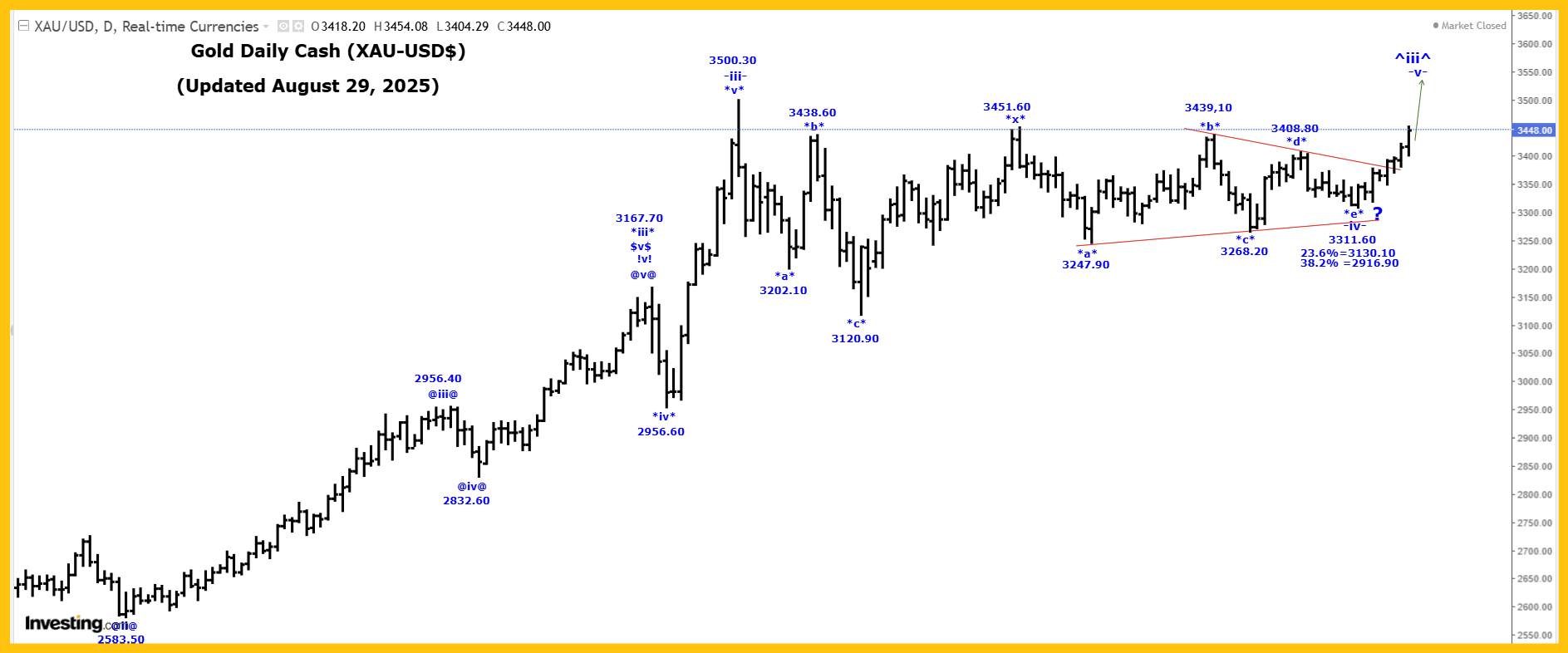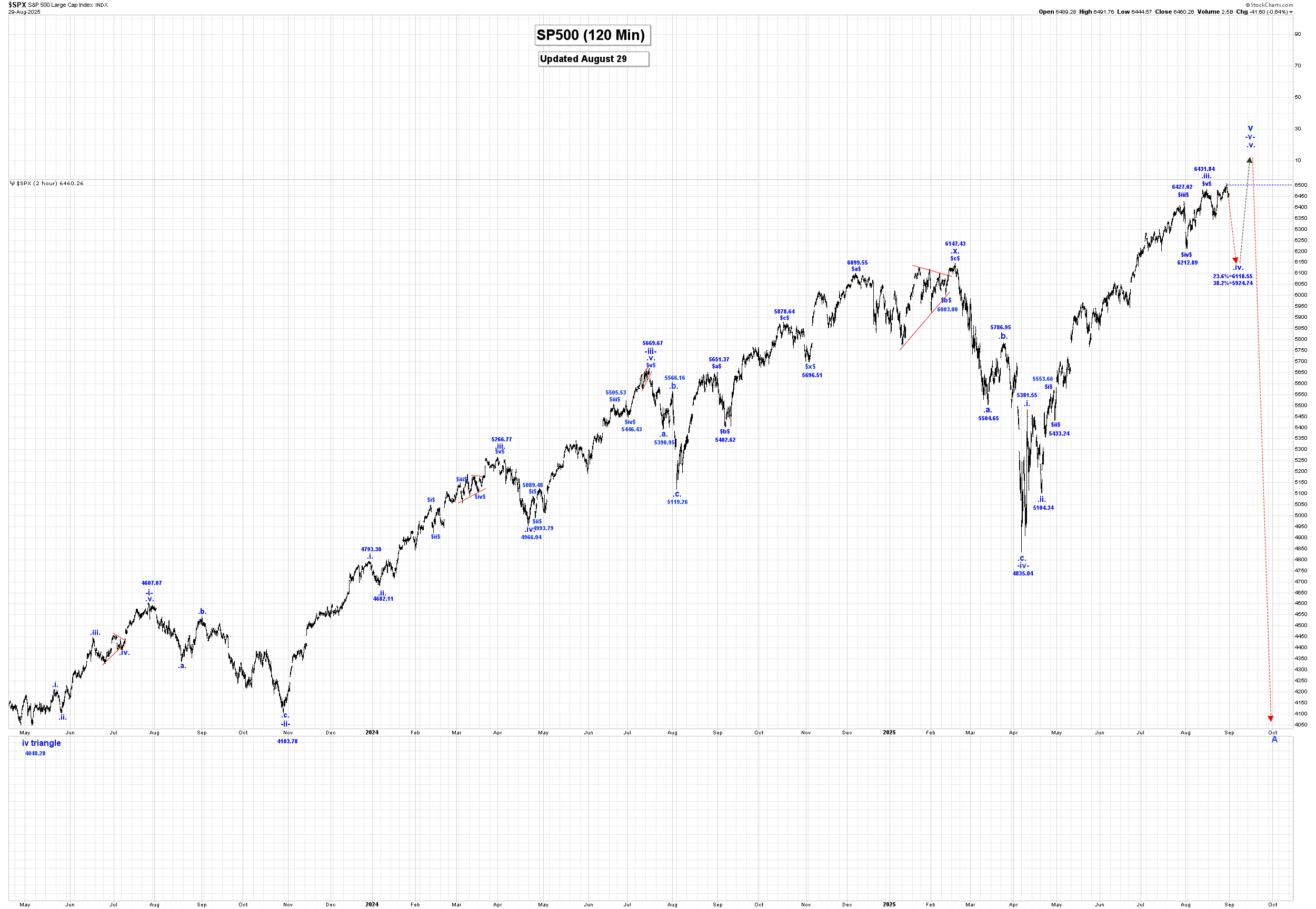Stk Mkt Danger Vs Gold & Silver Blastoffcaptainewave Aug 31, 2025 S&P500 Update Please click this link to view the Captain’s 120 minute SP500 chart. Double-click to enlarge it. Here’s our take on the action: The SP500 was higher again this past week reaching another all-time high at 6508.20! Within v of V, wave (iv) ended at 4835.04 and we are moving higher in wave (v), which is likely now getting very close to completion. We will be updating our internal wave count within wave (v) to suggest that we likely only need one more push above the current high of 6508.23 to complete the minimum requirements for a completed wave (v). We will provide our updated internal count for wave (v) in our next Morning Post. We will likely be looking to short this market this week! Trading Recommendation: Stay Flat (but not for long). Special Subscription Offer: At $99/mth the Captain Ewave newsletter value is superb, and we have a special offer this week of just $199 for a three-month subscription! Investors get six updates a week from the Captain. Send us an email at admin@captainewave.com or click this link and we’ll get you on board. Thank-you!