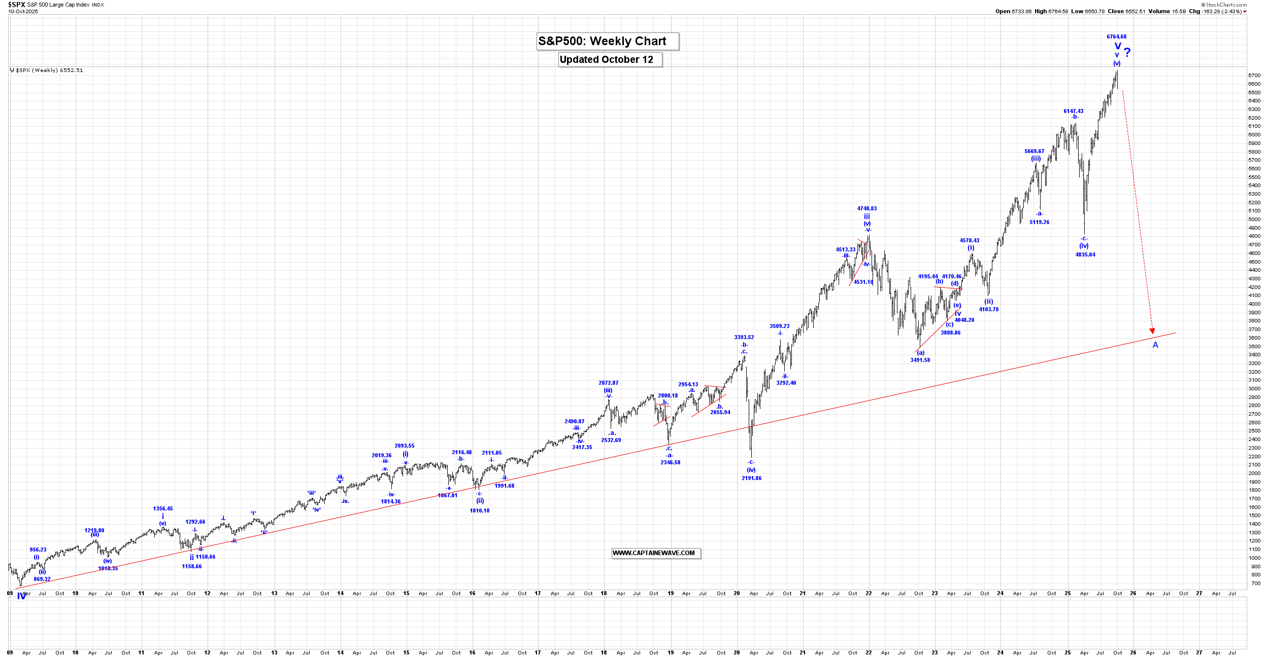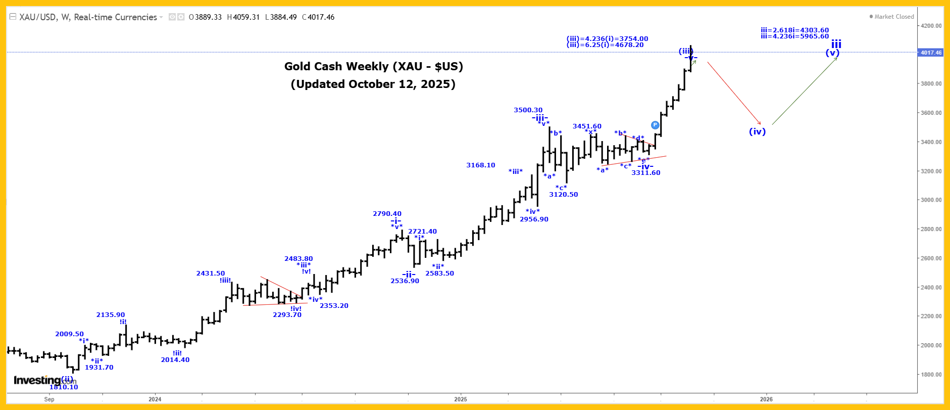 Gold, Rates & Stocks: Tidal Wave Countscaptainewave Sep 12, 2025 Gold: Please click this link to view the Captain’s weekly gold chart. Double-click to enlarge it. Analysis: Gold was higher again this past week, reaching another all-time high at 4059.30, and closing at 4017.50! Our current long-term gold count starting from the 35.20 low made back in 1971, which remains incomplete, is as follows: 1 = 1920.80. Projections for the end of wave (iii) are: (iii) = 4.236(i) = 3753.00. We are very reluctantly now working on the assumption that all of wave -v- and (iii) are complete at the 4059.30 high, and if that is the case then we are starting to fall in our wave (iv) correction, with retracement levels as indicated in our last Friday Daily Post. It is still too early to determine which internal wave structure wave (iv) is following. A projection for the end of wave iii is: iii = 4.236i = 5965.60. Projections for the end of wave 3 are: 3 = 2.618(1) = 5936.00. We still cannot rule the possibly that wave -v- is going to move substantially higher and in that case, likely only wave *i* of -v- of (iii) ended at the 4059.30 high and we are now falling in a wave *ii* correction that should retrace between 50 to 61.8% of the entire wave *i* rally. This would result in wave (iii) soon heading to our last projected endpoint of 4678.20! Active Positions: Long with puts as stops! Special Subscription Offer: At $99/mth the Captain Ewave newsletter value is superb, and we have a special offer this week of just $199 for a three-month subscription! Investors get six updates a week from the Captain AND his key signals for the market… when he issues and acts on them himself! Send us an email at admin@captainewave.com or click this link and we’ll get you on board! Thank-you!