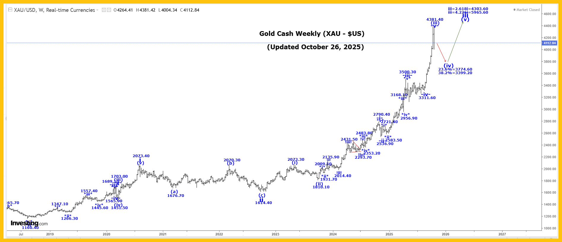 Please click this link to view the Captain’s weekly oil chart. Double-click to enlarge it. Analysis: Our internal wave count for wave ii to looks like:: (a) = 92.93. It is looking like wave -v- may also be an ending diagonal triangle formation… and that remains incomplete. After wave ii ends we expect a very sharp rally higher in wave iii, and we will provide our projected endpoint for its completion after wave ii ends. There is an outside chance that all of wave -v- and wave ii may have ended at the 55.98 low, with only a break of the 65.98 high confirming that to be the case. We did have a key weekly reversal higher this past week. In the long term we are now rallying in wave C that has the following projections: C = A = 153.77. Active Positions: Long crude, with puts as our stop. Long Suncor! Gold: Please click this link to view the Captain’s weekly gold chart. Double-click to enlarge it. Analysis: Gold was initially higher again this past week, reaching another all-time high at 4381.40, but after that high was made we moved sharply lower… reaching a low of 4004.30, closing at 4112.80! Our current long-term gold count starting from the 35.20 low made back in 1971 (which remains incomplete) is here: 1 = 1920.80. We are falling in a multi-month wave (iv) correction that has the following retracement levels: 23.6% = 3774.60. Within wave (iv) we likely completed wave -a- and the 4004.30 low and if that is the case, we are now moving higher in wave -b-. It is still too early to determine which form wave (iv) will take but based on the formation of wave (ii), we should expect wave (iv) to become either a bullish triangle, flat or irregular type correction… Where in the latter formation gold will make another all-time high in wave -b-, before it falls again into our suggested retracement zone. A projection for the end of wave iii is: iii = 4.236i = 5965.60. Projections for the end of wave 3 are: 3 = 2.618(1) = 5936.00. There is still an outside chance that wave -v- and (iii) are going to move substantially higher and in that case, likely only wave *i* of -v- of (iii) may have ended at the 4381.40 high and if that is the case then we would now be falling in a wave *ii* correction that should retrace between 50 to 61.8% of the wave *i* rally, with retracement levels noted in our Daily Post. We exited all long positions. We entered these positions in late 2015. It’s not a top call. Our profits were so large that we had to book them! Active Positions: Flat. Free Offer For 321Gold Readers: Please send me an Email to admin@captainewave.com and I’ll send you our free “CDNX: Leading The Next Upside Charge!” report. Here we highlight the incredibly bullish wave counts for the CDNX and for some hot individual CDNX/US OTC junior miners too. We include both the weekly and daily charts… with our big upside targets included in the report! Thank-you! Risk: captainewave.com is an impersonal advisory service and, therefore, no consideration can or is made toward your financial circumstances. All material presented within captainewave.com is not to be regarded as investment advice, but for general informational purposes only. Trading stocks does involve risk, so caution must always be utilized. We cannot guarantee profits or freedom from loss. You assume the entire cost and risk of any trading you choose to undertake. You also agree to bear complete responsibility for your investment research and decisions and acknowledge that captainewave.com has not and will not make any specific recommendations or give advice to you or any of its clients upon which they should rely. captainewave.com suggests that the client/member test all information and trading methodologies provided at our site through paper trading or some other form of testing. captainewave.com, its owners, or its representatives are not registered as securities broker-dealers or investment advisors either with the U.S. securities and exchange commission or with any state securities regulatory authority. We recommend consulting with a registered investment advisor, broker-dealer, and/or financial advisor. If you choose to invest with or without seeking advice from such an advisor or entity, then any consequences resulting from your investments are your sole responsibility. All information posted is believed to come from reliable sources. captainewave.com does not warrant the accuracy, correctness, or completeness of information available from its service and, therefore, will not be liable for any loss incurred. Due to the electronic nature of the internet, the captainewave.com website, its e-mail & distribution services and any other such "alerts" could fail at any given time. captainewave.com will not be responsible for unavailability of use of its website, nor undelivered e-mails, or "alerts" due to internet bandwidth problems, equipment failure, or acts of god. captainewave.com does not warrant that the transmission of e-mails, or any "alert" will be uninterrupted or error-free. captainewave.com will not be liable for the acts or omissions of any third party with regards to captainewave.com delay or non-delivery of the captainewave.com nightly emails or "alerts". Further, we do not receive any form of payment or other compensation for publishing information, news, research or any other material concerning any securities on our site or publish any information on our site that is intended to affect or influence the value of securities. There is no guarantee past performance will be indicative of future results. No assurance can be given that the recommendations of captainewave.com will be profitable or will not be subject to losses. All clients should understand that the results of a particular period will not necessarily be indicative of results in future periods. The results listed at this website are based on hypothetical trades. Plainly speaking, these trades were not actually executed. Hypothetical or simulated performance re