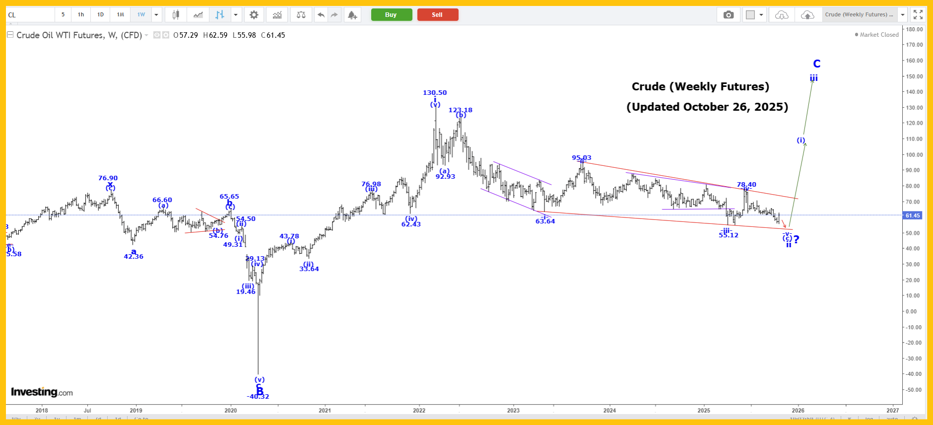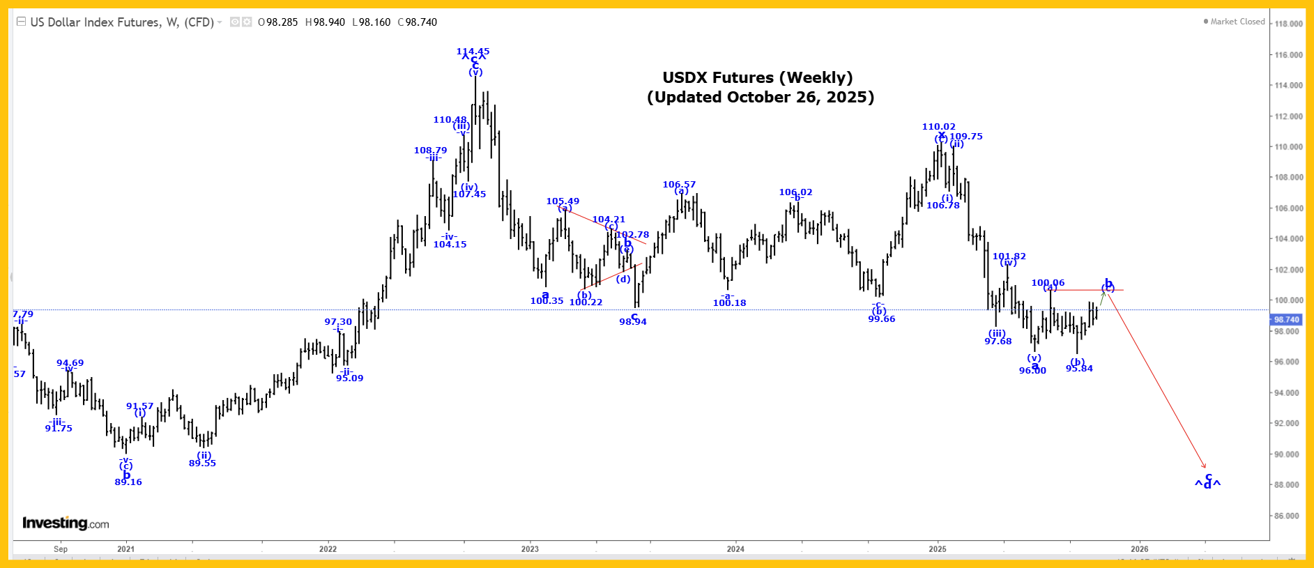 USD, Oil & Gold: Key Wave Countscaptainewave Oct 26, 2025 US Dollar: Please click this link to view the Captain’s weekly US dollar chart. Double-click to enlarge it. Analysis: The USDX was higher this past week reaching a high of 98.94, closing at 98.74. We continue to work on a very large wave B bearish triangle and within that triangle all of wave ^c^ ended at the 114.75 high. We are falling in wave ^d^. Wave ^d^ cannot fall below the wave ^b^ low of 71.46 for this triangle formation to remain valid. Wave ^d^ needs to consist of at least one abc pattern but can have up to 3 such patterns. We have made a major revision to the internal wave structure of wave ^d^ and now believe that it will consist of at least 2 three wave patterns as follows: a = 100.35. After our second wave b ends, we expect a drop in our second wave c. Active Positions: Short, risking to 104.00! Special Subscription Offer: At $99/mth the Captain Ewave newsletter value is superb, and we have a special offer this week of just $199 for a three-month subscription! Investors get six updates a week from the Captain AND his key signals for the market… when he issues and acts on them himself! Send us an email at admin@captainewave.com or click this link and we’ll get you on board! Thank-you!