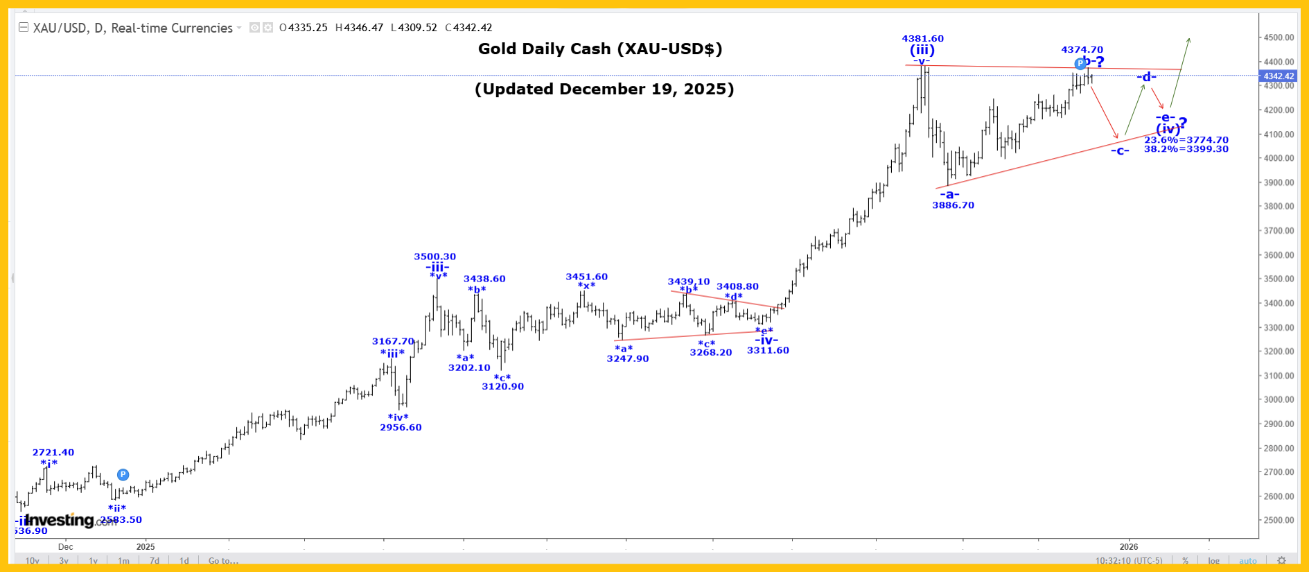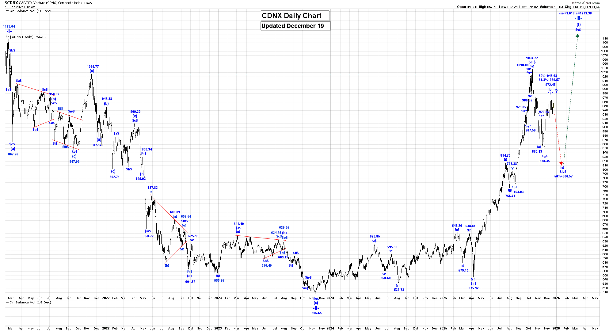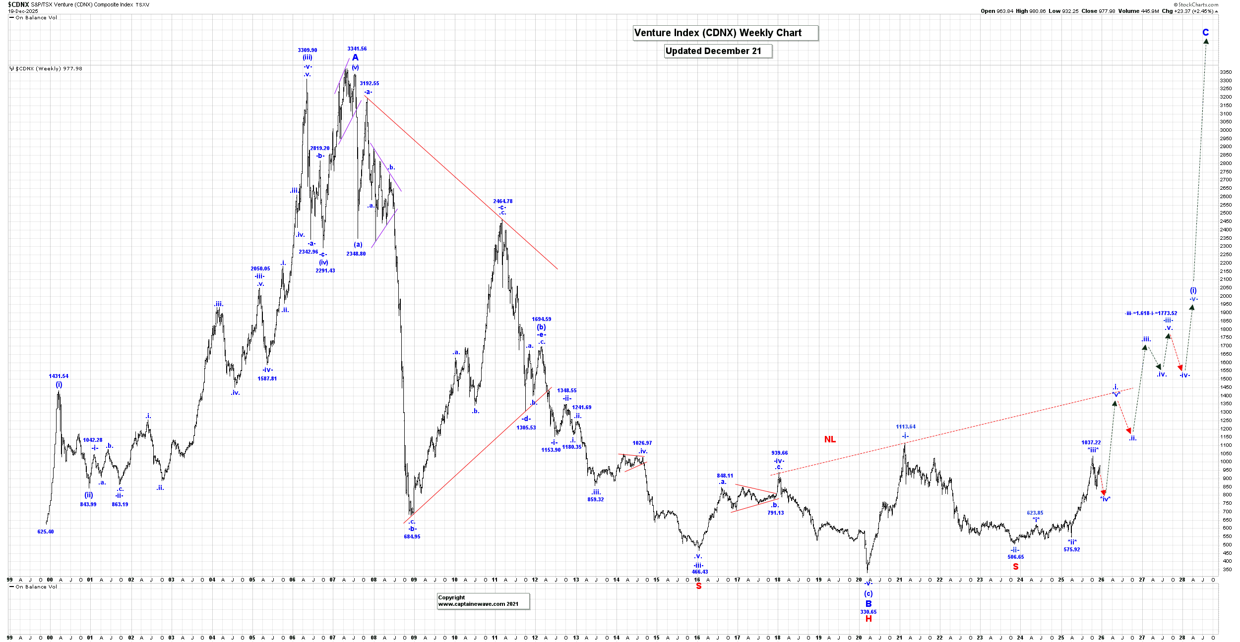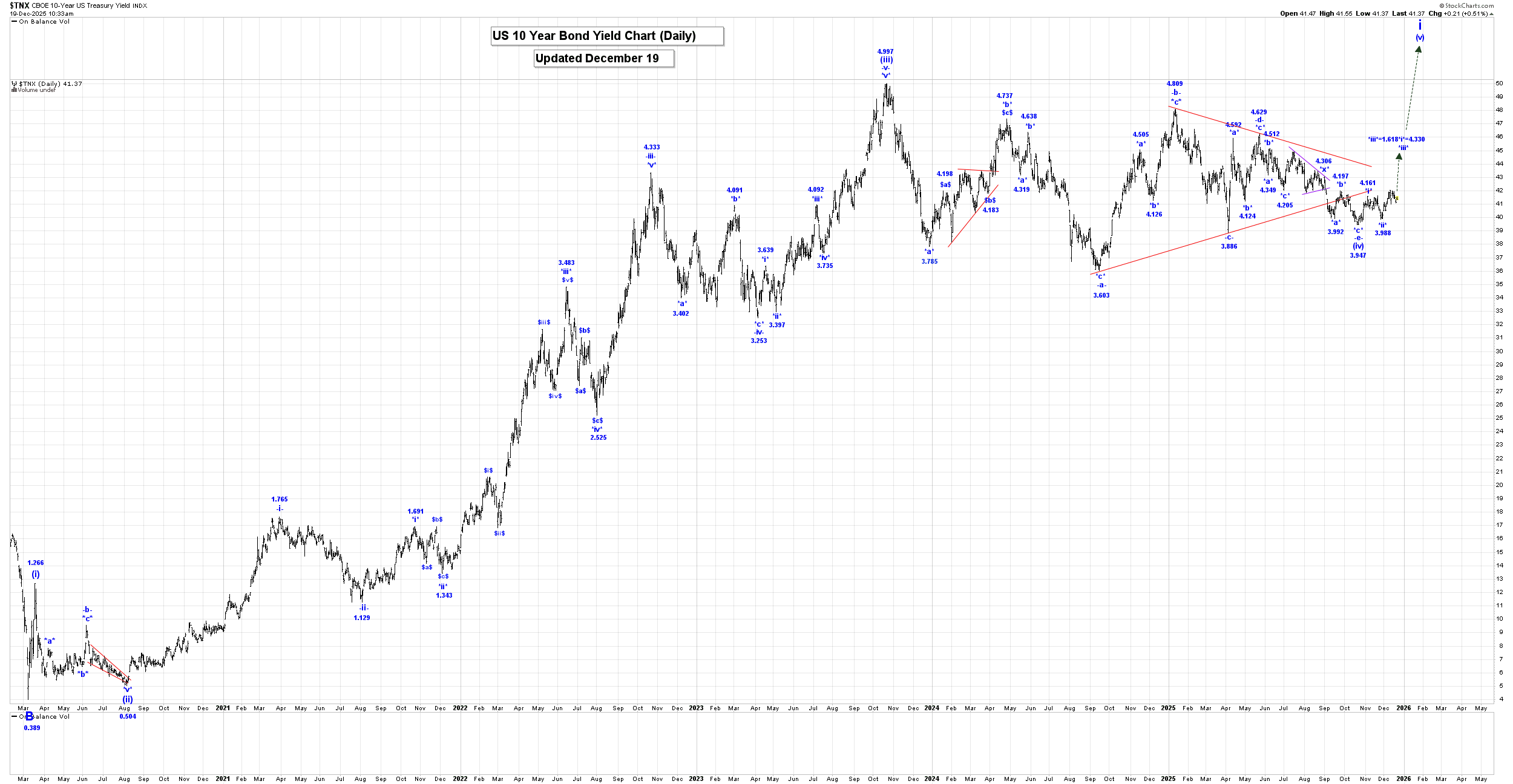Rates, Gold & CDNX: Key Wave Countscaptainewave Dec 21, 2025 Ten Year Rates: Please click this link to view the Captain’s monthly US 10year rates chart. Double-click to enlarge it. Please click this link to view the short-term chart. Double-click to enlarge it. Analysis: Within a multi-year wave C, we are rallying in wave i, which is now still underway. Within wave i, we completed wave (i) at 1.266%, wave (ii) at 0.504%, wave (iii) at 4.997% and our large wave (iv) bullish triangle at the 3.947% low. We are starting to thrust higher in wave (v) to complete all of wave i and therefore expect higher yields in the days and weeks ahead. After wave i ends we expect a wave ii, correction that retraces between 50 to 61.8% of the entire wave i rally. On our Long-Term Monthly Chart all of wave A ended at the 15.83 high in 1981 and since that high was made, we have fallen in a triple 3 wave correction within wave B that ended at the 0.38% level. We have started to rally higher in a multi-year wave C rally that will eventually see rates reach at least the 15.83 high again. Active Positions: Long, risking to 3.880%! Special Subscription Offer: At $99/mth the Captain Ewave newsletter value is superb, and we have a special offer this week of just $199 for a three-month subscription! Investors get six updates a week from the Captain AND his key signals for the market… when he issues and acts on them himself! Send us an email at admin@captainewave.com or click this link and we’ll get you on board! Thank-you! Please click this link to view the Captain’s daily gold chart. Double-click to enlarge it. Analysis: We exited all long positions for gold, silver, and our miners near the $4380 area highs. We entered these positions in late 2015. It’s not a top call. Our profits were so large that we had to book them… and we plan to re-enter the market at the end of “little wave b” with our biggest positions yet! Our current long-term gold count starting from the 35.20 low made back in 1971, which remains incomplete, is as follows: 1 = 1920.80. We are falling in a multi-month wave (iv) correction that has the following retracement levels: 23.6% = 3774.60. Within wave (iv) we completed wave -a- at the 3886.50 low and it now looks like wave -b- is still underway, although it could now be complete at the 4374.40 high. After wave -b- ends we expect another drop in wave -c-. For the time being we are assuming that wave (iv) is becoming a bullish triangle, and therefore wave -c- cannot fall below the wave -a- low of 3886.05. The other option is that wave -b- is going to become more complex and in this case wave (iv) could still become a flat or irregular type correction, where in the latter formation gold will make another all-time high in wave -b-, before it falls again into our suggested retracement zone. We still expect that wave (iv) is going to take many more months to develop. A projection for the end of wave iii is: iii = 4.236i = 5965.60. Projections for the end of wave 3 are: 3 = 2.618(1) = 5936.00. Active Positions: Flat! Please click this link to view the Captain’s weekly CDNX chart. Double-click to enlarge it. Please click this link for the daily chart. Double-click to enlarge it. Analysis: Our long wave -ii- correction which is a triple three wave pattern, is complete at the 506.65 low. We are rallying in wave -iii-, which has an initial projected endpoint of: -iii- = 1.618-i- = 1773.38. Within wave -iii-, we are now rallying in wave (i) and within wave (i) we have updated our count to suggest that all of wave $iii$ ended at the 1037.32 high and that we are now falling in wave $iv$, which has a retracement level of: 50% = 806.57. We have undated the internal wave structure of wave $iv$ as shown on our daily CDNX Chart. It suggests that within wave $iv$ we completed wave !a! at 860.13 and we are still rallying in wave !b!, which has the following retracement levels: 50% = 948.68. We are now reached our 61.8% retracement level, so we need to be on guard for the completion of wave !b!, perhaps at the 972.45 high, and the start of another drop in wave !c!... Which should at least reach the 838.35 low, but more likely our 50% retracement level of 806.57, before all of wave $iv$ ends. Active Positions: Flat! Free Offer For 321Gold Readers: Please send me an Email to admin@captainewave.com and I’ll send you our free “Silver: What Now?” report. I highlight key buy zones, wave counts, and targets for this truly fantastic metal! Thank-you! Risk: captainewave.com is an impersonal advisory service and, therefore, no consideration can or is made toward your financial circumstances. All material presented within captainewave.com is not to be regarded as investment advice, but for general informational purposes only. Trading stocks does involve risk, so caution must always be utilized. We cannot guarantee profits or freedom from loss. You assume the entire cost and risk of any trading you choose to undertake. You also agree to bear complete responsibility for your investment research and decisions and acknowledge that captainewave.com has not and will not make any specific recommendations or give advice to you or any of its clients upon which they should rely. captainewave.com suggests that the client/member test all information and trading methodologies provided at our site through paper trading or some other form of testing. captainewave.com, its owners, or its representatives are not registered as securities broker-dealers or investment advisors either with the U.S. securities and exchange commission or with any state securities regulatory authority. We recommend consulting with a registered investment advisor, broker-dealer, and/or financial advisor. If you choose to invest with or without seeking advice from such an advisor or entity, then any consequences resulting from your investments are your sole responsibility. All information posted is believed to come from reliable sources. captainewave
