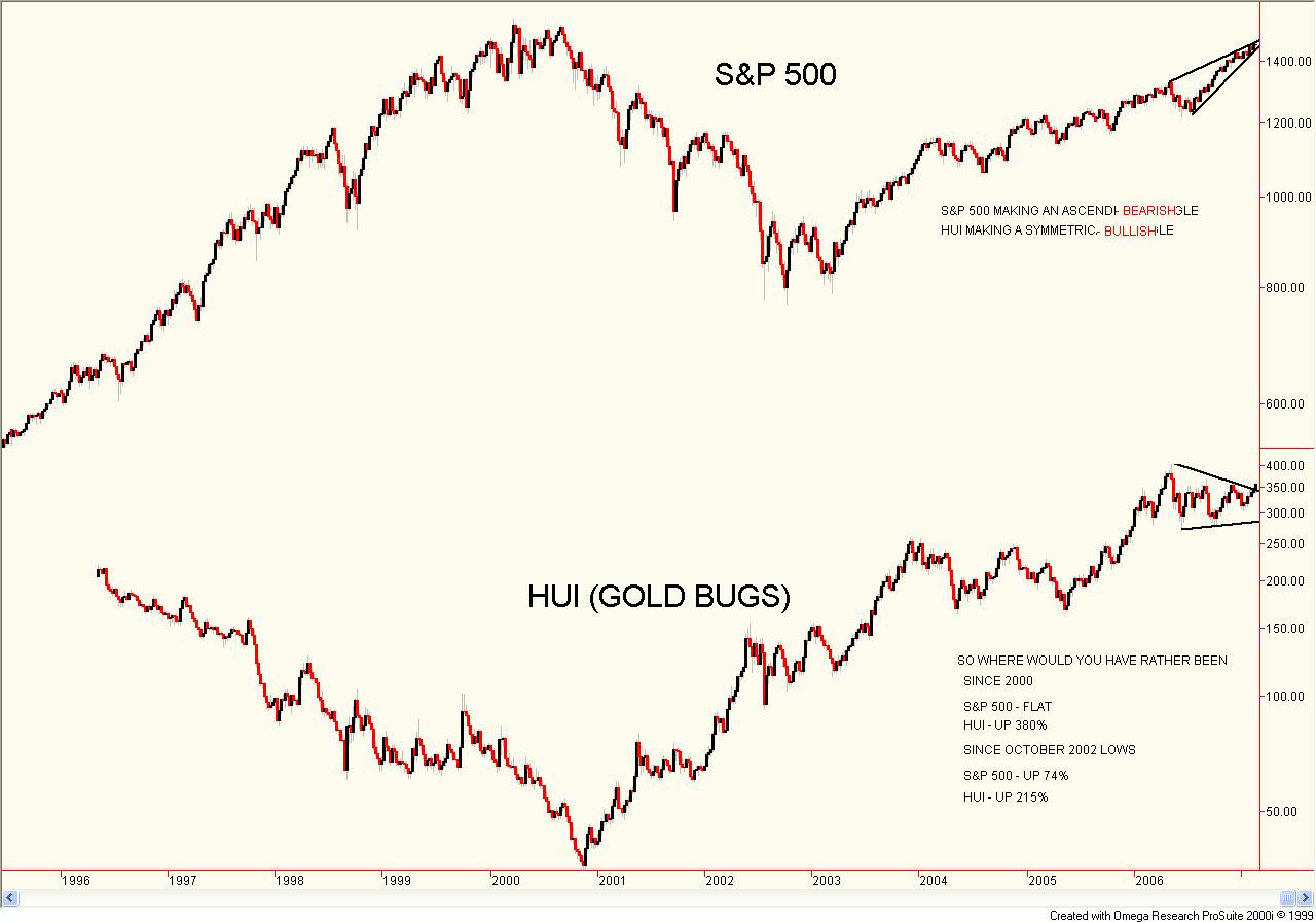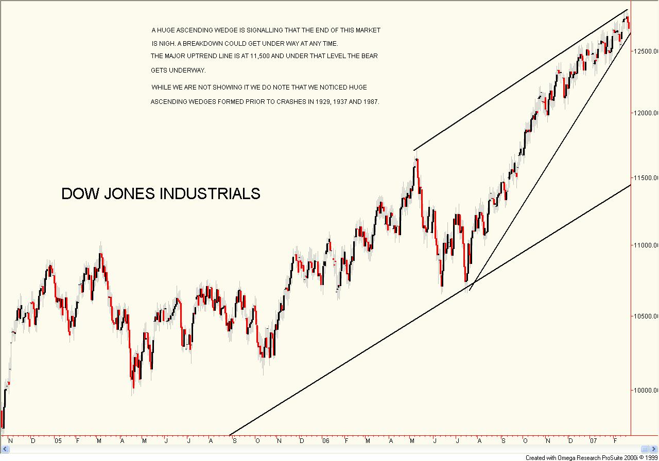 A Gathering Perfect Storm?David Chapman It has been a while since the last Technical Scoop. But we suppose that is what happens when watching one of the most meandering markets we have ever witnessed. It is almost as if it wants to put you to sleep. The Dow Jones Industrials has trudged almost daily to new all-time highs, but instead of excitement we fight to stifle a yawn. The DJI is up roughly 2.6 per cent on the year and that is about as exciting as it gets. The TSX Composite has fared little better: up 3.2 per cent despite also hitting new all-time highs. With the Dow Jones Industrials making new highs, it is interesting to note that the S&P 500 remains some 68 points off its all-time highest close. That happened almost seven years ago, on March 24, 2000. The NASDAQ has fared even worse, crawling back to barely 50 per cent of its all-time highest close of 5,048 on March 10, 2000. To be down 50 per cent yet call the last few years a successful bull market is chutzpah. We have to remind everyone that after hitting 5,048 on March 10, the NASDAQ was down 38 per cent by May 23 that year. Even that level near 3000 seems miraculous now although at least now within hailing distance. Yet today we see some signs of a return to the atmosphere of those heady days leading to the highs in 2000. It is a market that increasingly believes it can't lose. At least back in 2000 there were some doubts as the VXN volatility indicator was at a lofty 61. Today it is under 16. No volatility, no complacency. And so it is with the economy. They are calling it the "Goldilocks economy". Not too hot, not too cold. The bulls chortle, complacency is high, volatility is low. The bears must surely be beaten to death by now, drowning in their own doom and gloom rhetoric. Trouble is, markets work in mysterious ways. What they really want to do is draw in as many people as possible, and then, when they are feeling the most confident, the plug is pulled and thousands are wiped out. That happened in 2000-02 when the technology/internet bubble burst. During that two-year hiatus the NASDAQ lost 80 per cent of its value and the S&P 500 was down 50 per cent. And in keeping with bear markets that catch as many as possible, numerous bears were wiped out prior to the collapse as they were calling the top too soon and their shorts were buried. It is no surprise that we are probably seeing the same thing today as too many bears get in and short too soon. We see that every time the market pulls back slightly and the put/call ratio jumps. The only major difference between the bulls and the bears is that even at the best of times, the bears make up only a minority - and of that minority another minority are noisy and shrill. People thought the same thing about the US housing market. That it could just keep going up. Over the past five or six years it has been the prime driver of the economy. Mortgages outstanding soared and lenders were falling all over themselves handing out sub-prime loans and loans up to 125 per cent of the value of the property. Since 2000, mortgage loans outstanding have more than doubled: up over $5 trillion. Consumer credit outstanding in the same period is up 55 per cent, or about $854 billion. But now that housing prices are falling, delinquencies and defaults and foreclosures are all at record levels. The impact is beginning to be seen at mortgage lenders, with large losses being announced at HSBC (HBC-NYSE), New Century Financial (NEW-NYSE) and most recently at Nova Star Financial (NFI-NYSE), who fell over 40 per cent on February 21, 2007. We expect more problems to follow at financial institutions. Over the past few years sub-prime loans were one of the fastest-growing segments of the market, growing from $100 billion to over $800 billion. With rising interest rates and falling house prices it will not take much for many of these loans to become delinquent, with defaults leading to foreclosures. Apparently rents are now soaring as many homeowners are being forced out of their homes and looking for rental accommodations. Another huge growth area over the past few years was the purchase of second homes; many of them for speculation. In 2005 alone it was estimated this segment made up 25 per cent of the market. Again, given low lending rates on a floating basis coupled with loans often exceeding 100 per cent of the value of the property, it doesn't take much of a decline to get into trouble. We date the start of the decline of the housing market to the hurricanes of 2005, particularly Katrina, Wilma and Rita. Together they devastated (at different times) Florida and the Gulf of Mexico coast of Mississippi, Louisiana and Texas. While much of the well-off areas of New Orleans have been rebuilt, tens of thousands of people remain homeless and are still living in temporary FEMA camps. Thousands more have seen their claims for insurance refused over interpretations of their policies, leaving them with uninhabitable homes and defaulted mortgages. Thousands more are unable to obtain insurance at almost any cost because of the losses taken by the insurance companies. The result is people living in limbo. While the region fortunately escaped any major storms in 2006, it would only take one or two such storms in 2007 to send many areas over the edge, due to the fact that there remain so many areas that have not recovered from the storms of earlier years. But a bigger threat to the market lies behind the scenes. The massive growth of sub-prime loans brought in hedge funds that purchased these loans through mortgage-backed securities (MBS). MBS are packages of mortgages bundled together by the banking institutions and then resold into the market in order to lessen risk. Along with the massive growth of the MBS came credit derivatives, which were sold to protect the credit purchased. Trouble is, the mortgage market blowing up is putting pressure on the MBS held by hedge funds. With pressure growing on the MBS there is al