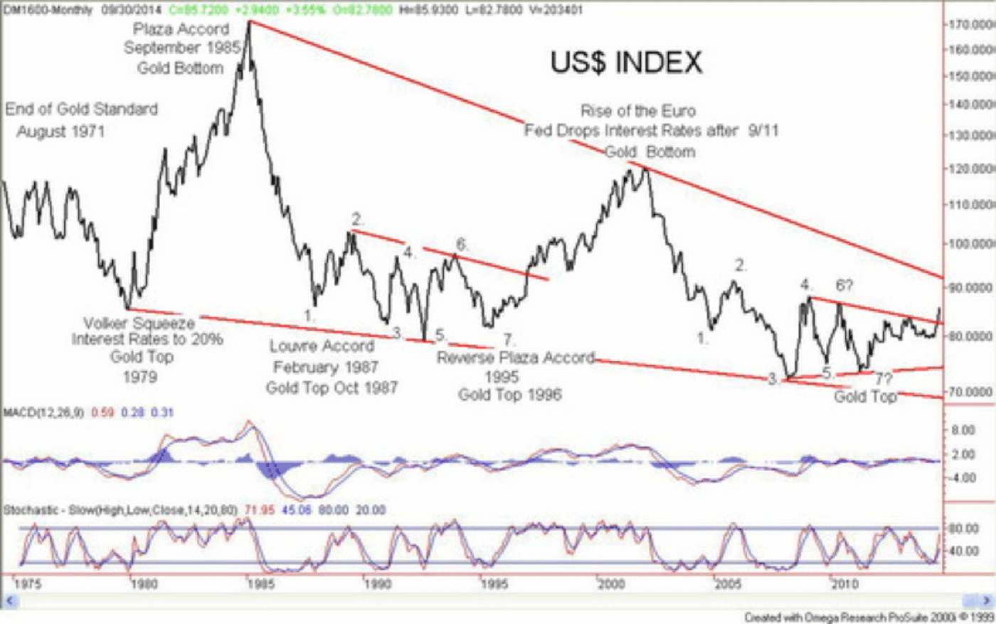 The Soaring US Dollar!David Chapman (Click on image to enlarge) Charts created using Omega TradeStation 2000i. The US$ has been soaring. Since making a low in May 2014 just under 79 the US$ Index has jumped almost 9% to over 86. If the US$ is rising other currencies must be falling. The Euro has lost almost 10%, the Japanese Yen has fallen 7%, and, the British Pound has lost about 6%. Those three make up 57.6%, 13.6% and 11.9% respectively of the US$ Index. The Cdn$ makes up 9.1% of the US$ Index and has lost 5%. Oh yes, gold has fallen about 10% in the same period. Gold may not be a part of the US$ Index, but many consider it to be an alternative currency. When one looks at a very long-term chart of the US$ Index it doesn’t appear as if the US$ is soaring. What it does show is that the US$ Index could be breaking out of seven point bottom pattern. The US$ Index has done this before. The last time was following the long 1987-1997 bottom pattern. The breakout occurred in February 1997 and had an objective up to 121. The high was made at 120.80 in January 2002. The current long bottom has been forming since 2004. Once again, the breakout appears to be occurring ten years later. The potential objective is up to 104.75. There is potential significant resistance at 92 based on the long downtrend line from the 1985 top that aligns with the 2002 top. If this is correct it has potential negative ramifications for the currencies that make up the US$ Index and for gold. Gold has tended to top or bottom inversely to tops or bottoms for the US$ Index. The Volker squeeze of pushing interest rates to 20% got underway in December 1979. Gold topped in January 1980 at around $850. The Plaza Accord was formed in September 1985 in order to combat the sharp rise in the US$. Gold bottomed in February 1985 near $280. The next most important event for the US$ was the Louvre Accord in February 1987. The Louvre Accord’s goal was to stabilize international currency markets and halt the sharp decline of the US$ at the time. Gold topped in December 1987 at around $500. The Reverse Plaza Accord of 1995 was to bail out the Japanese economy that was under extreme pressure because of a huge rise in the Japanese Yen. Gold topped in February 1996 at about $418. Gold made its major bottom in February 2001 which was about a year before the top seen in the US$ Index in January 2002. There was no particular accord at the time but the Euro came into existence in 1999 but it wasn’t until 2002 that notes and coins began to circulate. The rise in the Euro coincided with a long decline for the US$. Gold topped in September 2011 not long after the US$ Index made what thus far is its final bottom in February 2011 near 73. So what is driving the US$ to new heights? Well it is not so much a strong US$ but a weak Euro. The EU economy is showing signs of falling into a recession even as the US economy appears to be holding with low growth. Japan is also falling once again into recession. There has been constant chatter of the US raising interest rates. That is not the case in the EU where there are now negative interest rates nor in Japan where interest rates remain at record lows. Longer-term interest rates in the US remain above those in both the EU and Japan. Tensions in Ukraine between Russia and Ukraine are negatively impacting the EU because of sanctions placed on Russia. Tensions in the South China and East China seas between Japan and China are negatively impacting Japan. Is this the scenario often outlined by Goldman Sachs and others that gold is to collapse to $1,050? It is possible. The EU and Japan are entering an important deflationary cycle and the US$ has become the major recipient. The concern in a deflationary cycle is insolvency. While US Treasuries have been the major beneficiary of the rush into US$ it is noteworthy that weaker credits are actually falling in value even as US Treasuries rise in value. There are numerous concerns of insolvency in the Euro zone and in Japan. Sanctions against Russia are triggering trade wars. As everyone supposedly learned during the Great Depression trade wars are a lose-lose situation. Maybe they didn’t really learn anything. Debt is fine as long as it can be serviced. But the debt levels in the western economies has reached potentially catastrophic proportions. The US has a total debt to GDP ratio of about 350%. Officially reported US debt levels according the Federal Reserve Board is about $58 trillion against a GDP of $16.6 trillion. The US also has unfunded liabilities of about $116 trillion. Japan’s total debt to GDP is around 650%, the Euro zone is at 450% as is Great Britain. For all OECD countries, the total is north of 400%. Back in 1990, total debt to GDP for the OECD countries was generally no higher than 200%. It is with the debt where the seeds of the next collapse lie especially given low savings rates in most of the OECD countries. While the US$ appears to be rallying now it could set up the next US$ collapse. The US$ is under attack from both China and Russia in particular. Gold is cheap right now but everyone is reminded that during the deflationary 1930’s gold rose both officially when FDR raised the price of gold in 1933 and gold stocks rose over 400% even as the Dow Jones Industrials (DJI) was losing almost 90%. Gold is driven by fear. Fear of monetary collapse. Right now it is the US$ that is benefitting but when the US$ turns as it has in the past in 1985 and 2002 gold prices rose sharply. The previous sharp rises for the US$ played out over five/six years. This time the cycle is liable to be considerably shorter given the growing pressure on the US$ from the sanctions against Russia. According to Michael Kosares China believes that gold is the buy of the century (Michael J. Kosares – Why China thinks gold is the buy of the century – USA Gold Publications). China wants to hold as much gold reserves as the US holds. The US holds 8,133.5 metric to
