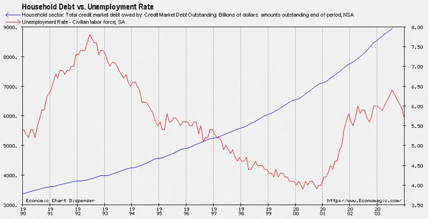 This chart compares the Unemployment Rate (left scale/red line) and Personal Consumption (right scale/blue line). All it takes is a glance to realize that both have risen simultaneously. How can that possibly be? An increasing number of people were losing their jobs, yet we were still buying with conviction and at an ever increasing rate. This was our third consecutive year of rising total unemployment with over 3 million more workers unemployed since 2000. Of those losing their jobs, just over 1 million became unemployed since the recession officially ended and our robust recovery began in late 2001. Recovery? Robust? Look at the rise in the unemployment rate in early 2003. I would expect a flattening or reversal of personal consumption, but instead there's an upward pivot. No wonder our trade deficit is out of control and increasing at an unsustainable rate. So, how are we paying for this (robust recovery)?