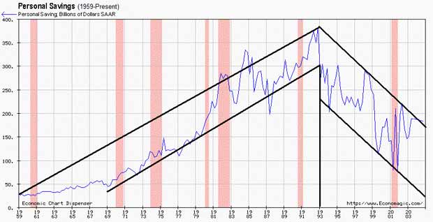 This chart shows Personal Savings since 1959. The first third of the chart would represent my parents, who were born in 1935-36, and their "second hand" generation alone. The trend is stable and steady as they demonstrated the lesson of saving learned from their parent's direct, "first hand" Depression Era experiences. The middle third brings on the early Baby Boomers whose parents were children during the Great Depression. That means they learned their lessons "third hand" from their grandparents through their parents. Notice how the volatility increased, but the trend remained intact. As a tail end Baby Boomer, I can't take responsibility for helping the continuation of the uptrend to its peak, because I wasn't a saver right out of college. I think this is common. Regardless, even throughout the recessions (pink shaded areas) they all demonstrated a commitment and resolve to saving throughout the uptrend. Notice the topping and trend reversal. My parents were retiring around this time and the bulk of saving was now left to the "third hand" Baby Boomers. Lesson dilution was likely a partial cause of the reversal as savings were used to sustain the upward trend in consumption. That dilution was brought on and supported by the belief that 401k's would generate +20% returns forever. That wealth effect was also fueled by overvalued homes that left the "third hand" feeling "rich" absolving them of any responsibility to save for the future. After all, their cash-out refi appraisal was tops in the neighborhood. It became, "Sure, we can afford that; there's plenty of money for the future. The stock market is up and my house has doubled in value in the last 5 years!" The consequence, however, was an increase in M2 velocity throughout the late '90's as those "at rest" savings were withdrawn and squandered. This resulted in an increase in economic activity that expanded the aggregate money supply. Notice the recent test of the top of the downtrend channel. M2 velocity has been slowing since 2000 and this may add further weight to the evidence suggesting a possible move toward M3 contraction. The downtrend also coincides with the entry of the "third hand" Baby Boomers' children into college or the work force. Those "fourth hand" children, who think Gold is only used for Rapper medallions, observed their parents spending habits and they needed---no, expected---new cars, computers, clothes, etc. I have to ask: Absent any significant change in the status quo, what trend do you think the saving habits of our "fourth hand," "budding young adults" will take? Unfortunately, most "first hand" experience is gone now and the lessons have ceased, faded, or fallen on deaf ears. It all became clear to me. We've turned into a "What's my monthly payment?" society where we don't care how much things really cost. Artificially low interest rates, easy money, and a belief that Social Security really is secure have been the catalysts that triggered our willingness to take on increasing amounts of debt while sacrificing our future savings to sustain addiction to an ever increasing amount of consumption. This cannot last. History will repeat and the lessons will be relearned. When I was a "budding young adult" I asked my Dad, he's the smartest man I've ever known, why I had to work hard labor jobs (like pouring concrete) when he could've just given me the money for a new car or paid for my college. His answer represents the greatest lesson of my life, he said: "I never wanted to deny you your opportunity to suffer." It was simple, straightforward, and brutally honest. Through suffering you didn't take things for granted, you learned to work hard and appreciate what you had, and most of all, you learned to live within your means while saving for the future. Based on my observations of these "budding young adults," whose parents both work to pay for their new car, clothes, and college education, it looks like they'll soon have their opportunity to suffer. As the gusty winter winds begin to howl, I now understand Kondratiev. The "fourth hand" becomes the "first hand" to future generations. Furthermore, rather than being viewed as a problem that requires confiscation, outlawing, and active suppression, in this wave Gold rises as the solution. David Chuhran Copyright ©2004 David Chuhran. All Rights Reserved |
