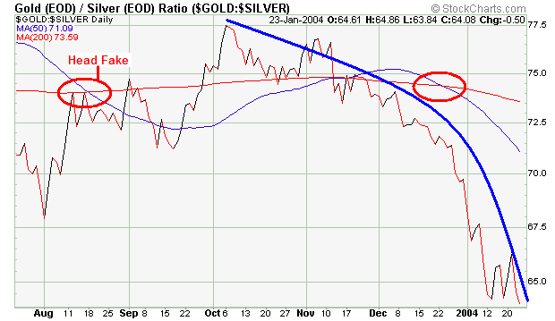 Recently, when I plugged in the GSR I hadn't changed my chart settings, so it came up daily/6 months. The shear slope of the drop gave me reason to believe there might be a dramatic trend change in progress. I missed seeing it earlier by just watching the ratio numbers and we're now looking at a ~17% drop in the GSR in the last ~3 months. In other words, one ounce of Gold bought 77 ounces of Silver in October, but now only buys around 64 ounces. That's a significant shift! When you consider that the price of Gold (POG) broke through and held above $400 during that same period, which were new 7+ year highs, it makes it even more dramatic. Also, notice the Silver bullish (no bears in sight) crossover of the 50/200dma (right, red oval) with both appearing to turn down suggesting a potential continuation. (I'll address the head fake later.)
