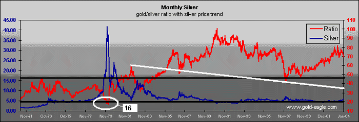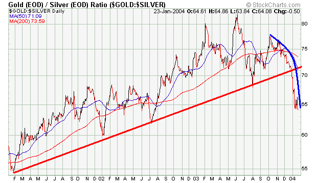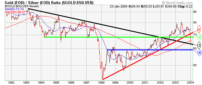 would only look, they would see that. Most of us have only known fiat paper's claim to legal tender status. This has shaped our frame of reference leaving no room for other alternatives, but Gold is the only "real" money. There's a 5,000 year history as proof and nobody can change that. No printing press operator or paper futures market maker can or will exert total control, forever. Entities or groups of conspirators may try to interfere with the natural monetary order, and they may have some measured success, but they will never be able to suppress the ultimate power of Gold in perpetuity. Gold is a threat to the "Puppet masters" who are desperately trying to steer their unwieldy fiat money regimes. As we watch their grasp begin to slip, it becomes easier, at least mentally, to price "things" in terms of Gold units or ounces. I always try looking at the big picture, first, and then I zoom in. Normally it's the macro-Hubble telescopic view, followed by the wide angle binocular view, culminating in the conclusive electron microscopic view. This time it didn't happen that way, so I'm going to present it to you the same way it first appeared to me. I've been aware of the rapidly rising price of Silver (POS), but I had dropped the $Gold:$Silver Ratio (GSR) out of my chart crosscheck. I would look at the daily ratio number, but not the chart. Before proceeding, it's important to note that Gold is in a secular bull market. Gold is reasserting itself, through natural market forces despite 20+ years of Herculean efforts to the contrary, as the primary global monetary influence. It's just a matter of time and Gold is a patient, self confident store of wealth. It lies in wait, ever so slowly climbing the steps back to its rightful place atop the monetary throne. About 2 weeks ago, while perusing the charts, I plugged in the GSR and what I saw really grabbed my attention. Since then, I've been watching and it's now time to throw some more technical facts on the table.