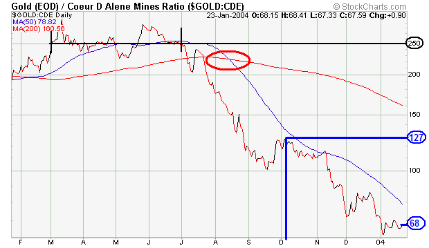 The first thing I noticed was that this trend developed ~8 months ago in CDE signaling the future GSR trend. One stock is not enough, but before I go and confirm this across a broader cross section of the Silver sector, I want to point out the 50/200dma cross in August (red oval). Even though the GSR head faked then (previous chart at top) with a zigzag before crossing again in October, CDE priced in Gold crossed and the gap has widened as both moving averages continue descending. Also, in October one ounce of Gold bought 127 shares of CDE, while now an ounce of Gold only buys 68 shares. That's a whopping 46% drop in ~3 months! (I'm going to only focus on the last ~3 months, but notice March-July where one oz. bought ~250 shares of CDE.) There's a message here!