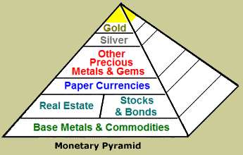 So, how could we value everything in Gold? As it stands now, most everything is valued in the World's Reserve currency, the US dollar. After that, all currencies are cross-compared in the Foreign Exchange markets as conversions exist between the yen-euro, euro-pound, yen-peso, ruble-yen, etc... but even Gold is primarily valued in dollars. What if we changed all that and allowed a natural market-based valuation to occur for everything based on a troy ounce (or metric ounce) of Gold? While I doubt we'll have the will to do this voluntarily, because it would likely cause a dollar whiplash and subsequent economic pain, I believe Gold is in the process of re-monetizing on its own. The problem is that it's happening without any definitive direction; and we must prepare for the possibility that Gold may rise to the top of the pyramid on its own through natural market forces. Physically placing Gold atop the global monetary pyramid would remove the necessity to pass things through the dollar or have complex monetary conversion tables. It also removes the reins of power from the central bankers. Everything everywhere in the World should be priced in both Gold and the local paper money, and payment should be accepted in either. The Gold prices for various things would likely remain constant and stable while the paper prices would fluctuate. The World over, you could pay in Gold, if you choose, and receive your change in local paper. You could also pay in local paper and receive Gold coins as change. The system would be simple and easy to understand after the rather tumultuous, but necessary, adjustment period. For example, it doesn't matter if you want to price things in ounces of Gold or show how many things one ounce of gold buys. Here's how it would look under that system: At the opening on Monday, 8 Mar, 2004, one ounce of Gold equals: $401 US This makes things plain, clear, and simple cutting across all economic, political, cultural, religious, lingual, and physical borders. There would no longer be a need for any other conversion charts or exchange rates. It's easy to see that $401 US=€322 Euros, 57.70 ounces of Silver=8.30 shares of GM, and £216 Pounds Sterling=10.78 barrels of Oil. If this were implemented and new Gold coins went into global circulation, then those undisciplined countries willing to debase or expand their money supply would be automatically punished in the marketplace as their currency's value would drop relative to Gold. Those countries who try to cheat by removing their restrictor plates, would find themselves alone on the track racing a race that has already ended. In reality, they actually just create an excess money supply that would be met with little additional demand forcing a drop in the value of their paper currency relative to Gold and everything else of value on the pyramid. You may think this devaluation would be equivalent to what's happening to the US dollar now, and that it would provide a competitive advantage in the global marketplace, but it would be different. The Gold price of everything would remain stable while the paper price would rise providing no long term advantage. Gold would be the "restrictor plate" making all paper currencies relatively equal allowing any imbalances to remain within a narrow and naturally correctible range. The main transitional difference for the dollar comes not from the supply side, but from the demand side of the equation. Currently, demand for the dollar remains high, for many reasons, even as it's being mindlessly created by the Fed's errant inflation of the money supply. There's no alternative; the dollar is the World's reserve currency, so many transactions, like oil purchases, still require a conversion to dollars for payment. That wouldn't be the case if Gold became the reserve currency. If that came to pass, the dollar would face a punishing decline due in part to the lack of transactional demand and money would flow away from the bond markets sending yields (interest rates) skyward. Even though the transition period would be painful, discipline would finally be restored in the monetary system forcing everyone, especially the Politicians, to act financially responsible. Gold alone can regulate the inflation of the paper money supply while also naturally setting interest rates. The Federal Reserve would no longer be necessary. The US Constitution made Congress, not the Fed, responsible for establishing and regulating our monetary system. This is clearly stated in: Article. I, Section. 8, Clause 5: To coin Money, regulate the Value thereof, and of foreign Coin, and fix the Standard of Weights and Measures. When the framers said, "coin," they didn't mean paper or wooden nickels, they meant Gold or Silver. Silver is a viable supplement to Gold, but not a replacement. In the same sentence, the Congress is also tasked with setting the "Standard of Weights and Measures" and with regulating the "Value" of money. Aside from the broader use of weights and measures, to me this means that the coins should have weight that relates to their value. In fact, one way to regulate the value of "foreign coin" is to make our coin's face value equal its weight and then place these Gold Coins atop the monetary pyramid valuing everything relative to that weight. Assuming the foreign coins are of equal fineness, then their value is only a function of their weight. The framers didn't intend for Congress to delegate this authority. Regardless, they cannot delegate their responsibility. And, the Fed was legislated into existence; it can also be legislated into extinction. The Fed has run our monetary system by their made-up rules ignoring the Constitution. That current system will eventually suffer a rollover. The Fed can try to keep this race going, or they can try to start a new race by creating"new" One World "Fiat" Money. Both options are desperate attempts to hold onto power by avoiding the discipline exerted by the honest and fair 