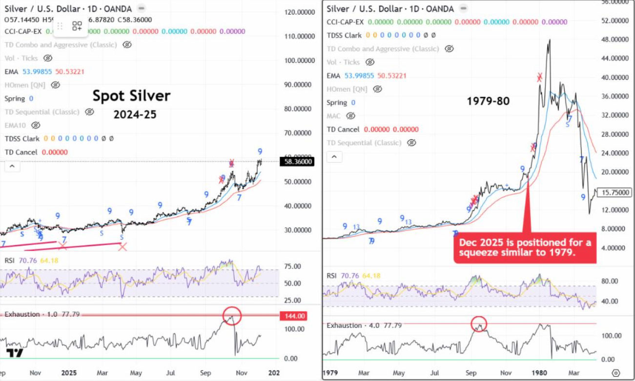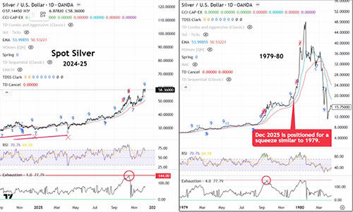 Silver SqueezeRoss Clark The squeeze in silver is on, matching that of 1979-80, as it has held at the 50-day EMA rather than breaking through to the 150-day EMA, which is typically seen after most upside Exhaustion Alerts. The low of December 4th is the new make-or-break support. The upper channel lines project resistance around $75 and $125. The silver miners outperformed bullion from Q1 through Q3, as seen in Q4 1979. They appear poised to break through the October highs, but not run as hard as bullion. (Click on image to enlarge) ### Ross Clark