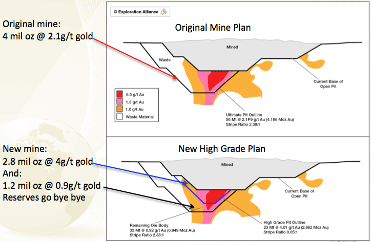 (Fig. 3: Real life example of change in mineable reserves due to high grading a deposit. In this case, the original mine plan consisted of 4 mil oz @ 2.1g/t. But selectively mining 2.8 mil oz @ 4g/t in the new high grade plan leaves 1.2 mil oz @ 0.9g/t that are uneconomic. Effectively 30% of the resource is no longer economic, and will require significantly higher real gold prices to make money.)