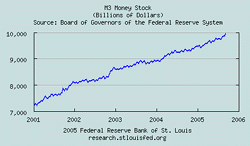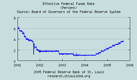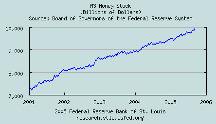 So you can see the conundrum he is in: both "core inflation and longer-term inflation expectations have remained well contained, but pressures on inflation have stayed elevated." That's one job I wouldn't want to have - walking a tightrope over a pit of lions is easier work if you can get it. I'm not sure if you have to be a juggler or a balancing expert to qualify for the job. Being a master magi couldn't hurt, however. But On The Other Hand But as we have said, Sir Alan doesn't want to pop the housing bubble, which means that he must offset rising interest rates. Now how does he pull that one out of his hat - he just creates lots of money and credit through prestidigitation. How do we know that the Chairman is saying one thing while doing another? Take a look at the money supply chart below in comparison to the federal funds rate chart, which do you think is rising faster? The broadest U.S. money supply measure is M-3, as shown in the chart below. It was up $32.4 billion in the latest week. In the last 3 months, M-3 has been up $216 billion, which equates to an annualized rate of almost a trillion dollars a year. And that's just the money supply. In paper fiat land credit is just as good as money. We will place a chart of the Fed Funds Rate side by side for a quick comparison. Basically look for the steepest ascent of the little blue lines.