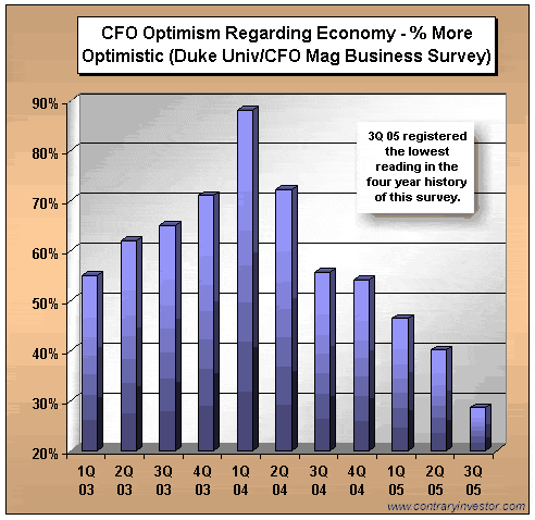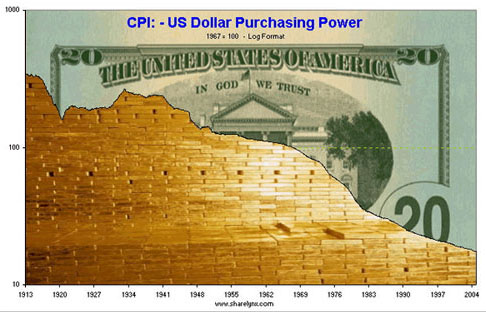 For those interested in reading about the history of gold as Honest Money we offer the following as pretty good reads on the subject: Honest Money, GOLD: Sovereign of Sovereigns, Silver IS Money. Gold's power and secret is that it is no man's liability, it is no man's promise or obligation to pay - it is payment, and has been so for 5000 years. Paper fiat as floated today has been around for a couple of hundred years, and that is even arguable, but another story for another time. The big lie is that money and debt can be one and the same. They can't. You can not pay a promise to pay with another paper promise to pay. That is not payment. That is just rolling over the debt. Promises for more promises - to pay. Debt transference. Nothing more, and a whole lot less. When debt is allowed to circulate as the currency - as debt-money - there is hell to be paid. The day of reckoning, the weighing in the balance, keeps getting pushed off farther into the future; but make no mistake about it, the day of atonement will come - if not by us, then by our children, and their children, which isn't the best of legacies to leave your loved ones. Leave them some gold instead. As a picture is worth a 1000 words we will now provide a picture of total America Debt (which is on the books, as there is another like amount not on the books, what the magi's call off-budget or unfunded liabilities), and a picture of the loss of the purchasing power of the United States Dollar Bill, known as a Federal Reserve Note or promise to pay - a debt instrument. ![]() Courtesy of Michael Hodges The Grandfather Economic Report ![]() Chart courtesy from Sharelynx at www.sharelynx.net Confidence The above state of affairs is what has led to a bit of a falling out of confidence among CFOs in America. How do we know? Take a look at the chart below. Seems they are aware of the rising debt levels, higher costs, and the loss of 95% of our currencies purchasing power - maybe that's why they are chief financial officers: ![]() Courtesy of Duke University and contraryinvestor.com All of which adds up to a kind of queasy feeling in the pit of one's stomach - like we're involved in some con-fi-dence game of sorts. Here you take my debt and I'll trade you it for mine. Let's rob Peter so we can make believe to pay Paul. It just doesn't work like that folks - and I don't care what they tell you - if they do - they speak with forked tongue, as the Indians can attest by the terrorist attacks they were subjected to a few hundred years ago in the land of milk and honey. Be not deceived, they do not want you to know the Truth. The Truth is that Gold Is Honest Money. Debt is a four letter word of evil as presently peddled about. There is nothing wrong with debt - if it is debt created by the loaning of Honest Money, had by honest work, owned by those that earned it, and then lend it, by honest dealings with honest interest rates. Honest. But when our money is paper fiat debt-money, it is dishonest money, and can only facilitate wealth transference from the many to the elite few. We The People need to stand up and reclaim our constitutional freedoms - our self-dignity and unalienable rights. Honest. Power to the people, as it was the people that gave birth to the Constitution; it was the people that gave birth to our Country; it was the people that gave birth to the government. It was and Is about - the people. We The People are Sovereign Gold is the Sovereign of Sovereigns - remember it well. Douglas V. Gnazzo ©2005 Douglas V. Gnazzo. All rights reserved.All other views and comments are invited.