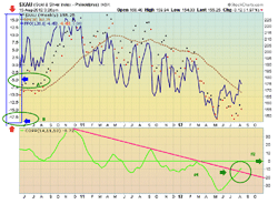So What Does it Really Mean??Denaliguide's Summit (Click on image to enlarge) Above you see the best of the worst, the Phila Gold & Silver Index XAU. They are the biggest companies and some of the nastiest, IMO, until they change their Low Down Ways. HOWEVER the jagged blue line measures how far above or below (by the % Scale in the Blue Box on the Left Margin) the actual price be it XAU, GDX, GDXJ or whatever is below its 30 Week Moving Average. The XAU is the most sluggish and in recent history has been as low as 17.5% below the 30 WK MA, and has moved up to just 5% under that MA, you can see via the A & B blue arrows. See the chart here. Underneath that in LIME GREEN, breaking a trendline to the upside is the Coppock Curve - An oscillator that uses rate-of-change and a weighted moving average to measure momentum, that it breaks the trendline to the upside is significant in momentum terms and with the Relation (% of 30 WKMA) changing positively, it indicates the kind of Sea Change that we have been getting hints and glimpses of since March of this year. Its real, its here, and its really here NOW! Green Arrow #1 shows the trendline break, and Green Arrow #2 pinpoints the Zero line, which in some systems marks a change to absolute positive momentum. We should see that cross soon..... It doesn't take a Genius to see the trends are changing. As time elapses we will see more and bigger illustrations of stuff like this, until the uptrend becomes evident. SO WHAT DOES IT REALLY MEAN?? I take from the above, that whatever the market forces, whether they are algo's, quants, really frightened Europeans or speculators, are driving the price/relationships of Gold and Silver mining stocks in a reversal of previous patterns, which IMO will lead to higher prices through a slow stair-step up-hill grind, punctuated by dazzling rallies and frightening corrections. So hold and buy your competent, non-hedged, un-royaltied Miners. Like eating your veggies, it will be good for you. Subscribe now 4 Free issues, then $29.93 mo'ly, no contract, Blog - http://www.denaliguidesummit.blogspot.co.uk/ ### Denaliguide's Summit About this Blog - The information herein is believed to be correct and obtained from sources believed to be reliable. The author assumes no liability for information in error from any source. The information and opinions posted here are for EDUCATIONAL PURPOSES. Investment and speculative decisions are properly supported by Due Diligence and proper support, and the author assumes no responsibility for any private investment decisions made by readers of this blog. Copyright@2012 Denaliguide Summit, All Rights Reserved. |