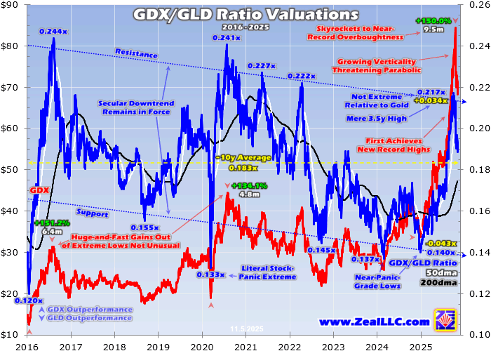 Gold Stocks Not OvervaluedAdam Hamilton Gold miners' stocks have skyrocketed this year, hitting extraordinarily-overbought levels a few weeks ago. With gold in a similar exceedingly-stretched technical situation, that necessitated big-and-fast drawdowns in both which are now underway. Yet despite those gross excesses, gold stocks still never neared extreme valuations. Not being really-overvalued argues this powerful gold-stock bull will resume after this selloff. Gold stocks are 2025's Cinderella story, shining as the belle of the market ball after being forgotten and neglected for years. The leading GDX gold-stock ETF reclaimed some long-lost popularity as this year marched on. At its latest interim high in mid-October, GDX had soared a stupendous 149.0% year-to-date! That amplified gold's parallel 65.8% soaring over this same span by 2.3x, in GDX's usual 2x-to-3x range. Gold stocks' massive gains this year accrued in a sustainable trajectory until late July, when their Q2 earnings season was spinning up to full-swing. The major gold miners dominating GDX were reporting epic record results, their best fundamentals ever by far. That started attracting professional investors even though gold was then mired in a months-old high consolidation. Their capital inflows goosed this sector. Gold stocks are ultimately leveraged plays on their metal because of their inherent profits leverage to it. Consider the example of those Q2 results. In the comparable Q2'24, GDX's top-25 gold miners averaged all-in sustaining costs of $1,289 per ounce. The average gold price that quarter ran $2,337. Subtract the former from the latter, and these major gold miners as a sector were earning about $1,048 per ounce. Fast-forward a year to Q2'25, and those GDX-top-25 average AISCs surged 10.5% year-over-year to $1,424. Yet that was much slower than gold prices, with their quarterly average soaring 40.6% YoY to a dazzling record $3,285! So implied unit profits ballooned to a record $1,861, skyrocketing fully 77.6% YoY! Thus the 44.8% jump in quarterly-average GDX prices between Q2'24 and Q2'25 was more than justified. Such fundamental analysis is really important, but challenging to do. Reading many dozens of quarterly reports and collating their important data requires much expertise, experience, and time. I'm hard at work digging through new Q3 results as they are released, and hope to write my 38th GDX-top-25 quarterly-results essay in a row next week. This latest Q3'25 will almost certainly prove another best quarter ever! The spreadsheet resulting from that nearly-decade-long research thread is massive and complex. But all that data accumulated over many years proved gold stocks were nowhere near overvalued as Q2 ended. Q3 is tracking the same way at this point. This new Q3 read is particularly important because over the subsequent couple-plus weeks after quarter-end GDX would soar to near-record overboughtness in mid-October. Overvalued means stocks are priced too high relative to their underlying corporate fundamentals. That is very different from overbought, a technical term meaning stock prices have soared too far too fast to be sustainable. Extreme overvaluation slays secular bulls, while extreme overboughtness just necessitates healthy rebalancing selloffs within them. While GDX wasn't extremely-overvalued, it was crazy-overbought. In mid-October GDX soared an astounding 62.9% above its baseline 200-day moving average! I had warned about that mounting extreme overboughtness and its resulting risks in a late-September essay GDX Super-Overbought. Because of that we then ratcheted up the trailing stop losses on our extensive gold-stock trades, to protect more of their massive unrealized gains when that inevitable selloff eventually hit. GDX at 1.629x its 200dma happened to be its third-most-overbought close in the entire 19.4-year history of this original gold-stock ETF! That ranked as top-0.3% levels of overboughtness, and gold itself was stretched way up to its own top-0.3% overboughtness since 1971! So some reckoning was coming to rebalance extraordinarily-extreme technicals and excessively-greedy sentiment, and soon hit like a sledgehammer. GDX plummeted 6.8% the next day, then another 9.4% two days later! The latter proved GDX's 14th-biggest down day ever! If you want more analysis on those huge GDX and gold selloffs, I wrote a whole essay right after they happened Gold Stocks Slammed. That carnage stopped out the entire trading books of both our weekly and monthly subscription newsletters, but our tightened stop losses saved huge gains. Those averaged fantastic +182.7% annualized realized gains across thirteen gold-stock trades in our weekly newsletter and a similar +181.8% across six in our monthly! But just because gold stocks had hit dangerous extremely-overbought levels didn't mean they were also extremely-overvalued. Despite the colossal gold-stock gains in 2025, this sector had been deeply-undervalued for years before this soaring. Starting from such battered levels, this sector still hadn't climbed high enough to reach potentially-bull-slaying valuations. While gold miners' quarterly fundamental data definitively proves that, Q3'25's earnings season hasn't concluded yet. In the meantime, a great easy proxy for how gold stocks are valued relative to the metal that overwhelmingly drives their profits is a simple construct called the GDX/GLD Ratio. It merely divides GDX's daily closes by GLD's, the leading and dominant gold ETF. When charted over time, swings in this ratio reveal whether gold stocks are cheap or dear compared to the metal they mine. This chart looks at the last decade or so of GGR action, roughly the same span that I've been doing my deep quarterly research on GDX-top-25 results. In mid-October gold stocks never hit extreme overvaluations!
