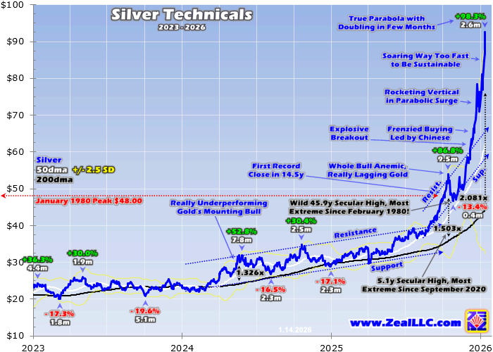 This unsustainable silver bubble is actually quite new. Since silver's "market capitalization" is way lower than gold's, the white metal tends to way outperform the yellow one historically. A month ago in my last silver essay, I found estimates of the values of known aboveground silver and gold globally. Silver's was running about $3.7t in mid-December, less than 1/8th gold's size! Smaller assets have proportionally-less inertia. So a big part of silver's historical allure has been its amplification of gold bulls, about doubling their gains. Yet as recently as mid-October, silver remained woefully shy of that precedent. At gold's initial peak then, it's epic monster bull had powered 139.1% higher since early October 2023! That was gold's biggest bull in dollar terms since 1971, which means ever! Before that year the US dollar had been legally pegged to gold. Yet over that same 24.5-month span where gold achieved 93 record closes, silver only hit 7 all in October 2025. Its total bull run paralleling gold's mighty one was only 157.6%, for pathetic 1.1x upside leverage! So silver continued to really lag gold just 3.0 months ago. Silver's bull was otherwise healthy then, showing no indications it would soon shoot parabolic. Yet silver still surged to really-overbought levels as gold peaked. For short-term market directionality, absolute price levels don't matter much at all. Vastly more important is how fast prices got there. That can be measured with various indicators revealing overboughtness and oversoldness. One of the best and my favorite simply divides prices by their 200-day moving averages. These 200dmas are fantastic baselines, moving slowly enough to reveal extremes yet still gradually evolving. In mid-October when silver initially crested at $53.94, it had stretched 50.3% above its 200dma. Stated as a ratio, that Relative Silver or rSilver metric was running 1.503x. That proved a 5.1-year secular high, the most overbought silver had been since early September 2020! So like gold, silver definitely needed a breather. Periodic drawdowns are healthy and essential in bulls, rebalancing stretched technicals and sentiment. Indeed from there silver corrected fairly-hard, plunging 13.4% to $46.70 in just seven trading days! That mirrored a sharp gold pullback of 7.4% in that span, for normal 1.8x downside leverage. History argued gold's drawdown should've grown much larger, but it was short-circuited by frenzied Chinese buying. And because of the record government shutdown then, that was obscured by crucial gold-futures data going dark. As gold bounced out of that largest selloff of its epic monster bull still at just 9.5%, silver recovered with it. That was righteous for six weeks or so into late November, with gold still down 4.3% from mid-October's peak while silver managed a better 1.4% loss. But then during the Black Friday half-day session right after Thanksgiving, something changed. Silver rocketed 5.5% higher that day on a mere 1.3% gold surge! Long writing both weekly and monthly subscription newsletters, every single day I stay deeply immersed in the markets. Studying them is my lifelong passion, so I love this aspect of my work. That includes taking one-to-two pages of notes including intraday-chart screenshots as every US trading day wraps up. Those observations underly all our newsletters and essays. Nothing on Black Friday explained silver's surge. But a couple weeks later as silver started blasting higher again in mid-December, it became apparent frenzied Chinese demand was the main driver. Striving to grow wealth is far-deeper-ingrained in Chinese culture than even America's. So Chinese people are generally much more attuned to markets. Thus when some asset surges dramatically, popular speculative manias take root quicker. And silver's timing was perfect. Chinese culture has venerated gold for centuries, unlike in the West where most investors largely ignore it. So when gold soared nearly a third in just a couple months deep into new-record territory into mid-October, Chinese investors felt they were missing out. Per-capita incomes in China are less than 1/6th of Americans', making gold even harder to afford for Chinese investors despite fractional-ounce bullion offerings. China's ruling Communist government also imposes strict capital controls, so Chinese investors don't have many options for parking capital out of that economic system. But gold and silver investment remain legal, and precious metals have intrinsic value independent of countries' economies and currencies. With silver accelerating in late November, Chinese traders took notice then started chasing in earnest in early December. Despite gold only climbing 0.5% on December 9th, silver blasted up 4.5% besting $60 per ounce for the first time ever! Chinese investors worried they had missed the boat on gold's record-shattering bull run pounced on way-more-affordable silver's. Their subsequent increasingly-frenetic buying during the five weeks since largely fueled silver's popular speculative mania, though Western investors chased Chinese gains. Those flames of herd greed were further fanned on December 22nd, the Monday opening the holiday-shortened Christmas week when many if not most Western traders check out. That was a quiet news day with no catalysts according to my notes that afternoon, but gold still soared 2.4% to $4,442. That proved its first new record close since mid-October's $4,350 peak nine weeks earlier! That supercharged silver greed. That Christmas week alone with Chinese fear-of-missing-out chasing dominating precious metals, gold surged a major 4.4%. Yet silver was ground-zero for that manic rush, soaring a stupendous 16.9% for epic 3.9x upside! That stretched silver way up to 1.878x its baseline 200dma, the most overbought it had been since early March 1980 a whopping 45.8 years earlier! I thought about writing this essay then, but held off. Why? Despite silver skyrocketing to extremes, then it 