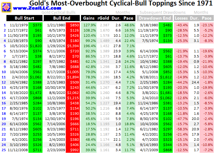 Gold Extremes' DrawdownsAdam Hamilton Gold just soared to some of its most-overbought levels on record, climaxing its largest cyclical bull ever. That was followed by one of gold's worst down days in history, formally slaying that monster bull. That popular-speculative-mania topping means a serious reckoning is underway. Gold's drawdowns after past extremes offer insights into the likely magnitude of the carnage traders need to gird themselves to expect. Since 2000, I've written 1,212 of these weekly web essays. That discipline has led to a well-established workflow to release them on time. Wednesday mornings I decide on relevant topics, then that day I do all the necessary research including building spreadsheets and charts. The essays are written and proofed on Thursdays, finalized by that day's close. Then Friday mornings I do one final quick proofread before publishing. Last Thursday the 29th, it was a different world when I penned an essay warning about gold's popular speculative mania. Gold closed at an all-time record high of $5,394 that day, its eighth in as many trading days. In that short span alone, gold had soared an astounding 17.6%! That annualized to a ludicrously-unsustainable 550% ascent pace! So I took a hardline contrarian stance in my conclusion that day... "The bottom line is gold has soared into a dangerous popular speculative mania. Gold's recent ascent pace is absurd and wildly-unsustainable, driving its most-extreme overboughtness since January 1980's notorious bubble. That sure didn't end well for gold, nor did the handful of bull toppings where it was more overbought way back in the 1970s. Extreme technicals and herd sentiment portend imminent reckonings." "These have proven big-and-fast selloffs on the order of 20% to 30%, which are necessary to rebalance away mania extremes. While brutal-enough for gold, silver and gold stocks really amplify its big losses catastrophically cratering. Popular speculative manias never last long, their frenzied fear-of-missing-out chasing buying soon burning itself out. The subsequent big symmetrical selloffs are violent and unforgiving." Fortuitously from a timing standpoint, heavy Chinese selling erupted overnight into Friday the 30th. That essay was released that morning, and by the time the dust settled in US trading gold had plummeted an eye-popping 10.3% that day alone! That proved its third-worst daily loss since 1971 in US-dollar terms, which effectively means ever. For all intents and purposes, dollar-gold history was born in August 1971. That's when Richard Nixon catastrophically severed the US dollar from its essential gold standard. That unleashed the near-total dollar devaluation and relentless price inflation ever since. Before January 1934, the dollar gold price was hard-pegged at $20.67 per ounce. Franklin Roosevelt then devalued the dollar to $35.00 per ounce, where it mostly remained until August 1971. Only since then are gold prices market-driven. Had gold kept surging rather than collapsing last Friday, interest in my contrarian essay would've been low. But there's nothing like a top-0.02% down day to galvanize traders to reconsider their to-the-moon outlooks. Since 1971, that 10.3% plummeting was only behind a 13.2% crash in January 1980 and another 12.1% one in February 1983! The main question I heard from readers since is "how bad could this get?" The most-rational and conservative way to illuminate that is analyzing drawdowns after gold's past extreme toppings. In the vast 55.1-year span since January 1971, gold has weathered every kind of market environment imaginable. Gold's trends can be broken down empirically by looking at 10%+ closing moves in one direction before 10%+ countertrend reversals end them. There have been lots of those! In this effective entire dollar-gold history, it has enjoyed 32 cyclical bulls with 20%+ gains. There were also another 10 smaller 10%+ uplegs that fell short of achieving bull status. Those were punctuated by 17 cyclical bears with 20%+ losses, and an additional 24 10%+ corrections. Bulls or uplegs are always inevitably followed by bears or corrections, markets are forever-cyclical. The latter are often proportional. Unbelievably in the 27.8 months between early October 2023 to late January 2026, this latest gold bull powered a jaw-dropping 196.4% higher! Gold nearly tripled in that span without a single 10%+ correction, which is wildly-unprecedented. That makes gold's epic monster cyclical bull that just topped the biggest-ever by far in US-dollar terms! As this table of gold's top-25 bulls since 1971 shows, nothing else is even close.