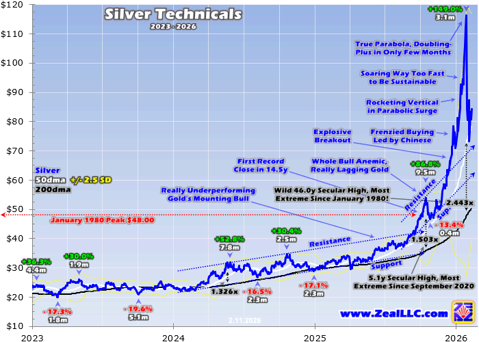 Silver CrashesAdam Hamilton After rocketing parabolic in a popular speculative mania, silver violently crashed. It suffered some of its biggest down days ever in recent weeks, shockingly-brutal plummetings. Silver's past reckonings after extreme toppings failing in crashes argue this current savage selloff remains far from over. Following rare vertical moonshots, silver has suffered big-and-fast symmetrical collapses erasing much of their blistering gains. Even before silver's extraordinary soaring in recent months, it has long had a cult-like following among super-bullish enthusiasts. They brook no dissent from contrarians, attacking any opinions not advancing silver's to-the-moon party line. But like all markets, volatile silver prices perpetually flow and ebb. Upside extremes are always followed by severe selloffs. I warned about silver's extreme parabola in mid-January... "The bottom line is silver has skyrocketed into a dangerous extreme parabola. Silver just soared to its most-overbought levels witnessed since just after early 1980's notorious bubble. In just a couple months after that one, silver hemorrhaged over 3/4ths of its value. And silver couldn't decisively break out above that original parabolic peak until nearly 46 years later. Vertical moonshots are super-risky, nothing to be trifled with." I got a lot of flak for that essay, which I knew was coming when I dared write it. Despite silver parabolas always ending in tears, I've advocated silver investment for over a quarter-century. I first recommended physical silver bullion as a long-term investment in our monthly subscription newsletter in November 2001, when silver traded at just $4.20 per ounce! I've continuously maintained that recommendation ever since. But silver's extreme volatility has always been a double-edged sword. Enormous vertical rallies like this recent one have attracted many true believers. But the extreme technicals and overpowering herd greed at silver's lofty peaks necessitate subsequent rebalancing selloffs to normalize all that. They are usually symmetrical to those red-hot ascents, unbelievably violent. Silver's recent crashes proved that again in spades. From late October to late January, silver skyrocketed a jaw-dropping 149.0% in just 3.1 months! That astounding run included 23 new all-time-record closes, achieved on nearly 3/8ths of its trading days. My quarter-century-plus of historical market studies have led me to define parabolas as doublings within two-to-three months following massive bull runs. Silver certainly fit that bill by mid-January, its extremes were crazy. Absolute price levels don't matter much for near-term market direction, just how fast they got where they are. Overboughtness-oversoldness indicators can be used to measure that empirically. My favorite is simple, dividing silver's daily closes by their 200-day moving average. These are ideal technical baselines, moving slowly enough to illuminate big-and-fast moves yet still gradually evolving to reflect prevailing prices. The resulting Relative Silver or rSilver multiples effectively recast prices as constant percentages off their 200dma. Charting those over time reveals how extreme silver moves are. And holy cow silver stretched to popular-speculative-mania bubble-grade overboughtness in late January. Astoundingly when silver peaked on the 28th, it had skyrocketed 144.3% above its 200dma! That was exceedingly-rarefied territory. Silver usually acts like a leveraged play on gold, amplifying its material moves. Dollar-gold history was effectively born in 1971, when the dollar was severed from its gold standard. Before that gold prices had been hard-pegged to the dollar. Interestingly the dollar was originally on a silver standard for the better part of a century into the 1870s! For analysis purposes now, the modern silver era also effectively started in 1971. In the vast 55.1 years since then, late January 2026's eye-popping 2.443x rSilver read ranked as silver's 16th-most-overbought close! That is top-0.12%, utterly-ludicrous overboughtness levels. The last time silver rocketed parabolic that far above its 200dma was fully 46.0 years earlier in late January 1980! All 15 days ever of more-extreme silver overboughtness occurred in that single month, in an infamous silver bubble. That sure didn't end well, so in our weekly subscription newsletter I added a put-options trade on the leading and dominant SLV silver ETF heading into silver's parabolic topping. Extreme overboughtness never lasts long, and the more extreme it gets the more severe the guaranteed subsequent reckoning. But even knowing all this history and actively betting against silver, what happened next still proved shocking. This chart shows silver technicals in the last several years or so. Silver's parabolic moonshot launching in late October on frenzied Chinese buying utterly dominates all this price action. Again silver skyrocketed 149.0% in just 3.1 months to 144.3% above its 200dma, which was unprecedented outside of January 1980. The early reckoning was way more brutal than I feared, a sledgehammer to the skulls of late silver chasers.