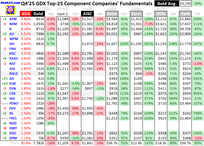 Gold Miners' Q4'25 FundamentalsAdam Hamilton The major gold miners are finishing reporting their best quarter in history! Gold's monster bull run soaring to astounding record highs supercharged miners' results. The metal's massive gains far outpaced rising mining costs, fueling record-shattering revenues, earnings, unit profits, and operating cashflows. These stupendous fundamentals have left plenty of great gold miners still relatively-undervalued despite huge rallies. The GDX VanEck Gold Miners ETF remains this sector's dominant benchmark. Birthed way back in May 2006, GDX has parlayed its first-mover advantage into an insurmountable lead. Its $33.6b of net assets midweek dwarfed the next-largest similar competitor ETF's by nearly 9x! GDX is undisputedly the trading vehicle of choice in this sector, with the world's biggest gold miners commanding most of its weighting. Gold-stock tiers are defined by miners' annual production rates in ounces of gold. Small juniors have little sub-300k outputs, medium mid-tiers run 300k to 1,000k, large majors yield over 1,000k, and huge super-majors operate at vast scales exceeding 2,000k. Translated into quarterly terms, these thresholds shake out under 75k, 75k to 250k, 250k+, and 500k+. Those two largest categories account for nearly 46% of GDX. Last quarter proved remarkable for both gold and GDX. Both soared into mid-October, achieving many record highs in extraordinarily-extreme overboughtness. By then gold had skyrocketed 65.8% YTD to 33.0% above its baseline 200-day moving average, a 19.5-year extreme! GDX amplified gold by 2.3x to colossal 149.0% YTD gains, catapulting it 62.9% over its 200dma to its third-most-overbought close ever! A half-century-plus of gold's own precedent argued a big-and-fast drawdown was necessary from there to rebalance away such extreme technicals and sentiment. Gold quickly fell 9.5% into mid-November, but just shy of correction territory big China-Monday buying kicked in. GDX plunged 19.1% in that span, making for 2.0x downside leverage in major gold stocks' normal 2x-to-3x range. Then they rallied back hard. Gold surged 15.1% into late December, back into new-record-high territory near year-end. GDX blasted up 33.7% or 2.2x in sympathy. So both the metal and its major miners' stocks averaged lofty all-time quarterly-average highs in Q4 near $4,150 and $78.98. They exited 2025 with epic 64.3% and 152.9% or 2.4x gains! Could gold miners' fundamentals possibly justify that moonshot, or was it mostly herd greed? For 39 quarters in a row now, I've painstakingly analyzed the latest operational and financial results from GDX's 25-largest component stocks. Mostly super-majors, majors, and larger mid-tiers, they dominate this ETF at 82.8% of its total weighting! While digging through quarterlies is a ton of work, understanding the gold miners' latest fundamentals really cuts through the obscuring sentiment fogs shrouding this sector. This table summarizes the operational and financial highlights from the GDX top 25 during Q4'25. These gold miners' stock symbols aren't all US listings, and are preceded by their rankings changes within GDX over this past year. The shuffling in their ETF weightings reflects shifting market caps, which reveal both outperformers and underperformers since Q4'24. Those symbols are followed by their current GDX weightings. Next comes these gold miners' Q4'25 production in ounces, along with their year-over-year changes from the comparable Q4'24. Output is the lifeblood of this industry, with investors generally prizing production growth above everything else. After are the costs of wresting that gold from the bowels of the earth in per-ounce terms, both cash costs and all-in sustaining costs. The latter help illuminate miners' profitability. That's followed by a bunch of hard accounting data reported to securities regulators, quarterly revenues, earnings, operating cash flows, and resulting cash treasuries. Blank data fields mean companies hadn't disclosed that particular data as of the middle of this week. The annual changes aren't included if they would be misleading, like comparing negative numbers or data shifting from positive to negative or vice-versa. After decades of deep gold-stock analysis and very-successful gold-stock trading, I knew Q4 was going to prove record-shattering. Back in early January way before any Q4 results came out, I wrote an essay explaining why Q4'25 would prove gold miners' greatest quarter. And the actual results bore that out in spades. My record unit-profits forecast then proved pretty close to reality, but other numbers blew me away.