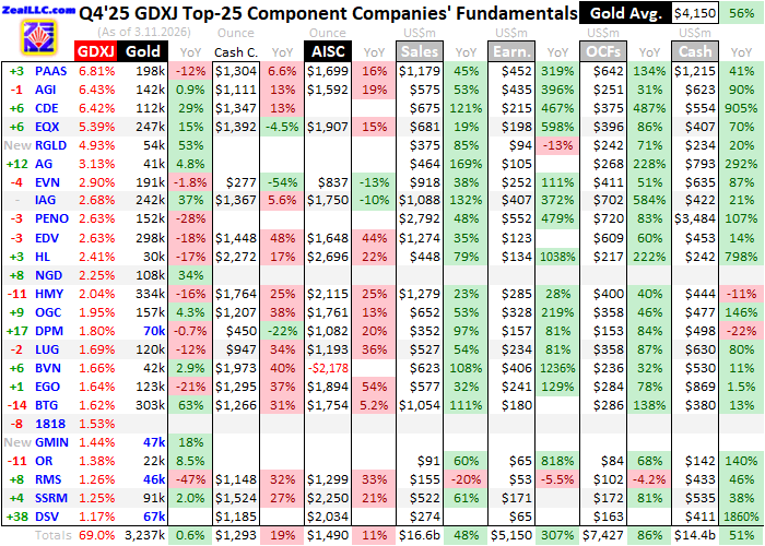 Gold Mid-Tiers' Q4'25 FundamentalsAdam Hamilton Mid-tier and junior gold miners have mostly wrapped up reporting this industry's best quarter ever by far. These smaller gold miners in this sector's sweet spot for upside potential again shattered all records, and again easily bested the larger major gold miners. Last quarter mid-tiers' revenues, bottom-line earnings, unit profits, operating cash flows, and cash treasuries were epic, and amazingly this quarter is tracking better. The leading mid-tier-gold-stock benchmark is the GDXJ VanEck Junior Gold Miners ETF. With $10.6b in net assets midweek, it remains the second-largest gold-stock ETF after its big-brother GDX. That is dominated by far-larger major gold miners, though there is much overlap between these ETFs' holdings. Still misleadingly named, GDXJ is overwhelmingly a mid-tier gold-stock ETF with juniors having lesser weightings. Gold-stock tiers are defined by miners' annual production rates in ounces of gold. Small juniors have little sub-300k outputs, medium mid-tiers run 300k to 1,000k, large majors yield over 1,000k, and huge super-majors operate at vast scales exceeding 2,000k. Translated into quarterly terms, these thresholds shake out under 75k, 75k to 250k, 250k+, and 500k+. Today only four of GDXJ's 25 biggest holdings are true juniors! Their Q4 outputs are highlighted in blue in this essay's table. Juniors not only mine less than 75k ounces per quarter, but gold output generates over half their quarterly revenues. That excludes streaming and royalty companies that purchase future gold output for big upfront payments helping finance mine-builds, and primary silver miners producing byproduct gold. But mid-tiers often make better investments than juniors. These gold miners dominating GDXJ offer a unique mix of sizable diversified production, excellent output-growth potential, and smaller market capitalizations ideal for outsized gains. Mid-tiers are less risky than juniors, while amplifying gold uplegs more than majors. So we've long specialized in the fundamentally-superior mid-tiers and juniors at Zeal, actively trading these smaller gold miners for a quarter-century-plus now. Long ignored by the great majority of investors, the shining mid-tiers are increasingly capturing attention. In 2025 into gold's mid-October peak, GDXJ skyrocketed a phenomenal 161.3% year-to-date! Then they suffered a sharp selloff with their metal in early Q4, with GDXJ plunging 21.6% in under several weeks. But as gold recovered from that same brief rebalancing, GDXJ surged another 38.9% into late December. Interestingly unlike GDX, none of GDXJ's stock-price levels challenged records last quarter. Way back in December 2010, GDXJ had crested at $146.20. That level wasn't finally bested until late January 2026 as gold peaked in extraordinarily-extreme overboughtness. GDXJ's average price in Q4'25 was only $103.33, way under Q4'10's $127.84! Even GDXJ's extreme overboughtness early last quarter wasn't a record. GDXJ soared to 69.5% above its baseline 200-day moving average in early October, which was crazy-stretched. Yet in mid-July 2016, GDXJ had blasted 84.2% over its 200dma! During gold's monster record 139.1% bull run from early October 2023 to mid-October 2025, GDXJ "merely" powered up 262.3%. That made for poor 1.9x upside leverage, way under smaller gold miners' historical tendency of 3x to 4x! After a big-and-fast pullback, gold's epic bull resumed surging into late January 2026 extending its total gains to another record 196.4%! Yet GDXJ "only" rallied 387.9% in that span, still amplifying gold just 2.0x. So despite huge gains, smaller gold miners have still really underperformed their metal! Their stock prices still have big room to rally way higher as more investors discover this sector's phenomenal fundamentals. For 39 quarters in a row now, I've painstakingly analyzed the latest operational and financial results from GDXJ's 25-largest component stocks. Mostly mid-tiers, they now account for 69.0% of this ETF's total weighting. While digging through quarterlies is a ton of work, understanding smaller gold miners' latest fundamentals really cuts through the obscuring sentiment fogs shrouding this sector. This research is essential. This table summarizes the GDXJ top 25's operational and financial highlights during Q4'25. These gold miners' stock symbols aren't all US listings, and are preceded by their rankings changes within GDXJ over this past year. The shuffling in their ETF weightings reflects shifting market caps, which reveal both outperformers and underperformers since Q4'24. Those symbols are followed by their recent GDXJ weightings. Next comes these gold miners' Q4'25 production in ounces, along with their year-over-year changes from the comparable Q4'24. Output is the lifeblood of this industry, with investors generally prizing production growth above everything else. After are the costs of wresting that gold from the bowels of the earth in per-ounce terms, both cash costs and all-in sustaining costs. The latter help illuminate miners' profitability. That's followed by a bunch of hard accounting data reported to securities regulators, quarterly revenues, earnings, operating cash flows, and resulting cash treasuries. Blank data fields mean companies hadn't disclosed that particular data as of the middle of this week. The annual changes aren't included if they would be misleading, like comparing negative numbers or data shifting from positive to negative or vice-versa. Given gold's quarterly-average price soaring an amazing record 56.0% YoY to an epic record $4,150 in Q4, smaller gold miners' results had to prove spectacular. And they certainly didn't disappoint, achieving the best results this industry has ever witnessed! As if all that winning isn't enough, the current almost-over Q1 is actually tracking much better. Mid-tiers and juniors deserve far more popularity than they have.
