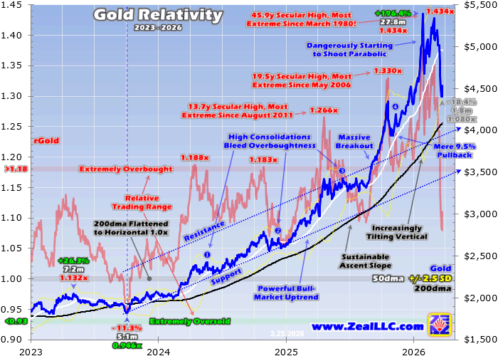 Gold's War DisconnectAdam Hamilton Gold's performance during Trump's Iran war has been quite ugly, worrying traders. Usually geopolitical shocks boost gold, and effectively shutting down the world's most-important oil-and-LNG artery could be the biggest of our lifetimes. Yet gold's war disconnect has really mounted, selling off hard despite soaring risks of serious global economic consequences including resurgent inflation. So what gives in this anomaly? On the eve of Trump going to war with Iran on February's final trading day, gold rallied 1.2% to $5,257. That was only 2.5% under late January's record peak, and spirits were high in precious-metals land. That was evident in the leading GDX gold-stock ETF rallying 1.7% to a record close of $115.84. Gold stocks act like a gold sentiment gauge. Gold-ETF holdings were also climbing as American stock investors chased. That day the combined holdings of the globally-dominant US GLD, IAU, and GLDM gold ETFs edged up 0.2% to 1,802.7 metric tons which was a 5.3-year secular high. While potential US military action against Iran had been speculated about for some time, negotiators from both countries met in Geneva that day discussing Iran's nuclear program. So an imminent war didn't seem like a high probability as February ended. Yet the next morning, the US and Israel unleashed massive surprise airstrikes against Iran in campaigns called Operation Epic Fury and Operation Roaring Lion. The initial attack assassinated Iran's supreme leader and dozens of top government officials, and thousands of Iranian targets got struck that weekend! This frenzied new war closed the Strait of Hormuz, the most important strategic chokepoint in the world. About 1/5th of both the entire planet's crude-oil and liquefied-natural-gas supplies steam through that narrow waterway every day! And another 1/3rd of the world's seaborne fertilizer trade also transits that strait. So every day tankers, carriers, and freighters can't pass due to threats of Iranian drone, missile, mine, and autonomous-boat attacks, the global economy tilts closer to a serious recession and resurgent inflation. And Iran's threat to these critical shipping lanes just off its coast is all but impossible to counter. Iran is huge, ranking as the 17th-largest country in both area and population terms. It is also among the most-mountainous countries on Earth. Its rugged 125-mile coastline hugging the Strait has endless places to hide weapons. Iran can't fight the US militarily, but it can fight economically by keeping the Strait mostly closed. That ratchets up political pressure on Trump to wind down his war sooner rather than later, especially with US midterm elections looming. All Iran needs to do is periodically attack commercial ships to keep that threat real. Then insurers won't underwrite those expensive vessels and crews won't want to risk their lives transiting the Strait, so oil, LNG, and fertilizer won't move. This disaster ought to be fantastic for gold. When I saw that war news early Saturday February 28th, I figured gold would blast 5%+ higher when trading reopened in Asia late that Sunday New York time. Initially gold did surge to $5,420, 3.1% over its war-eve Friday close and 0.5% above late January's peak. Back in February 2022 after Russia invaded Ukraine, gold blasted up 7.5% over the next nine trading days. And this Iran geopolitical shock was far worse. Yet by the US close on Monday March 2nd, gold had retreated back to a mere 1.5% gain to $5,337. The war news was bad, with Iran responding to the endless American and Israeli airstrikes on it by attacking key oil-and-gas infrastructure in neighboring Persian Gulf countries as well as commercial vessels near the Strait of Hormuz. Despite that spiraling mess, the next day instead of rallying gold plummeted a brutal 4.5%! That was its worst down day since late January's 10.3% single-day crash right out of gold's peak. And the bad news for the world economy kept on coming. Iran attacked the world's largest LNG complex in Qatar, Saudi Arabia's largest oil refinery, and Oman's largest oil port just outside the Strait. Yet gold kept on falling on balance, with additional 1.3%, 1.8%, and 1.3% down days into mid-March. Then it got much worse! Despite moving contrary to this crazy geopolitical shock, gold was still holding above the psychologically-important $5,000 level. But last Wednesday the 18th that failed spectacularly. The initial catalyst was an Israeli airstrike on the world's largest natural-gas field by far, offshore in the Persian Gulf shared by Iran and Qatar. Later red-hot US wholesale-inflation data then a hawkish Fed exacerbated that gold selling. Gold plunged 3.6% that day, shattering $5k support. That unleashed frenzied momentum selling over the subsequent three trading days into this Monday, where gold plunged another 3.6%, 3.0%, and 2.3%! By this Tuesday, gold had collapsed 16.3% month-to-date to just $4,402! Considering soaring global energy and food prices for months or years to come due to the Strait's closure, gold's March performance was dismal. That counter-geopolitical-shock plunge has unleashed torrents of bearishness, with gold's secular bull and even safe-haven status increasingly questioned. But gold's war disconnect isn't some paradigm shift, just the consequence of festering extreme overboughtness. Gold's falling March action is actually so bullish we started redeploying in great mid-tier and junior gold miners this month as their stock prices plunged! This chart puts everything in context. It superimposes gold and its key technicals over a construct called Relative Gold that measures overboughtness. It simply divides gold's closes by their 200-day moving average, with the resulting rGold multiples showing where gold is trading relative to that key baseline. Gold exited February still overdue for a serious big-and-fast selloff, which the Iran war likely moderated some. Gold's late-January record peak was truly ex