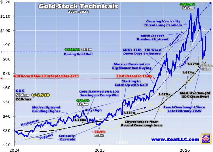 Gold-Stock Green ShootsAdam Hamilton The violent gold-stock swings in these past couple months have been breathtaking. This wild sector crashed, soared to records, cratered, then surged again, whipsawing jarringly. But this tempestuousness looks to have paved the way for another nice run higher. Fittingly with spring underway, gold stocks are showing technical, seasonal, and fundamental green shoots. They have real potential to grow into big gains. For speculators who crave action, it's hard to beat gold stocks' year-to-date roller coaster. From its final close of 2025 into late January, the dominant GDX gold-stock ETF rocketed up 30.8% achieving many new all-time record highs. That blistering run stretched GDX an all-time-record 67.4% above its baseline 200-day moving average, the most extreme overboughtness it has ever witnessed! Then gold stocks crashed. GDX plummeted 17.6% into early February, including a single soul-crushing 12.7% down day which was this benchmark's 7th-worst ever! But gold stocks did a hard turn-one-eight out of that, soaring 25.3% into the end of that month reaching still more new record closes. Then through much of March, heavy selling returned with a vengeance as GDX cratered 30.8%! Such compressed big-and-fast swings are quite unusual. Yet despite such brazen whipsawery, GDX was still up 11.9% year-to-date as of midweek trouncing the S&P 500's 3.9% loss. And the relentless selling in March including huge 8.8%, 6.1%, 6.3%, and 5.9% down days went far in rebalancing away preceding greedy herd sentiment. So gold stocks look more bullish today than they have in over a year! We started redeploying in great smaller ones several weeks ago. Gold stocks' green-shoot bullish case today is three-pronged, technical, seasonal, and fundamental. Yet as usual it all depends on gold. Last week I wrote an essay analyzing gold's war disconnect. The upshot was gold's own brutal selloff in mid-March resulted from festering extreme overboughtness in February, not Trump's Iran war. The latter is quite bullish for gold, baking in much-higher inflation and lower stock markets. And regardless of overwhelming US military superiority, Iran can use its endless asymmetric-warfare capabilities to continue greatly retarding the critical flow of shipping through the Strait of Hormuz almost indefinitely. Each passing week of drastically-pinched traffic including crucial crude oil, LNG, fertilizer, helium, sulfur, and aluminum from the Persian Gulf ratchets up this snowballing global economic crisis. So gold sure ought to continue grinding higher on balance as this serious quagmire drags on. And gold stocks will leverage its gains like usual. But if gold instead rolls over into a bear market for some reason, the miners will be pounded lower. Generally the majors in GDX tend to amplify material gold moves by 2x to 3x. This gold-stock green-shoot thesis is strong, but hinges on gold behaving and generally rallying. Starting with technicals, check out this GDX chart of recent years. Through 2024 and much of 2025, GDX was climbing with its metal in a modest uptrend. But starting in early August last year, GDX took off like a rocket establishing a much-steeper one. That was shattered in mid-March 2026, as gold stocks plummeted near their 200dma before staging a neck-snapping V-bounce. This setup is looking surprisingly bullish.