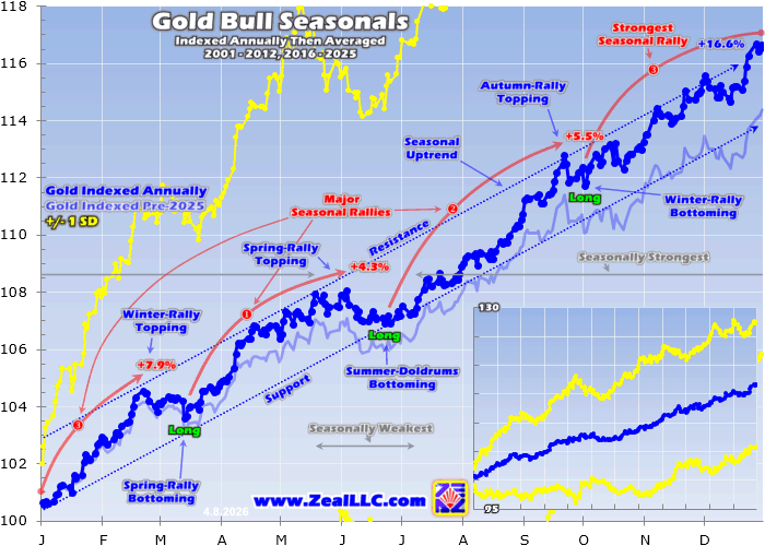 The huge range of gold levels spread over all those long years has to first be rendered in like-percentage terms in order to make them perfectly comparable with each other. Then they can be averaged together to distill out gold's bull-market seasonality. That's accomplished by individually indexing each calendar year's gold price action to its final close of the preceding year, which is recast at a common indexed baseline. I've always used 100 which makes subsequent gains easy to parse. From that, all gold action of the following year is recalculated which normalizes all years to the same simple scale. For example gold trading at 110 simply means it has rallied 10% from the prior year's close. Gold's current seasonality from 2001 to 2012 and 2016 to 2025 is rendered in dark-blue, with its prior year's pre-2025 data in light-blue.