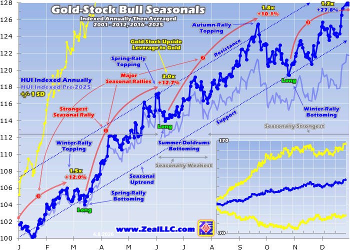 From 2001 to 2012 and 2016 to 2025, gold stocks' best months on average are November, May, August, and April. The HUI has averaged 4.1% gains in November for 2.0x upside leverage to gold, 3.7% in May for a whopping 4.4x, 3.2% in August for 1.8x, and 3.1% in April for 1.7x. Gold stocks' spring rally grows in April, but tends to really explode in May! Thus there's probably still time to get deployed if you aren't yet. In three weeks since that GDX-bottoming week in mid-March, we've added eight new mid-tier and junior gold-stock trades in our weekly newsletter. These excellent miners are all fundamentally-superior, with great production growth coming this year and beyond due to new mine expansions, new mines ramping up, and acquisitions. They should really outperform the far-larger GDX majors as gold continues forging higher. I love this high-performance sector, and have been intensely studying and actively trading it for over a quarter-century now. Since founding this business in 2000, we've realized 1,621 newsletter stock trades as of the end of 2025. Their average annualized realized gains including all losers has shaken out to a phenomenal +20.4%! That's great-hedge-fund-grade, more than double the long-term stock-market average. While most of those buy-relatively-low trade entries relied heavily on favorable technicals, sentiment, and fundamentals, seasonals also played a role. I would never trade solely on seasonals since they are only a secondary driver, like tailwinds or headwinds. But when strong seasonals align with bullish primary drivers, they do increase gold stocks' likelihood of achieving outsized gains. That's certainly the case today. Successful trading demands always staying informed on markets, to understand opportunities as they arise. We can help! For decades we've published popular weekly and monthly newsletters focused on contrarian speculation and investment. They draw on my vast experience, knowledge, wisdom, and ongoing research to explain what's going on in the markets, why, and how to trade them with specific stocks. Our holistic integrated contrarian approach has proven very successful, and you can reap the benefits for only $12 an issue. We extensively research gold and silver miners to find cheap fundamentally-superior mid-tiers and juniors with outsized upside potential. Sign up for free e-mail notifications when we publish new content. Even better, subscribe today to our acclaimed newsletters and start growing smarter and richer! The bottom line is gold stocks usually experience a strong spring rally seasonally. This is driven by gold's own seasonality, where outsized investment demand arises at certain times during the calendar year. Gold usually enjoys a solid spring rally likely fueled by the universal optimism this season brings. And since gold drives its miners' profitability, their stock prices naturally follow gold higher amplifying its gains.