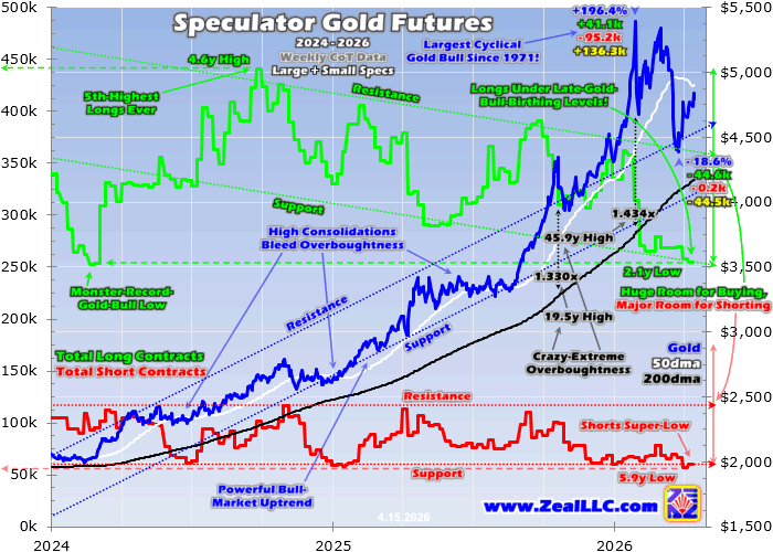 After spending decades studying gold-futures trading's impact on gold prices, I would've thought today's situation impossible. As of the latest-reported CoT current to Tuesday April 7th, total specs longs are running just 254.5k contracts. That was just a hair above their monster-record-gold-bull low of 252.9k way back in mid-February 2024, and well under the 264.8k in early October 2023 birthing this gold bull at just $1,820! This is such an extreme anomaly I struggled to believe it for weeks, wondering if there was some problem with CoT data. But if those ever happen, they quickly work themselves through in subsequent CoTs. Last Tuesday gold remained 158.6% above bull-launching levels, yet total spec longs had collapsed back to 3.9% lower! Trying to comprehend such sorcery, one thesis is far-higher gold prices limit gold-futures trading. The risks inherent in gold-futures trading trounce most other markets. At 14x leverage, a mere 7.1% gold move against bets wipes out 100% of capital risked. And as we've seen in spades in recent months, gold can swing 7%+ in a few days without breaking a sweat. So the number of gold-futures traders is quite small relative to broader markets, controlling quite-finite pools of capital. Does higher gold mean fewer contracts? Maybe, but much evidence is to the contrary. For example in late September 2025 while gold soared to $3,763 for the first time in history, spec longs swelled to 390.5k contracts. That was closing in on their many-years-old upper-resistance zone around 413k contracts. Yet when spec longs first exceeded 390k in that late gold bull in mid-June 2024, gold was only running $2,465. So gold 53% higher, yet spec longs the same! A way-more-likely explanation of waning spec longs as gold soared is the remarkable nature of that late bull. American gold-futures speculators' and American stock investors' long-established leading roles in fueling major bulls were usurped by massive global demand as gold powered higher. That was dominated by central banks, Chinese speculators and investors, and Indian investors and gold-jewelry buyers. I've analyzed this extensively in our newsletters in recent years, but consider an illustrative example. In 2025 gold skyrocketed an astonishing 64.3%! Yet net spec gold-futures buying was negligible, they added a tiny 5.5k longs and a trivial 1.6k shorts for minuscule gold-equivalent buying of 12.3t. And the easiest way to measure American stock investors' gold buying is through the world-dominant US gold ETFs' holdings. Last year the combined bullion held by GLD, IAU, and GLDM climbed 372.1t utterly dwarfing gold-futures buying. The World Gold Council publishes the best-available global gold supply-and-demand data quarterly in its fantastic Gold Demand Trends reports. According to the WGC, overall global gold-ETF demand weighed in at 801.2t in 2025 including that GLD+IAU+GLDM buying which declined to just 46% of it. In some past major-gold-bull years, GLD+IAU+GLDM accounted for nearly all and sometimes more of overall worldwide gold-ETF demand! In 2025 global central-bank demand weighed in at 863.3t, far bigger than both US gold-futures and US gold-ETF demand combined. And in China and India last year, total consumer demand including both bullion and jewelry ran a hefty 830.3t and 710.9t both dwarfing US buying. So the gold-price-moving importance of leveraged American gold-futures trading hasn't vanished, it has just been wildly overshadowed by enormous global gold demand. If specs flood back into gold futures from current astounding lows, that would almost certainly again catapult gold higher. 14x leverage for 14x the gold-price impact remains incredibly potent. Today's really-low spec longs are very bullish for gold. If something motivates specs to start chasing gold again, they now have room to do an enormous 158.5k contracts of long buying before returning to their 413k resistance. That rivals the 176.2k contracts of spec long buying at best within gold's late monster bull, and is the equivalent of another 493.0t of gold buying. I don't know if speculators will resume chasing gold in such uncharted territory, but they have vast room to. These super-leveraged speculators have been more likely to add to their upside bets when gold is rallying but not rocketing. Soaring too high too fast greatly ups the odds of a big-and-fast rebalancing selloff, which can be an existential threat to gold-futures traders wielding maximum leverage. So spec longs blasted higher in Q3'24 as gold rallied, but plunged in early October 2025 as gold threatened to shoot parabolic. The rest of 2026 looks way more modest for gold compared to 2025, and thus more gold-futures-friendly. There's no way gold is going to skyrocket another 2/3rds this year, and is just recovering from that recent serious correction last month. If gold rallies a far-more-normal 10% to 20% in 2026, we'd be looking at year-end levels from $4,744 to $5,175. Such way-less-risky gradual advancing could convince specs to return. Last week in my essay on gold stocks' spring rally, I included a gold-seasonals chart. In all modern bull-market years since 2001, or fully 22 of these last 25 years, gold has averaged very-impressive 16.6% annual gains. Something more along those lines this year could easily entice speculators to flood in and normalize their really-low longs, accelerating gold's recovery. I suspect that will indeed come to pass. While total spec longs now running just 0.9% up into their late monster record gold bull's trading range is very bullish for the yellow metal, the current super-low shorts sure aren't. Weighing in at just 60.7k contracts last Tuesday, that is only 3.5% up into their own similar trading range. And the CoT week before they had sunk to a deep 5.9-year low of 56.6k! So specs also have lots of room to aggressively short sell. While upper resistance of total spec shorts in recent years is around 115k contracts, those downside bets could concei