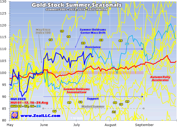 Gold Stocks Priming to RunAdam Hamilton The gold miners' stocks are priming to run, nearing their next major surge higher. They've proven quite resilient this summer through gold's weakest time of the year seasonally. They're about to report their best quarterly results ever by far. They remain very undervalued relative to prevailing gold prices. And gold is heading into its strong autumn-rally season. All this converging ought to fuel increasing gold-stock buying. Though gold stocks continue to fly under most radars, they're having a great year. As of midweek the dominant GDX gold-stock ETF has soared 52.8% year-to-date! That is amplifying gold's own huge 27.6% YTD gain at 1.9x, nearing major gold stocks' historical leverage range to their metal of 2x to 3x. While this sector tends to weaken in June during gold's summer doldrums, gold stocks have proven very resilient. This chart is updated from my latest gold-summer-doldrums essay in late May. It reveals how gold stocks have behaved through all modern gold-bull-year summers. The classic HUI gold-stock index replaces GDX here, as the latter hasn't been around long enough for this secular seasonality research. But with essentially the same major holdings, these older and newer benchmarks are functionally interchangeable. To ensure each summer's gold-stock price action is perfectly comparable, all are indexed to the HUI's final May closes which are set at 100. A level of 105 for example indicates gold stocks have rallied 5% from pre-summer levels. Past gold-stock summers are rendered in yellow and all averaged together in red. Last year's action is light-blue, while 2025's good summer-to-date performance is shown in dark-blue.