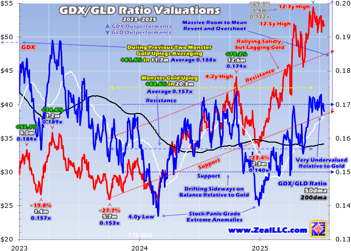 GDX's 110.2% gains at best so far in gold's mighty cyclical bull sound good, and are evident in its strong 2025 surge. My first essay published this year as January dawned explained why 2025 would finally be gold stocks' revaluation year. That thesis has certainly proven right through this year's first-half, but gold stocks have lots of rallying left to go. Relative to gold, their advance effectively stalled out exactly a year ago. In the early months of gold's monster upleg, gold stocks fell way behind their metal. Back in late 2023 and early 2024, gold's early gains were overshadowed by the AI stock bubble stealing all the limelight. So with surging gold mostly ignored, gold stocks languished. The GGR was running 0.156x when gold's bull was born in early October 2023, then plunged to a deep 4.0-year low of 0.137x in late February 2024! That was an extreme stock-panic-grade anomaly, wildly unsustainable which I warned about at the time. That very week I concluded my essay with "Excessive selling has slammed GDX way back down to early-October levels when today's gold upleg was born. Yet that makes zero sense fundamentally with gold remaining about 12% higher. ... [Gold stocks] are due to soon mean revert sharply higher with gold." Indeed gold stocks soon started soaring, mean reverting hard. Over the next 4.6 months into mid-July 2024, GDX blasted up 52.3% outperforming enough to drive the GGR back up to 0.172x! But ever since then, upper resistance for this leading gold-stock ETF has stuck around 0.17x the dominant gold one. All attempts for an upside breakout above that soon failed in the next several months, gold stocks largely stalled. But rather amazingly considering gold stocks' typical listlessness during gold's summer doldrums, GDX is priming for a major GGR breakout. Through all of June and July to midweek, the GGR has averaged 0.170x which is right at its resistance during this mighty gold bull! It won't take much buying to push gold stocks higher faster than gold, achieving the GGR's first new higher territory in a year. That breakout is nearing. Since gold stocks have seriously underperformed gold throughout its mighty cyclical bull, they have lots of room to run much higher. During gold's 88.6% monster upleg into mid-June, the GGR merely averaged 0.157x. To put this in perspective, gold's last two 40%+ monster uplegs both crested in 2020 averaging 41.4% gains over 11.7 months. While great, those were less than half the size of today's goliath specimen. Yet during their entire lifespans, the GGR averaged 0.188x! That's 19.7% higher than during today's bull, and merely an average. Half the time during those previous gold bulls, the GGR was higher. And the best GGR levels seen during gold bulls happen as they are maturing. That's when gold stocks really soar as retail investors' greed mounts and they increasingly flood in to chase this sector's strong upside momentum. As investors have been skeptical on gold stocks for gold's entire mighty cyclical bull, the last time their greed really flared was in mid-summer 2020 as gold's last monster upleg crested. During the month surrounding its topping in late July and early August, the GGR averaged 0.230x! It will almost certainly return to those levels as retail investors resume chasing, and likely go higher since gold's upleg is so epic. At current gold prices, a 0.230x GGR would catapult GDX up near $71. That's 37% higher than today's levels, and would extend major gold stocks' total run during gold's mighty cyclical bull to 174%. That is still just the bottom of their usual 2x-to-3x amplification range, which again implies GDX soaring by 177% to 266% based on gold's gains so far. And this is conservative since gold itself is likely heading much higher. I analyzed why in my essay last week on gold chasing mounting, revealing American stock investors' differential gold-ETF-share buying really accelerating. Despite the still-festering AI stock bubble, they are starting to realize it is prudent to diversify their mega-cap-tech-dominated portfolios with gold. And this is only starting, as American stock investors' implied portfolio allocation to gold is only running a trivial 0.3%! American gold-futures speculators' overall positioning also remains quite bullish for gold, they have lots of room to buy hyper-leveraged longs accelerating gold's upside. While no one yet knows how high gold will run, $4,000 is the next major psychological milestone. That's just 19.5% above midweek levels, not much of a stretch. That would drive GLD shares up near $368, implying GDX challenging $85 near a 0.230x GGR. That would grow GDX's total gold-bull gains to 227%, more than doubling the 110% at best so far! And if gold continues powering higher on balance up near $4,000, odds are that would spark frenzied gold-stock buying either resembling or actually being a popular speculative mania. In that case the GGR would soar way higher. There's lots of precedent for that, recent years' GGR levels have been really low relative to history. Ever since GDX was born in mid-May 2006, the GGR has actually averaged 0.275x. At GDX's all-time closing high of $66.63 seen way back in September 2011, the GGR was running 0.366x. And its record is way up at 0.664x in early September 2006. With prevailing gold prices rising so radically since then, it'll never return to those heights. But a 0.300x-ish GGR seems quite probable when gold stocks' popularity peaks. Plug that into $4,000 gold, and that yields a potential GDX target over $110! Gold miners' massive and consistent earnings growth certainly supports way-higher stock prices. And these companies soon reporting their best quarter ever by far in coming weeks should really help build awareness of their epic fundamentals. So gold stocks are really priming to run again, which should start soon if gold breaks out. Since soaring to crazy-overbought extremes in mid-April, gold has been mired in a high consolidation in recent mo