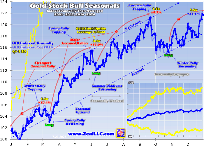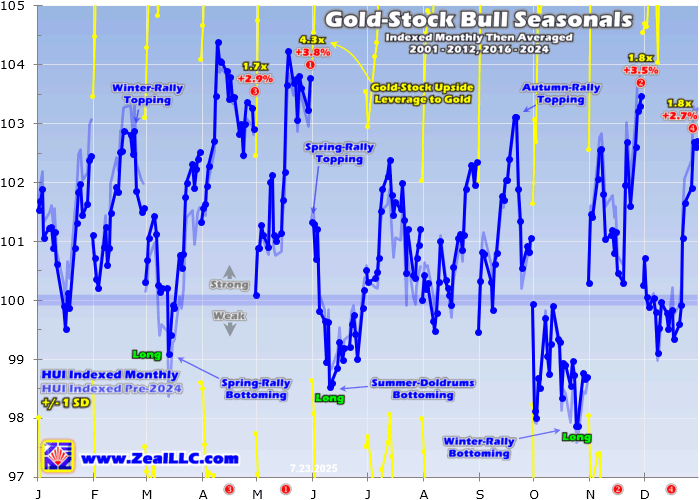 This autumn-rally span doesn't include gold stocks' strongest months seasonally, which have been May, November, April, and December. But the distribution of gains from June to September is interesting. On average during these modern gold-bull years major gold stocks edged up 0.2% in June, climbed 1.2% in July, rallied 2.4% in August, and surged another 3.1% into late September at that average autumn-rally topping! Because of that self-reinforcing momentum-chasing dynamic, gold-stock gains accelerate later in any meaningful rally, upleg, or bull. Again the more gold stocks rally, the more traders want to buy them. So historically nearly 2/3rds of this sector's autumn-rally gains come in August and September up to that seasonal topping! Based on decades of precedent, odds are the best of today's autumn rally is still yet to come. We've been preparing for this by refilling our newsletter trading books with great fundamentally-superior mid-tier and junior gold stocks over this past month or so. They well-outperform the majors during gold bulls, better able to consistently grow their production from lower bases often at lower mining costs. After a quarter-century-plus intensely studying and actively trading smaller gold stocks, we've achieved much success. In the first half of 2025, we realized 34 mostly-gold-stock trades in our newsletters averaging nice +40.7% annualized gains. Much-bigger ones are coming as gold stocks resume powering higher. Last year we realized 84 stock trades averaging annualized realized gains of +43.1%. That utterly trounced GDX, which terribly lagged gold only rallying 9.4% in 2024! Gold stocks' mid-summer drift is a good time to add positions. Successful trading demands always staying informed on markets, to understand opportunities as they arise. We can help! For decades we've published popular weekly and monthly newsletters focused on contrarian speculation and investment. They draw on my vast experience, knowledge, wisdom, and ongoing research to explain what's going on in the markets, why, and how to trade them with specific stocks. Our holistic integrated contrarian approach has proven very successful, and you can reap the benefits for only $10 an issue. We extensively research gold and silver miners to find cheap fundamentally-superior mid-tiers and juniors with outsized upside potential. Sign up for free e-mail notifications when we publish new content. Even better, subscribe today to our acclaimed newsletters and start growing smarter and richer! The bottom line is gold and its miners' stocks are nicely set up to achieve big autumn-rally gains this year. This seasonal strength has tended to run from mid-June to late September, historically driven by outsized Indian gold demand. But this year that is likely to be augmented or overshadowed by mounting gold-ETF buying from American stock investors. American gold-futures speculators also still have much room to chase. Gold stocks will rally with gold, amplifying its gains in coming months. Yet they are also about to report their best quarterly results ever by far, which should pique interest among institutional investors. Fund capital inflows on fantastic fundamentals could easily force this small sector to outperform gold way more than usual. Once gold stocks really start running, they tend to attract in more traders accelerating gains. ### Jul 25, 2025 Thoughts, comments, or flames? Fire away at zelotes@zealllc.com. Due to my staggering and perpetually increasing e-mail load, I regret that I am not able to respond to comments personally. I will read all messages though and really appreciate your feedback! |