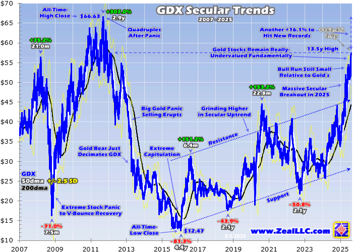 GDX Record-High WatchAdam Hamilton The dominant gold-stock benchmark is closing in on all-time-record highs. With the last one witnessed an astounding 14 years ago, the next will be a momentous sector milestone. New records will attract much attention to gold stocks, accelerating capital inflows to chase their strong upside momentum. The miners' epic record fundamentals support way-higher stock prices, and they've way underperformed gold's mighty bull. The GDX VanEck Gold Miners ETF remains this sector's leading yardstick and trading vehicle. Launched way back in mid-May 2006, it has parlayed its first-mover advantage into an insurmountable lead. GDX's net assets midweek ran $16.8b, fully 10.1x larger than its next-biggest similar competitor! When almost any market participants monitor, analyze, or discuss gold stocks, their performance is viewed through the GDX lens. Now reporting their best quarterly results ever by far thanks to Q2'25's amazing record gold prices, gold stocks are enjoying a great week. This Monday, Tuesday, and Wednesday GDX surged 4.7%, 2.8%, and 1.6%. That made for a hefty 9.4% three-day gain, wildly outperforming the metal driving gold miners' enormous profits. Gold edged up a trivial 0.3% in that span, making for extreme GDX upside leverage of 33.7x! Normally the major gold stocks dominating this benchmark ETF amplify material gold moves by 2x to 3x. That's been the case year-to-date, with GDX soaring 69.2% as of Wednesday to gold's awesome 28.4% gain for solid 2.4x upside. What really caught my attention this week is GDX achieved three new secular-high closes in a row, the first time that happened since mid-April when upside momentum was very strong. This implies sector sentiment is really shifting bullish, attracting more speculators and investors to gold stocks. The more they rally, the more bullish financial-media coverage that generates really expanding interest. The more that attracts traders to deploy capital to chase these mounting gains, the more gold stocks rally. This powerful virtuous circle of buying begetting buying should soon catapult GDX to new records. I don't run super-long-term charts very often, but with GDX on record-high watch it is certainly appropriate now. This encompasses the vast majority of GDX's entire history, starting with its first full calendar year of trading in 2007. This leading gold-stock benchmark has surged so close to new-record territory that all it will take to punch through is a handful of big up days. Getting there will accelerate gold stocks' bullish shift.