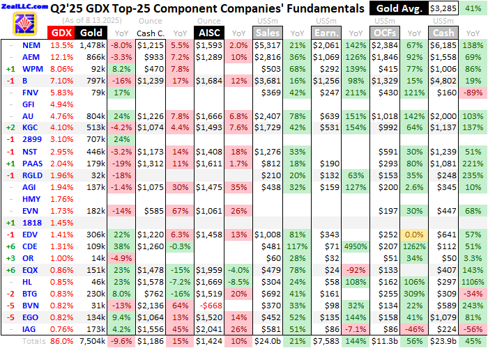 Gold Miners' Q2'25 FundamentalsAdam Hamilton Gold miners just finished reporting their best quarterly results ever. Mainly thanks to amazing record gold prices, its miners achieved epic record revenues, record unit profits, record bottom-line earnings, and record operating cashflows. Last quarter proved gold miners' eighth in a row of huge mostly-high-double-digit profits growth. Gold stocks remain seriously undervalued relative to this awesome fundamental backdrop. The GDX VanEck Gold Miners ETF remains this sector's dominant benchmark. Birthed way back in May 2006, GDX has parlayed its first-mover advantage into an insurmountable lead. Its $17.1b of net assets mid-week dwarfed the next-largest similar competitor ETF's by over 10x! GDX is undisputedly the trading vehicle of choice in this sector, with the world's biggest gold miners commanding most of its weighting. Gold-stock tiers are defined by miners' annual production rates in ounces of gold. Small juniors have little sub-300k outputs, medium mid-tiers run 300k to 1,000k, large majors yield over 1,000k, and huge super-majors operate at vast scales exceeding 2,000k. Translated into quarterly terms, these thresholds shake out under 75k, 75k to 250k, 250k+, and 500k+. Those two largest categories account for nearly 56% of GDX. The majors are enjoying a banner 2025, with GDX soaring 71.2% year-to-date! That has amplified gold's parallel upside by 2.6x, getting higher in major gold stocks' usual historical range of 2x to 3x. And that's part of a bigger 124.7% bull run stretching back to early October 2023, when gold's mighty cyclical bull was born. That has catapulted the yellow metal 88.6% higher at best so far, without a single 10%+ correction! Yet gold stocks have really underperformed during that span, with GDX only hitting 1.4x upside leverage. The main reason is likely the AI stock bubble enthralling and distracting investors, leaving everything else languishing in its towering shadow. But gold stocks are increasingly catching up, and GDX is actually on all-time-record-high watch. Its first record close in a shocking 13.9 years is merely 14.7% above midweek levels! For 37 quarters in a row now, I've painstakingly analyzed the latest operational and financial results from GDX's 25-largest component stocks. Mostly super-majors, majors, and larger mid-tiers, they dominate this ETF at 86.0% of its total weighting! While digging through quarterlies is a ton of work, understanding the gold miners' latest fundamentals really cuts through the obscuring sentiment fogs shrouding this sector. This table summarizes the operational and financial highlights from the GDX top 25 during Q2'25. These gold miners' stock symbols aren't all US listings, and are preceded by their rankings changes within GDX over this past year. The shuffling in their ETF weightings reflects shifting market caps, which reveal both outperformers and underperformers since Q2'24. Those symbols are followed by their current GDX weightings. Next comes these gold miners' Q2'25 production in ounces, along with their year-over-year changes from the comparable Q2'24. Output is the lifeblood of this industry, with investors generally prizing production growth above everything else. After are the costs of wresting that gold from the bowels of the earth in per-ounce terms, both cash costs and all-in sustaining costs. The latter help illuminate miners' profitability. That's followed by a bunch of hard accounting data reported to securities regulators, quarterly revenues, earnings, operating cash flows, and resulting cash treasuries. Blank data fields mean companies hadn't disclosed that particular data as of the middle of this week. The annual changes aren't included if they would be misleading, like comparing negative numbers or data shifting from positive to negative or vice-versa. With last quarter's average gold prices blasting up 40.6% YoY to a stunning record $3,285, gold miners' Q2'25 results were destined to be stellar! And they certainly didn't disappoint, stacking countless records like I predicted in my Q2'25-results preview in late June. Major gold miners' fundamentals have never been stronger, arguing for much-higher gold-stock prices as investors increasingly grow aware of all this.