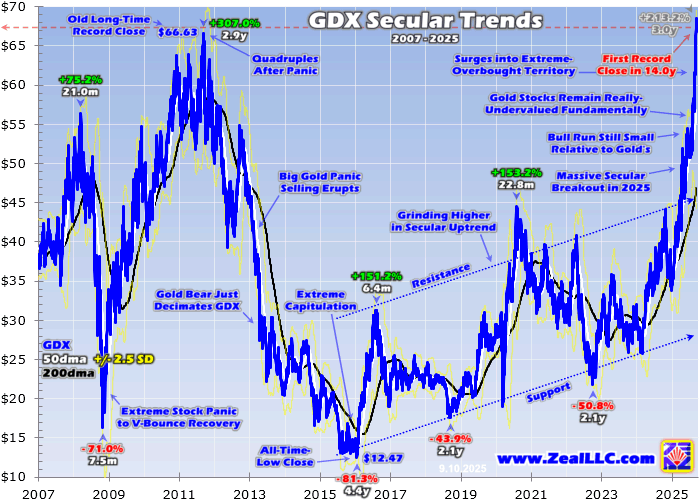 GDX Finally Bests Records!Adam Hamilton The dominant GDX gold-stock ETF finally bested its last record close, which was seen an astonishing 14 years ago! Gold stocks forging back into record territory will fuel much bullish financial-media coverage and trader interest, leading to more buying. And this record breakout still remains earlier in gold stocks' revaluation way higher, as miners' fundamentals are radically better today than they were 14 years ago. Seemingly an eternity ago in early September 2011, the GDX gold-stock ETF surged to an all-time-record high of $66.63 capping a magnificent 307.0% secular bull over 2.9 years! Gold stocks quadrupling earned fortunes for contrarians, then like after all bull markets a bear one followed. It was normal until April 2013, when a gold panic erupted as key multi-year support at $1,550 failed spawning brutal cascading selling. When the dust finally settled in mid-January 2016, GDX had collapsed a catastrophic 81.3% across 4.4 years to its all-time low of $12.47! That anomalous disaster left gold stocks one of the most-hated sectors in all the markets. Gold stocks did start marching higher out of that, with GDX achieving nice 151.2% and 153.2% bull runs into early August 2016 and early August 2020. But gold stocks still remained largely ignored. Part of the reason was their prices languished way under record levels despite gold achieving many new record closes of its own starting in early December 2023. Historically the major gold stocks of GDX tended to amplify material gold moves by 2x to 3x. Gold stocks need to outperform their metal in order to compensate traders for their big additional operational, geological, and geopolitical risks on top of gold price trends. While gold miners' profits soared reflecting gold's mighty bull run born in early October 2023, their stock prices didn't. In 2024, gold blasted 27.2% higher yet GDX dreadfully lagged merely rallying 9.4%! Gold stocks looked hopelessly broken, so out of favor that investors would never return. But stock prices always eventually reflect underlying fundamentals, so that gold-stock undervaluation anomaly couldn't last long. My first essay this year written as January dawned was called "Gold Stocks' Revaluation Year". In it I concluded, "The bottom line is 2025 has great potential for gold stocks to enjoy a major-paradigm-shift revaluation higher. Gold just experienced one last year, which gold stocks greatly lagged. ... That makes gold miners' fat-and-rich profits durable, leaving their stocks deeply undervalued." That deviation had to be resolved. I continued "Fund managers will increasingly notice that, and start upping their tiny allocations. The resulting gold-stock gains will turn psychology bullish again, fueling increasing buying normalizing prices." Boy that has proven true in spades. Year-to-date as of midweek, GDX has skyrocketed up 102.0% to gold's huge parallel 38.7% gain! That makes for normal 2.6x leverage as gold stocks revalue way higher. But since gold stocks aren't a widely-followed sector, they really needed bullish financial-media coverage to build trader interest. That was been mounting all year with GDX's massive gains, but new record highs would supercharge it. Records have always fascinated both market commentators and traders. Just this Monday, GDX's $67.24 close was its first record achieved in fully 14.0 years since early September 2011! But at just 0.9% higher, that wasn't yet decisive. Breakouts need to extend 1%+ beyond previous highs to become decisive, lowering the odds of multiple tops. GDX smashed that decisive-breakout threshold surging 2.5% to $68.50 this Wednesday. That was 2.8% better than early September 2011's old record, leaving no doubt. The gold stocks have finally bested their old record that stood for a staggering 14 years! Think of how long that is. Assuming an average investor starts around 25 years old and retires around 65, that's a 40-year investing lifespan. GDX's extreme record-less span consumed fully 35% of that! Try to remember what your life was like 14 years ago, how old your kids were and what your family's major activities were way back then. My wife and I had our firstborn earlier in 2011, which sure feels forever ago. This secular chart encompasses nearly the entire history of GDX, which was launched in mid-May 2006. The vast gulf between its last record closes and this week's is glaringly apparent. GDX forging back into record territory changes everything, dramatically shifting gold-stock psychology. The financial media loves bullishly covering new records and traders love chasing sectors achieving them, fueling big capital inflows.